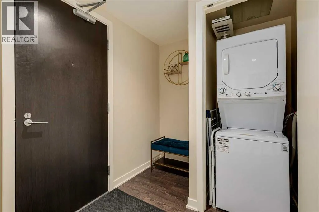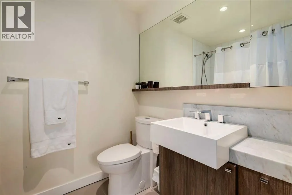 Perched on the 9th floor with sunny south and east views of the downtown core and the sunny south towards the Elbow river, this corner unit is a must see. Calla is a long-time favourite in the Beltline for its location and walkability to downtown and 17 Avenue. This 2-bedroom, 2-bathroom layout is a favourite in the building as it is one of the largest floorplans in the building and rarely these style units come available. This best part about this unit is the layout offers flexibility to either have your living space by the patio, or dining space by the island or by the patio. With 961 square feet, large windows, and consistent sun exposure. It is an ideal space for someone who enjoys everything inner city life has to offer. As you enter this floorplan foyer creates a defined entry away from the main living area. The open concept living space is functional and bright. Floor to ceiling windows showcase the downtown skyline which can be enjoyed both day and night. Dark espresso laminate floors pair with the kitchen, which features a large quartz island and well-appointed storage. The kitchen flows to the dining and living areas and opens to a private SE balcony with room to relax as well as space for a barbecue. The two bedrooms sit on opposite sides of the unit, which is an ideal layout. The primary bedroom has a walkthrough closet and a 4-piece ensuite with a stand-up shower and soaker tub. The second bedroom is spacious and works well as a bedroom, office or flex room. A walk-through closet connects to a 3-piece bath. In suite laundry and strong storage complete the interior. This unit has had some recent updates which include fresh paint, new carpet, new washer/dryer, upgraded faucets, central AC and more. Calla provides great amenities such as concierge, a fitness room, yoga space, sauna, guest suite, bike storage, and visitor parking plus secure storage rooms on the same floor as the unit. One titled parking stall is included. This home is ideal for singl es or professional couples who want inner city convenience and to be in the heart of walkable accessibility to everything you need. (id:27476)
