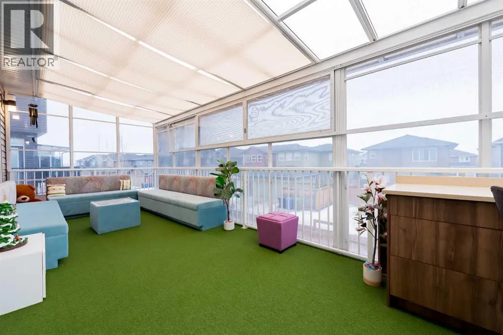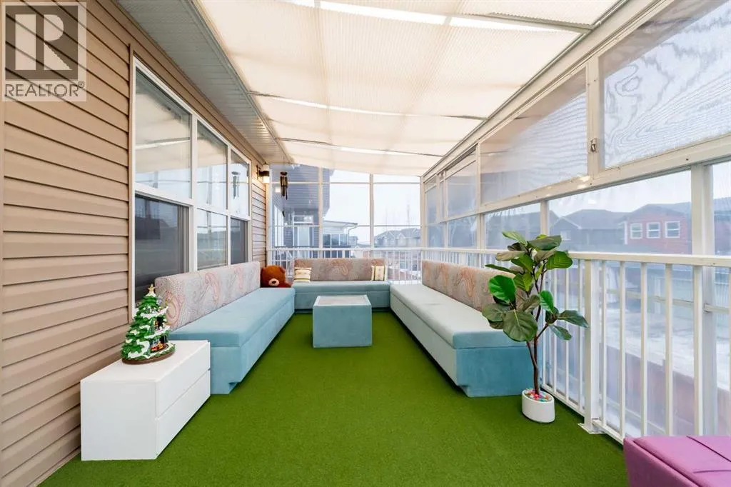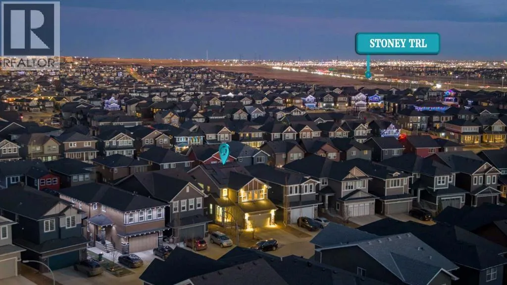 **Fully developed with a walkout basement, approximately 3,300 sq. ft. of total developed living space, two three-season sunrooms (approx. 450 sq. ft.), a 6.4 kW solar panel system (16 panels), a 200-amp electrical panel, epoxy flooring in the garage, and low-maintenance artificial turf in the backyardâfeatures like these are rarely found at this price point**. Welcome to this beautifully upgraded home in the highly sought-after community of Evanston, situated on a traditional 35-ft-wide lot and offering approximately 3,300 sq. ft. of fully developed living space. The main floor features a private office/den, a spacious, sun-filled living area with large windows, a dining area with custom seating, and elegant high-end laminate flooring, complemented by 9-foot ceilings. The chefâs kitchen is designed to impress, featuring quartz countertops, under-cabinet lighting, ceiling-height cabinetry, and premium stainless-steel appliances, including a Bosch built-in oven and microwave. A walk-through pantry with durable titanium wire shelving adds everyday convenience. A convenient half bath (with potential to convert to a full bath) and a three-season sunroom just off the living room complete the main level. Upstairs, a large bonus room sits centrally, thoughtfully separating the primary bedroom from the two additional bedrooms. This bonus space includes custom seatingâperfect for movie nights or family gatherings. The primary bedroom offers a walk-in closet, a luxurious 5-piece ensuite with dual sinks, a custom standing shower, and a soaker tub. Two additional well-sized bedrooms, an upper-floor laundry room, and a second full bathroom featuring dual sinks and a standing shower with a custom tile base complete the upper level. The fully developed walkout basement offers a wet bar, a four-piece bathroom, and a spacious recreation area ideal for a home theatre, gym, or playroom. A SONOS 7.1 home theatre speaker system and an electric fireplace add comfort and entertainment val ue. The walkout layout also provides excellent potential to convert the basement into a legal suite (subject to City approval). Located in the vibrant, family-friendly community of Evanston, this home offers easy access to Stoney Trail, top-rated public and Catholic schools (including a new middle school opening soon), parks, walking paths, and nearby shopping centres. Recent updates include: roof and siding (2024), new carpet (2025), and fresh interior paint (2025). A water purifier, water softener, and home theatre system are included in the sale. This home stands out not only for its luxury finishes but also for its energy-efficient upgrades. The 6.4 kW solar panel system (16 panels) significantly reduces electricity costs, offering long-term savings and protection against rising energy pricesâan increasingly valuable feature for todayâs discerning buyers. Donât miss this exceptional opportunityâbook your private showing today! (id:27476)