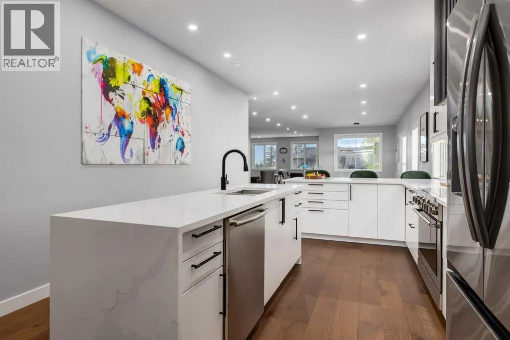 *See last 3 photos for detailed feature sheet* We are proud to present this massive, exquisitely renovated front walkout bungalow in the prestigious community of Signal Hill. Offering 4 bedrooms and 3 bathrooms, this exceptional residence showcases 2,938ft2 of total refined living space across two beautifully designed levels, including 1,596ft2 on the main floor. At the heart of the home is a truly showstopping open-concept kitchenâa space that must be experienced to be fully appreciated. Designed for both everyday living and elegant entertaining, it features a 36" induction range, expansive quartz island with eating bar, custom hood fan, pot filler, striking backsplash, and sleek new cabinetry. The primary retreat is a private sanctuary, complete with a spacious walk-in closet and a spa-inspired ensuite. Indulge in the freestanding soaker tub, oversized walk-in shower, rustic vanity, and exquisite tileworkâevery detail thoughtfully curated to create a calming, luxurious escape. Additional premium features include a heated garage, central air conditioning, modern fireplace, engineered hardwood flooring, triple-pane windows, instant hot water system, new blinds throughout including some with motors, and a high-efficiency furnace with UV air filtration. Privacy film on the windows enhances comfort without sacrificing natural light. A large, secure locked storage room in the basement is available for buyer inspection. Signal Hill has long been one of the cityâs most sought-after neighbourhoods, rich in both prestige and history. The homeâs address pays homage to the four Alberta battalions of World War I, who trained at the base of Signal Hillâan enduring legacy commemorated by the iconic geoglyphs visible from Stoney and Sarcee Trail. Enjoy breathtaking mountain views from the west-facing balcony, along with close proximity to excellent schools, effortless access downtown, and a direct route west to the Rocky Mountains. This is a rare and remarkable offeringâa true ge m in an iconic location. All permits are in place and available, including electrical, gas, plumbing, framing and engineering permits. We would be delighted to accommodate your private showing. (id:27476)