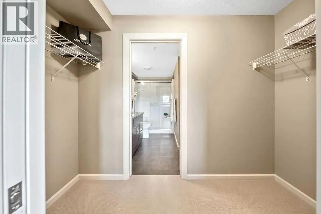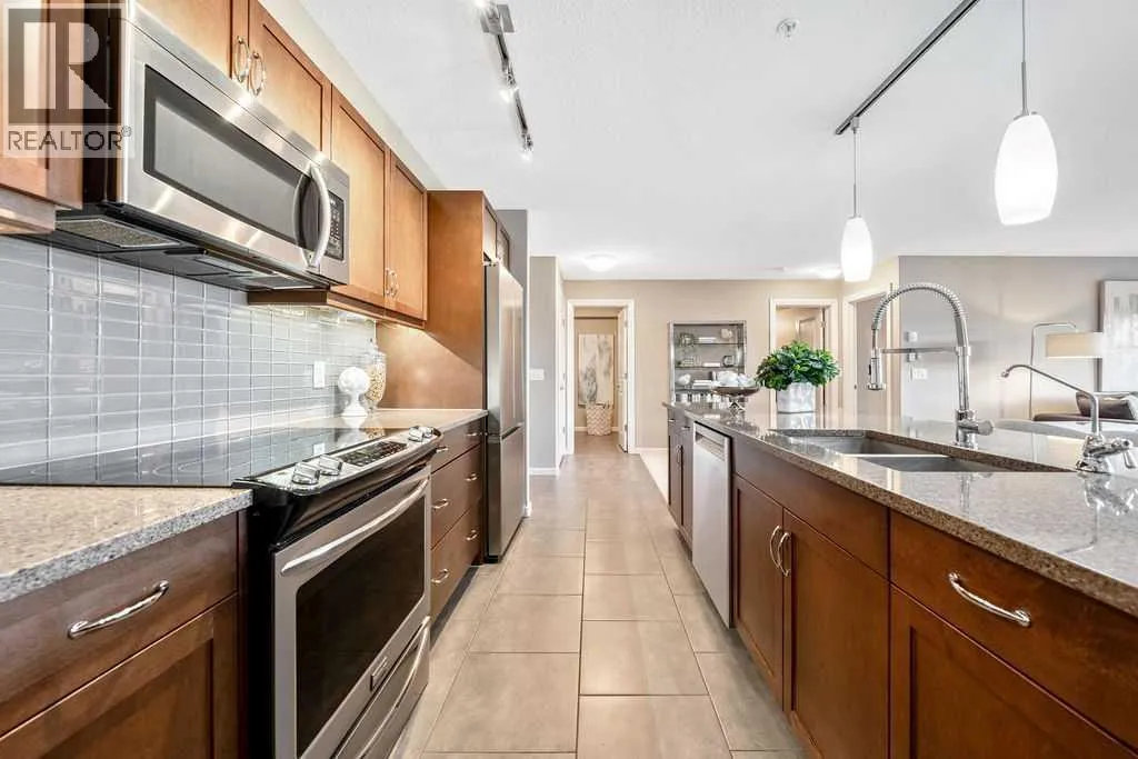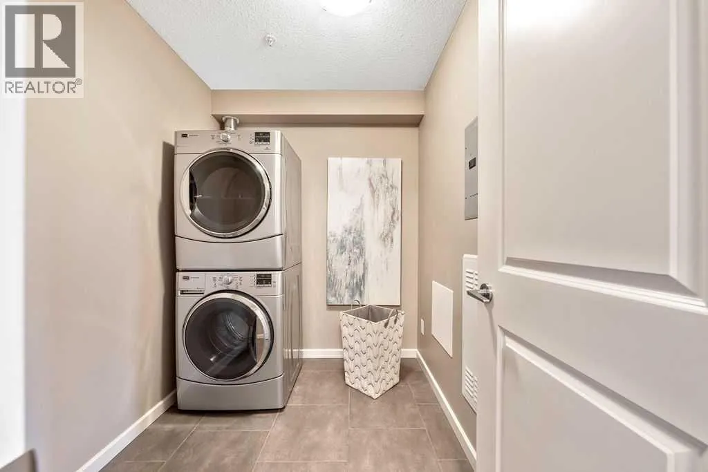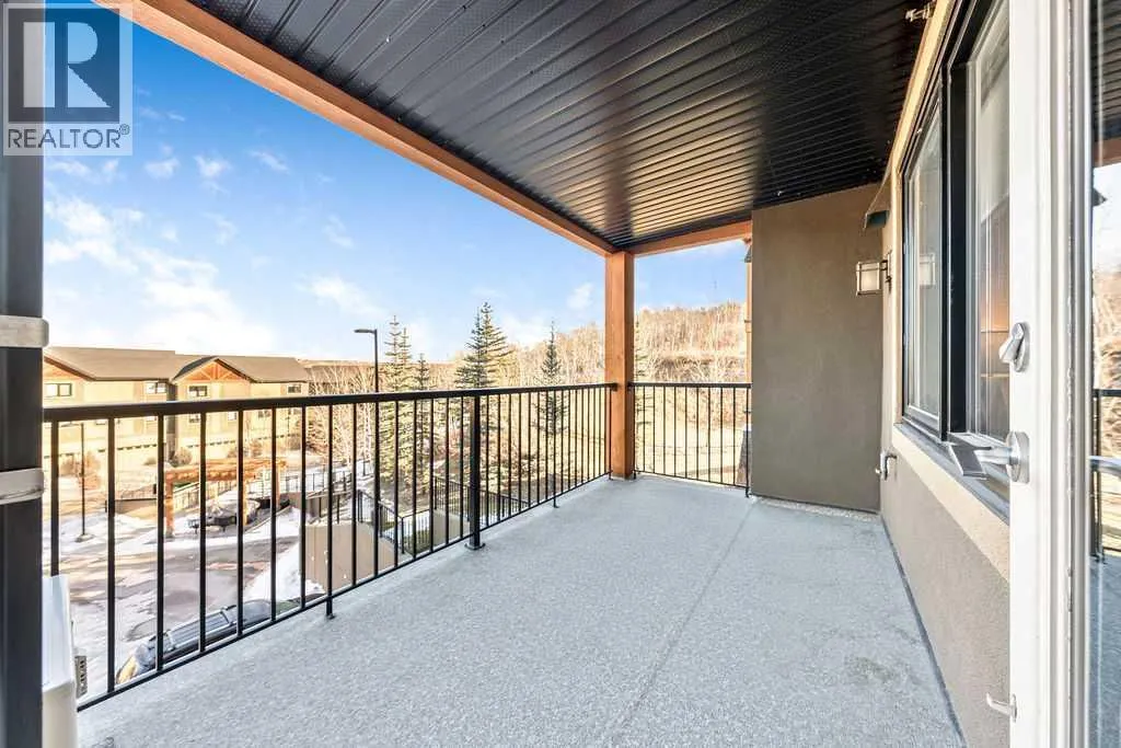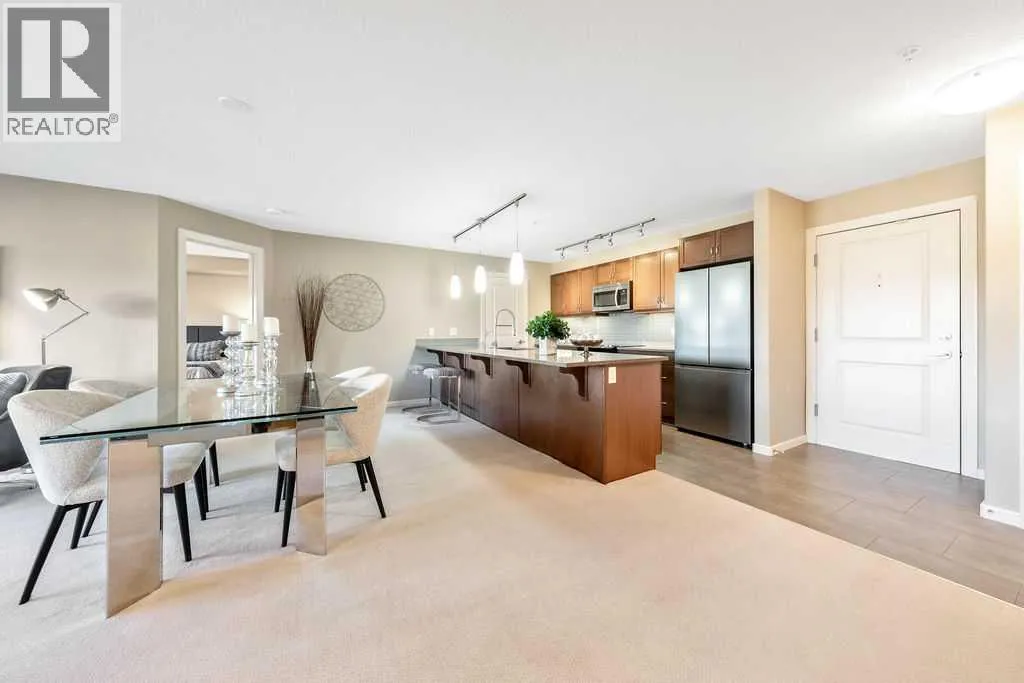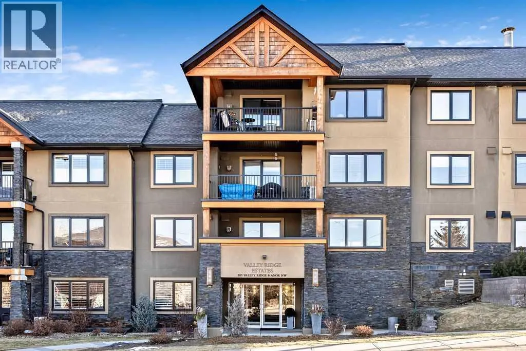 This beautifully maintained third-floor residence offers a rare blend of serenity, space, and thoughtful design within an intimate, adult-oriented (18+) building known for its strong governance and exceptional reserve fund. Inside, natural light pours through expansive windows, illuminating a well-considered floor plan that balances openness with privacy. The kitchen is both elegant and functional, anchored by stone countertops, stainless steel appliances (including a brand-new refrigerator), an oversized breakfast bar, under-cabinet lighting, a reverse-osmosis water system, and a generously sized pantry. It flows seamlessly into a dining area designed to comfortably host gatherings both casual and refined. The living room is spacious and inviting, and gives direct access to the balcony, an outdoor extension large enough for a BBQ and lounge seating, where peaceful nature views and visiting wildlife become part of daily life. The primary suite offers a calm and restorative escape, complete with a walk-through double-sided closet and a private ensuite with additional linen storage. A well-proportioned second bedroom and a substantial four-piece main bath, also featuring extra storage, provide flexibility for guests, hobbies, or a home office. Completing the interior is a massive in-unit laundry room, a rare and highly practical feature. Comfort is elevated year-round with air conditioning, while convenience is enhanced by two titled parking stalls (one underground, one surface) and a titled storage locker located on the same floor as the unit. Beyond the home, residents enjoy a beautifully appointed lobby and vibrant community amenities including a gazebo with outdoor gathering area - often the backdrop for weekly happy hours and social gatherings. Moments from the river pathways, Valley Ridge Golf Course, COP, and with effortless access to Stoney Trail and the mountains, this is a lifestyle defined by ease, connection, and quiet sophistication. Private, peaceful, an d impeccably cared for, this is Valley Ridge living at its finest. (id:27476)