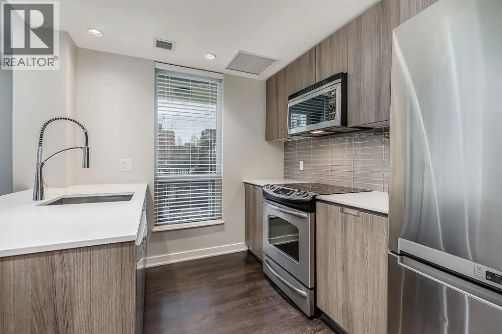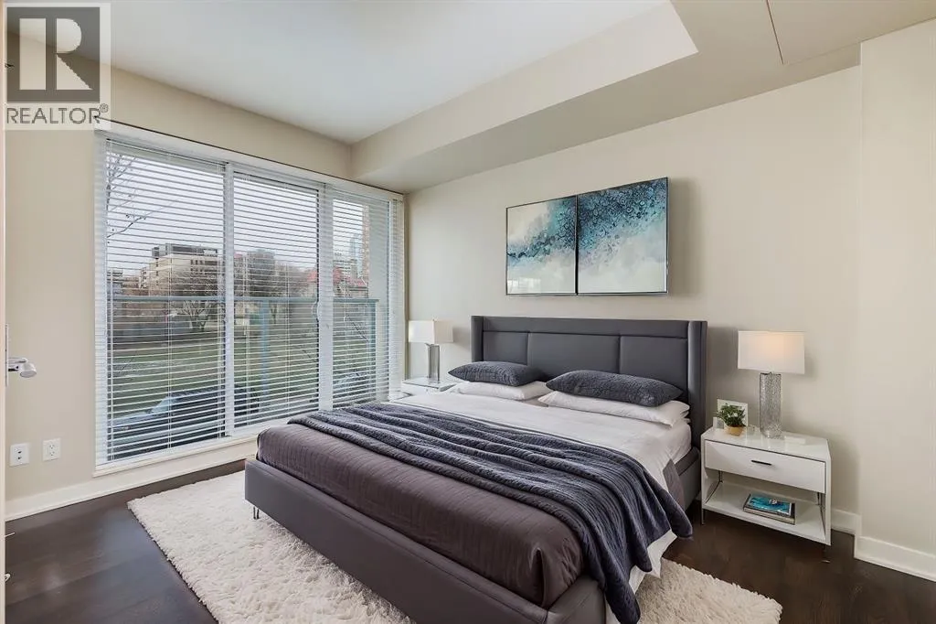 Experience the perfect balance of townhome convenience and condo living in this modern southwest corner residence located within the highly regarded Calla building. Overlooking the park and surrounded by the best of the Beltline community, this home offers a unique blend of lifestyle, design, and practicality.Set in the heart of Beltline â ranked as Avenue Magazineâs #1 community â this property offers exceptional walkability with a Walk Score of 95, placing shopping, dining, Sheldon Chumir Hospital, and public transit just steps from your door. The home features two private entrances and two oversized patios â one measuring 7â2â x 15â4â and the other 11â3â x 23â0â, offering a combined outdoor space of approximately 348 sq. ft.. With one south-facing and one west-facing, they are perfect for outdoor entertaining or relaxing with views of the park.Inside, soaring 18-foot floor-to-ceiling windows flood the living space with natural light from both the south and west, highlighting the open-concept layout and durable laminate flooring throughout the main living areas and bedrooms. The spacious primary suite includes an ensuite bathroom and a Juliet balcony overlooking the park, while the versatile second bedroom with a walk-in closet is ideal as a home office or additional living space.The gourmet kitchen is equipped with a quartz island and ample storage, making it ideal for both meal preparation and entertaining. Everyday living is made easier with in-suite laundry featuring new machines and central air conditioning for year-round comfort.Residents of Calla enjoy a full range of premium amenities including a concierge service, secure building access, a fully equipped fitness centre, yoga studio, sauna/steam room, guest suite, and visitor parking. Secure underground parking and bike storage are included, along with both in-suite storage and a secured locker for additional space.This modern townhome combines the privacy and ease of a standalone residence with the convenience and amenities of a well-managed condominium. Perfectly situated in one of Calgaryâs most vibrant inner-city communities, this home is ready to welcome its next owner.Contact us today to schedule your private viewing or learn more about this exceptional property. (id:27476)