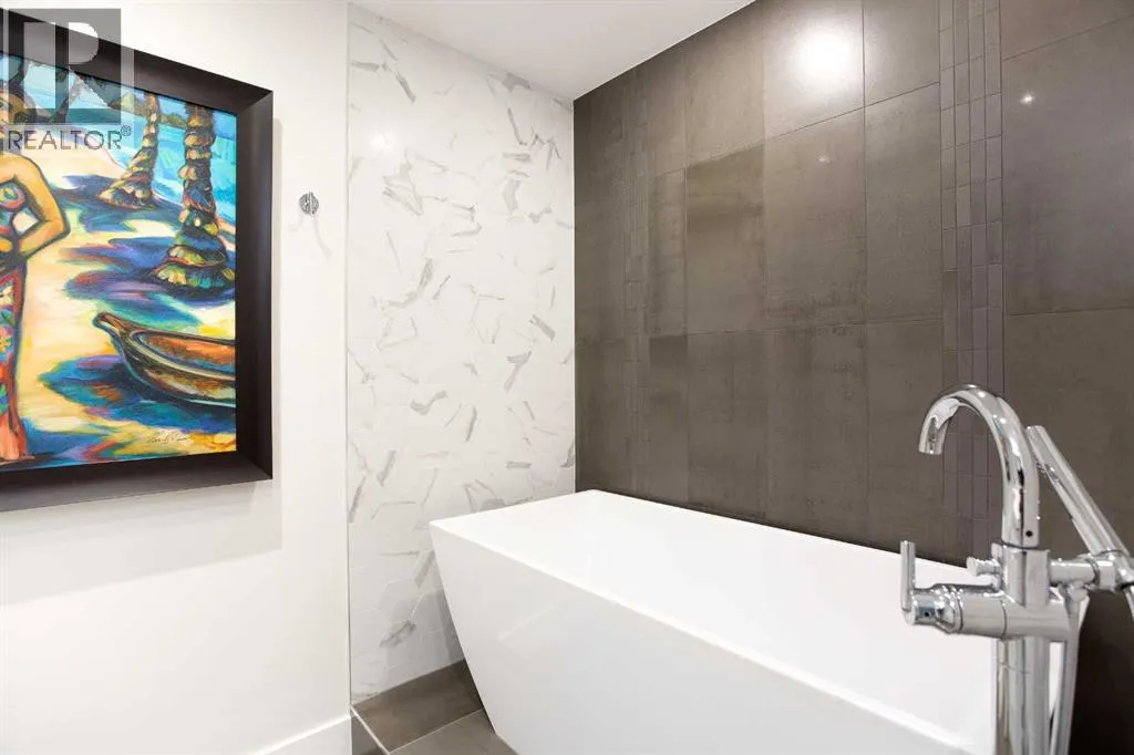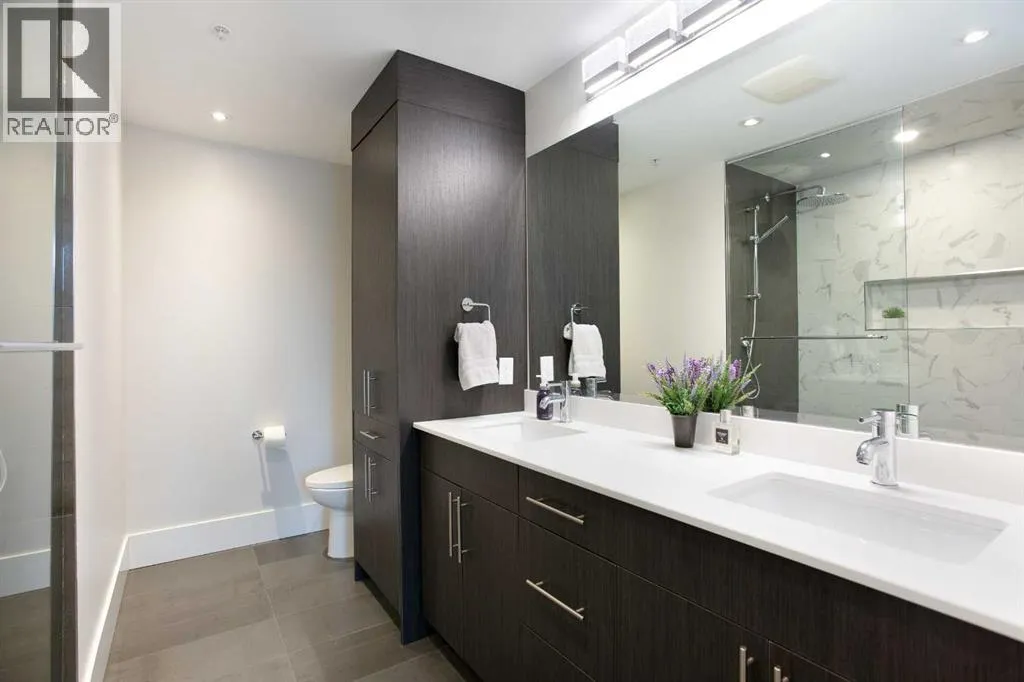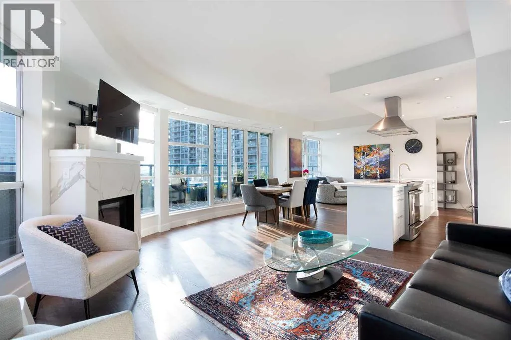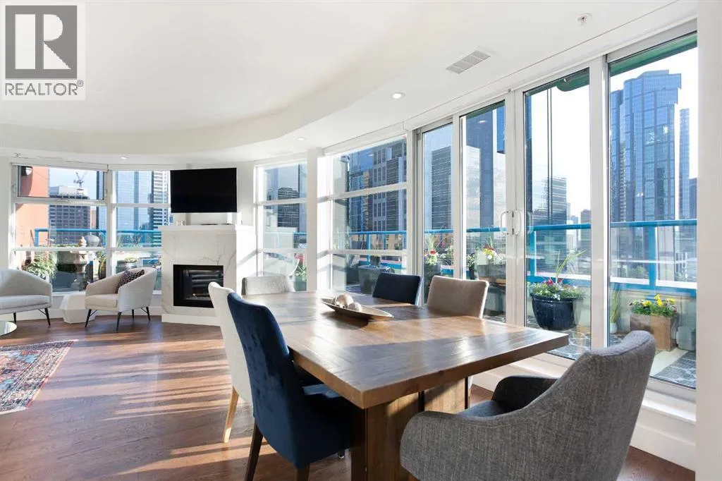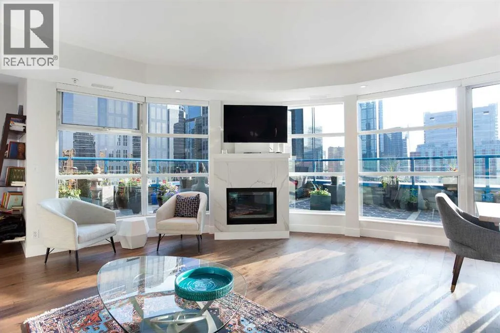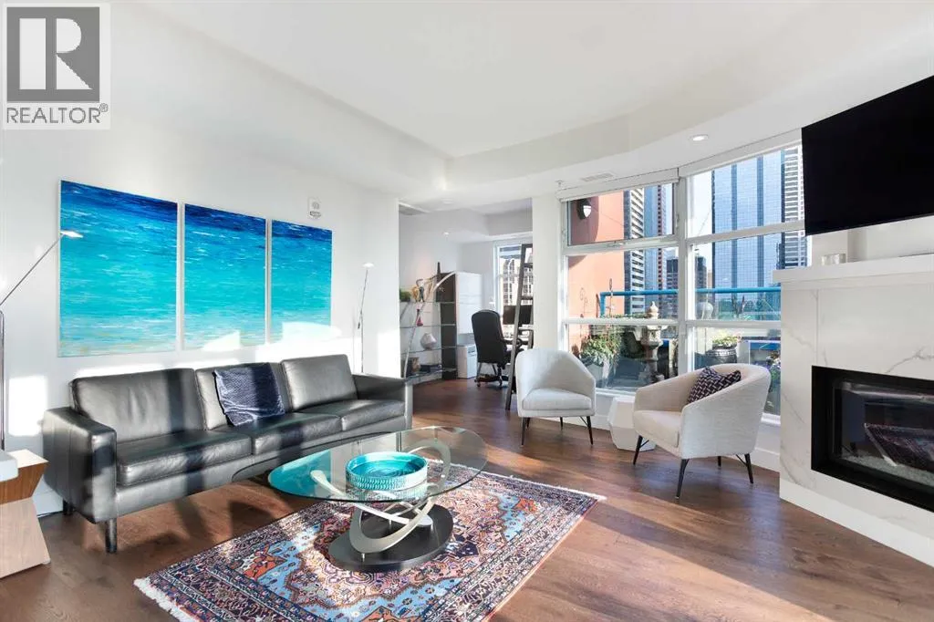 Welcome to your dream downtown retreat, just steps from the Bow River. This fully renovated sub-penthouse offers near 1,400 square feet of beautifully designed living space, featuring 2 bedrooms and 2 bathrooms, all tucked into one of Calgaryâs most vibrant and walkable communities.As you enter, you're welcomed by luxury hardwood flooring that flows throughout the home, creating a seamless and contemporary feel. The open concept layout is bright, thanks to the floor-to-ceiling windows that flood the space with south facing light and offer stunning panoramic city views.The chef-inspired kitchen has been completely reimagined with sleek cabinetry, quartz countertops, an induction cooktop, and a modern hood fan. Itâs perfect for everything from quick breakfasts to full dinner parties. The adjoining dining and living area is anchored by a beautiful fireplace, making it a cozy yet sophisticated space to entertain or relax.The first bedroom features floor-to-ceiling windows, a large walk-in closet, and a luxuriously renovated ensuite with dual vanities and a walk-in shower. A custom wall-mounted bed adds versatility, allowing the room to transform quickly. The second bedroom is equally flexible, offering floor-to-ceiling windows, a spacious walk-in closet, and easy access to the second fully renovated luxury bathroom, complete with high-end finishes and a stunning bathtub. You will also find a spacious laundry room with built-in, high-end cabinetry that provides extra storage and space.Step outside onto your expansive 300 square foot private terraceâwhether you're sipping your morning coffee, hosting friends, this outdoor space is a true extension of your living area that comes with stunning downtown views.Additional features include in-suite laundry, central A/C, secure underground parking, remote controlled blinds, and a full-time concierge for added peace of mind.Situated just steps from the Bow River pathways, and some of Calgaryâs top restaurants, cafés, this location offers the perfect blend of nature, and convenience. Whether you're walking your dog along the river or grabbing a latte with friends, everything you need is just outside your door. (id:27476)