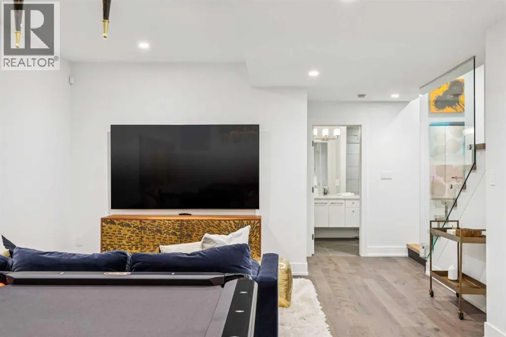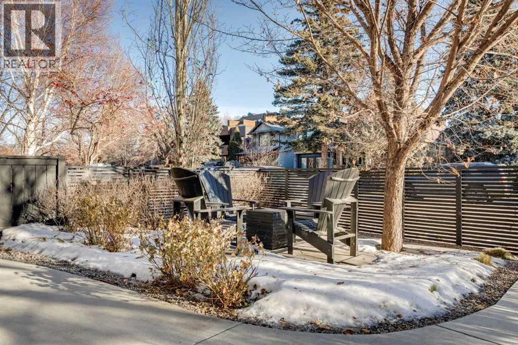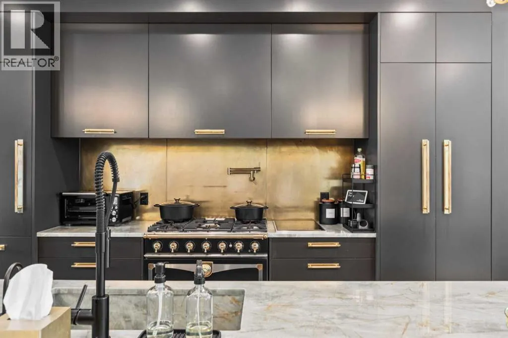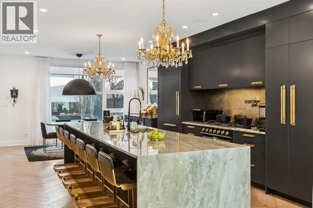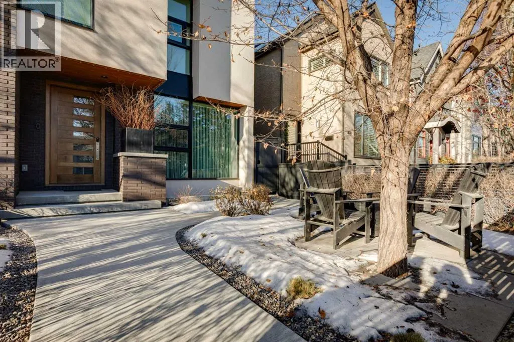 Exceptionally high-quality home in sought-after Parkhill, just a few doors from the Ridge Park with access to the Elbow River pathway system. Enjoy a walkable lifestyle minutes from the vibrant 4th Street Village, offering an endless array of shops, dining, and services, along with proximity to excellent schools. This stunning contemporary residence showcases impeccable design and craftsmanship with architecture by Marvin DeJong and an incredible array of upgrades. Brick, metal, and stucco create a striking curb appeal punctuated with a custom 2.5â solid oak and glass front door. 3,096 sq ft of developed living space including 4 bedrooms and 3.5 bathrooms. The totally open-concept main floor features high ceilings, exceptional natural light from the oversized front and rear windows and custom herringbone hardwood floors. The living room is anchored by a custom-paneled fireplace with âframeâ television and soft floor-to-ceiling sheers. Truly incredible chefâs kitchen with extensive custom cabinetry, quartzite counters and a massive âwaterfallâ island with seating. Top appliances include: a La Cornue gas stove, Subzero fridge plus 2 fridge drawers, 2 Subzero freezer drawers, 2 Subzero wine fridges, Wolf Induction burner, 2 dishwashers and a custom fabricated quartzite sink. The generous dining area with designer lighting and built-in storage overlooks the rear yard . A mudroom with heated floor and excellent storage and a discreet, elegant powder room complete the main level. Striking staircase with glass wall and solid wood treads leads to the upper floorsâ¦no carpet in the home. The primary suite features blackout drapery, wall-mounted TV and a well-organized walk-in closet. The spa-inspired ensuite showcases heated custom marble flooring, designer lighting, Kateryn cast iron soaking tub, zero-threshold shower with steam, water closet with Japanese bidet toilet and a large double vanity with honed marble counter and Restoration Hardware fixtures. The balance of the s econd level includes two bright bedrooms (one currently used as a dressing room), a spacious house bath and a walk-in laundry room with sink and storage. The top-floor holds both a large studio space with amazing light quality and an office area with access out to a large and private terrace. The fully finished lower level offers heated hardwood floors, a media space, games room, work station, bedroom and a full bath. Outdoor living is equally impressive with a front terrace with perennial-rose garden and a sunny west-facing and low-maintenance back yard with multiple patios. Additional highlights include a smart home system that controls Lutron lighting, temperature and security, a sprinkler system and Gemstone exterior lighting. The fully finished and heated double garage has 2 EV chargers and enjoys a paved alley. This exceptional property must be seen to be appreciated. (id:27476)