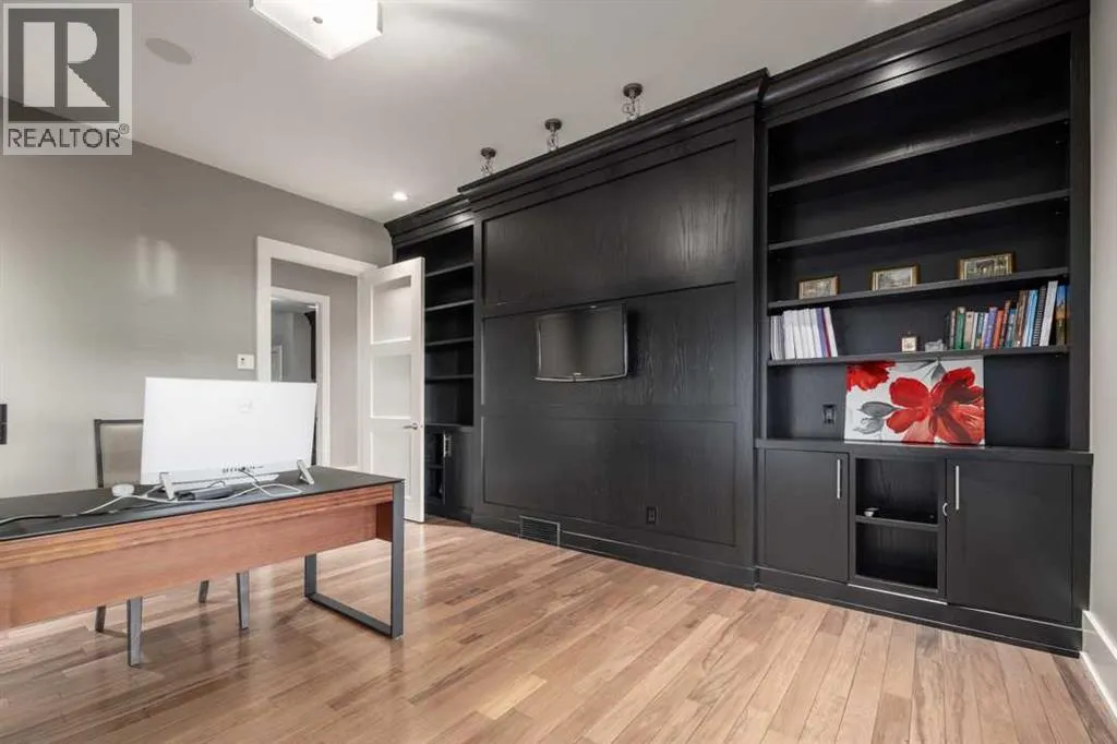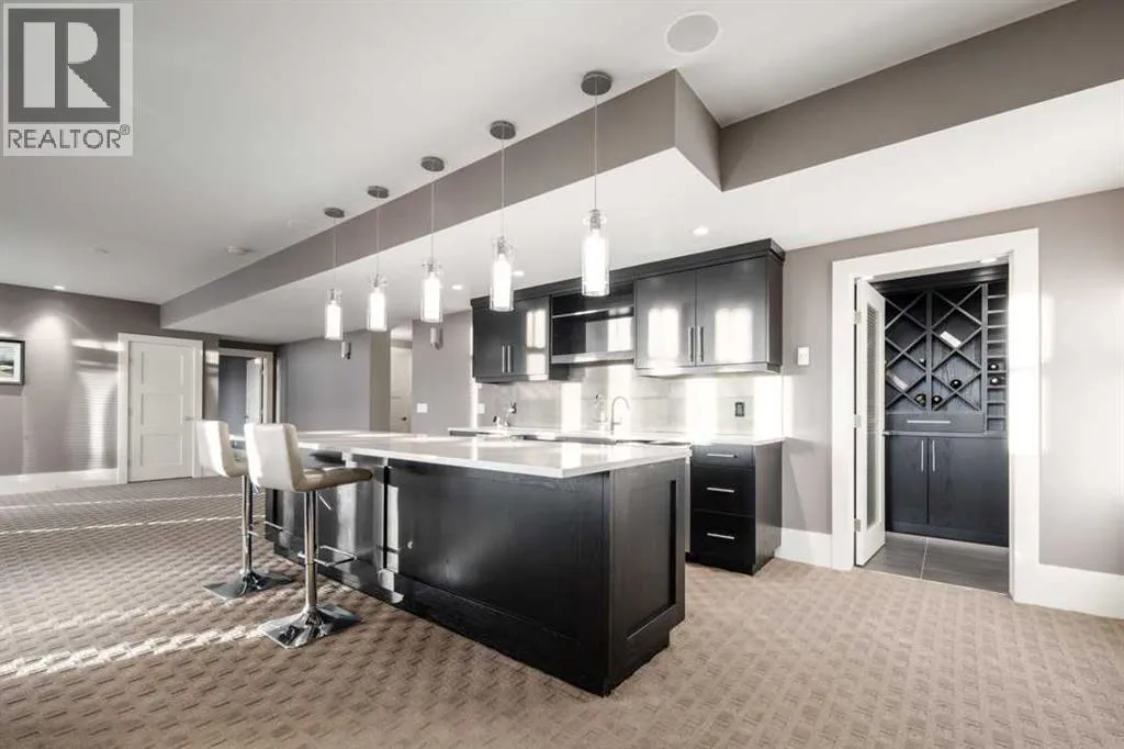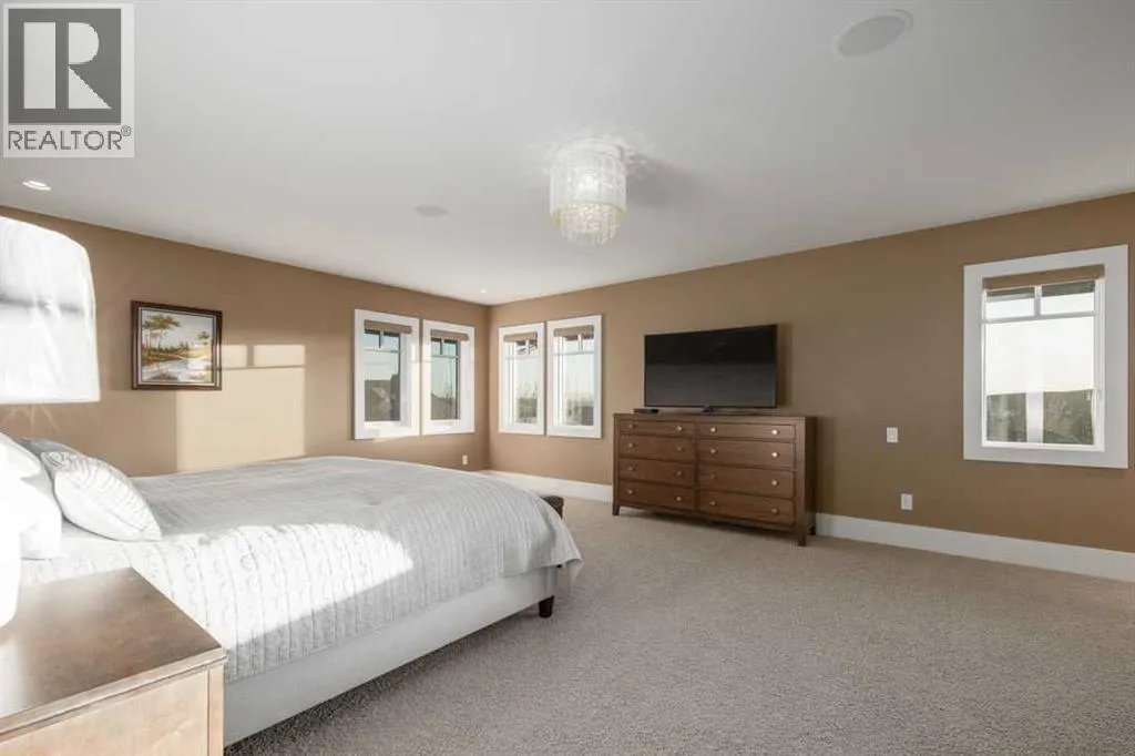 Experience the epitome of luxury living in this custom-built, two-story estate home nestled in prestigious Springbank Hill. Set on an expansive lot, this glorious home offers over 6,564 sq ft of meticulously designed living space, featuring 5 bedrooms (4 up, 1 down) and 6 bathrooms. Immerse yourself in breathtaking mountain and valley views, all while enjoying the homeâs impressive curb appeal. Step inside to a grand foyer that opens to a sun-soaked living room adorned with massive floor-to-ceiling windows and a striking gas fireplace. The main floor also includes two elegant vanity bathrooms, a spacious mudroom with built-in storage and main floor laundry, and a dedicated home office with custom shelving. Entertain with ease in the formal dining room featuring vaulted ceilings, or gather in the expansive family room framed by wall-to-wall windows. The chef-inspired kitchen is a true masterpiece, showcasing double quartz islands with seating, high-end stainless steel appliances including a built-in oven and gas range, and a hidden walk-in pantry for optimal organization. The upper level boasts four generously sized bedrooms, a stylish 4-piece bathroom, a 3-piece bathroom, a study area with dual built-in desks, and a second laundry room. The lavish primary suite is a private sanctuary complete with double walk-in closets and a luxurious 5-piece ensuite featuring a soaker tub, dual vanities, and a steam shower. The walkout basement is an entertainerâs dream, offering a 5th bedroom, a full bathroom with another steam shower, a home theatre with projector and screen, a recreation room with abundant natural light, a cozy gas fireplace, and a full wet bar complete with a stunning quartz island, wine room, and ample storage. Additional upgrades include luxury hardwood flooring, triple-glazed low-E windows, three furnaces, central air conditioning, underground sprinklers, and a comprehensive audio and video security system. Outside, the professionally landscaped yard includ es a private deck with a cedar pergola, an electric screen, and panoramic west-facing views. A covered patio and exposed aggregate walkway lead to the heated triple tandem garage with extensive driveway parking. Conveniently located near some of Calgaryâs top-rated schools, including Webber Academy, Rundle College, and Ernest Manning High School, with quick access to the Westside Rec Centre, LRT, and Stoney Trail. This is more than a homeâitâs a lifestyle. (id:27476)