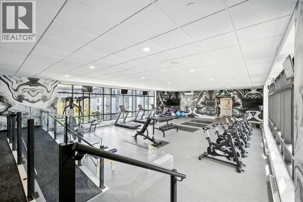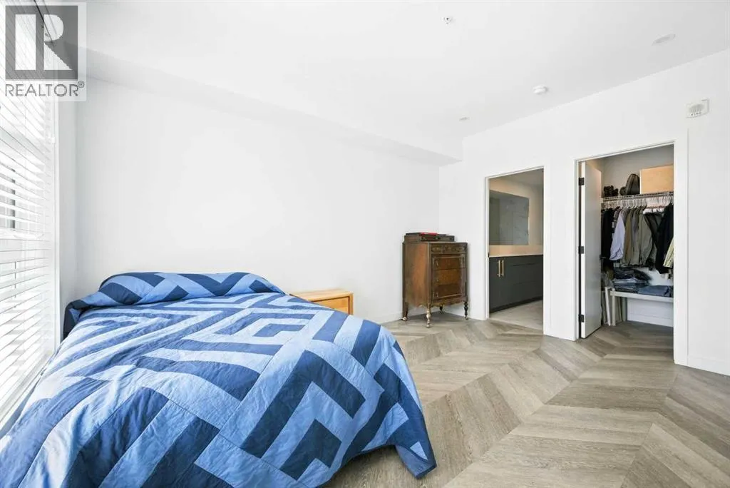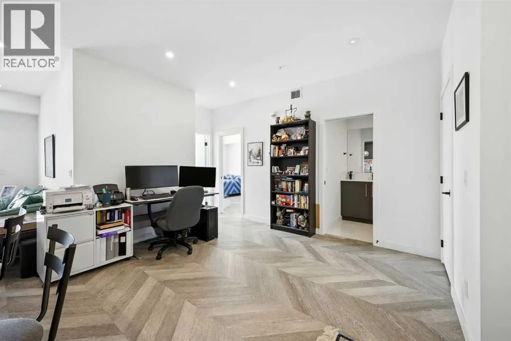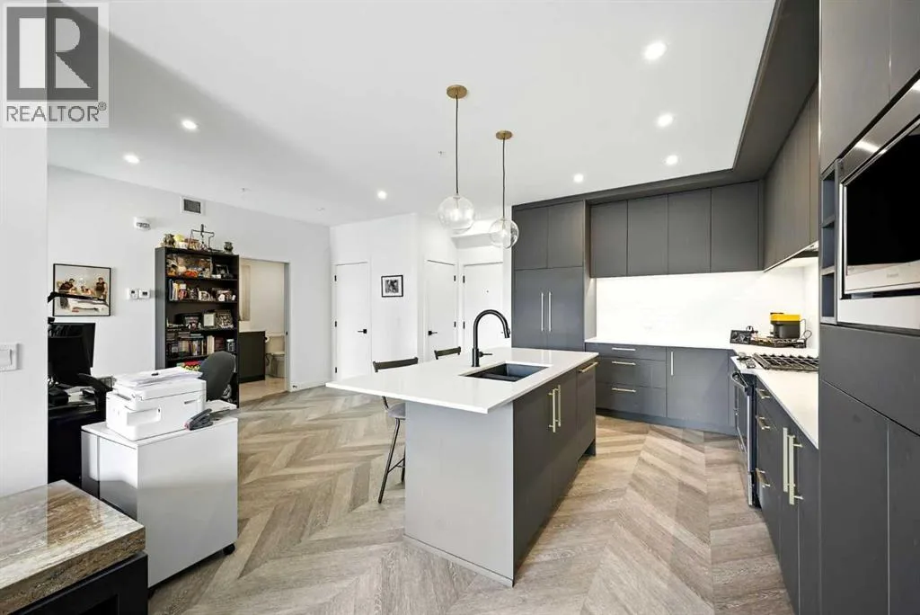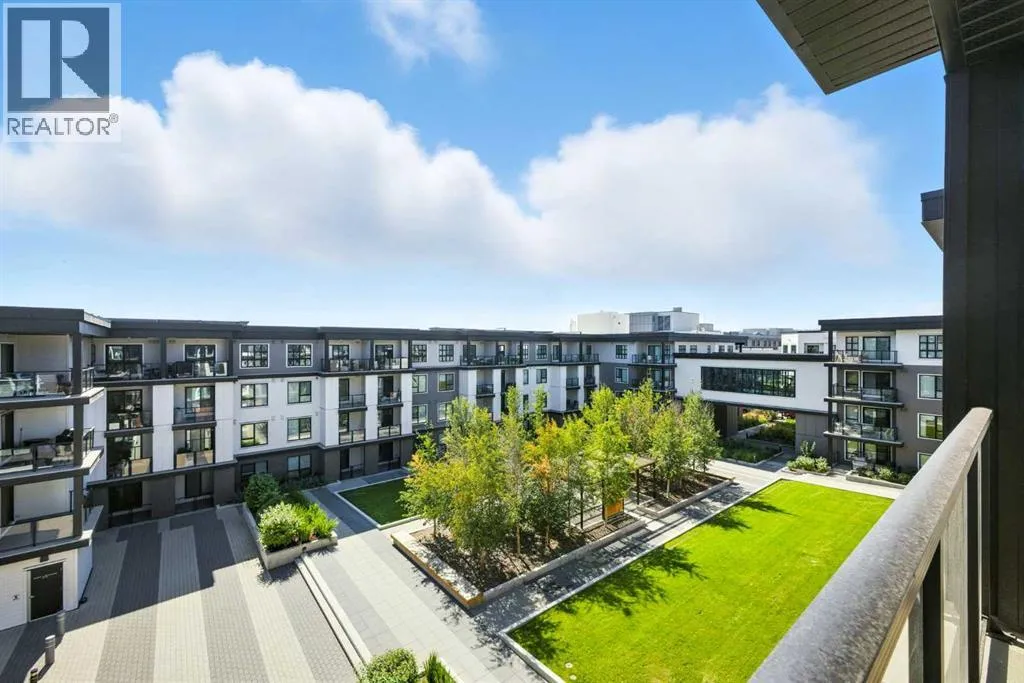 Bright top floor living with a quiet courtyard view and a southeast facing balcony. This 900 square foot 2 bedroom 2 bathroom home in Esquire offers high ceilings, a smart layout, and a clean modern finish package.The kitchen is built for real cooking with ceiling height cabinetry, quartz countertops, tile backsplash, a gas range, and a large island with seating. Herringbone vinyl plank flooring runs through the main living space, which is bright, open, and large enough for a dining setup plus a desk or study nook. Step outside to the southeast facing balcony and enjoy morning sun and evening unwind time overlooking the landscaped courtyard.The primary bedroom features a walk in closet and a 4 piece ensuite with dual sinks and a glass enclosed shower. A second bedroom and full bathroom add flexibility for guests, roommates, or a dedicated office. In suite laundry adds everyday convenience, and a titled underground parking stall keeps your vehicle secure and warm year round.Esquire residents enjoy premium amenities including a fitness centre, pet wash station, and bike storage with maintenance space. Steps from restaurants, cafes, grocery options, parks, pathways, and the off leash area, with quick access to the University of Calgary, Foothills Medical Centre, Alberta Childrenâs Hospital, and Market Mall. Book your showing today. (id:27476)