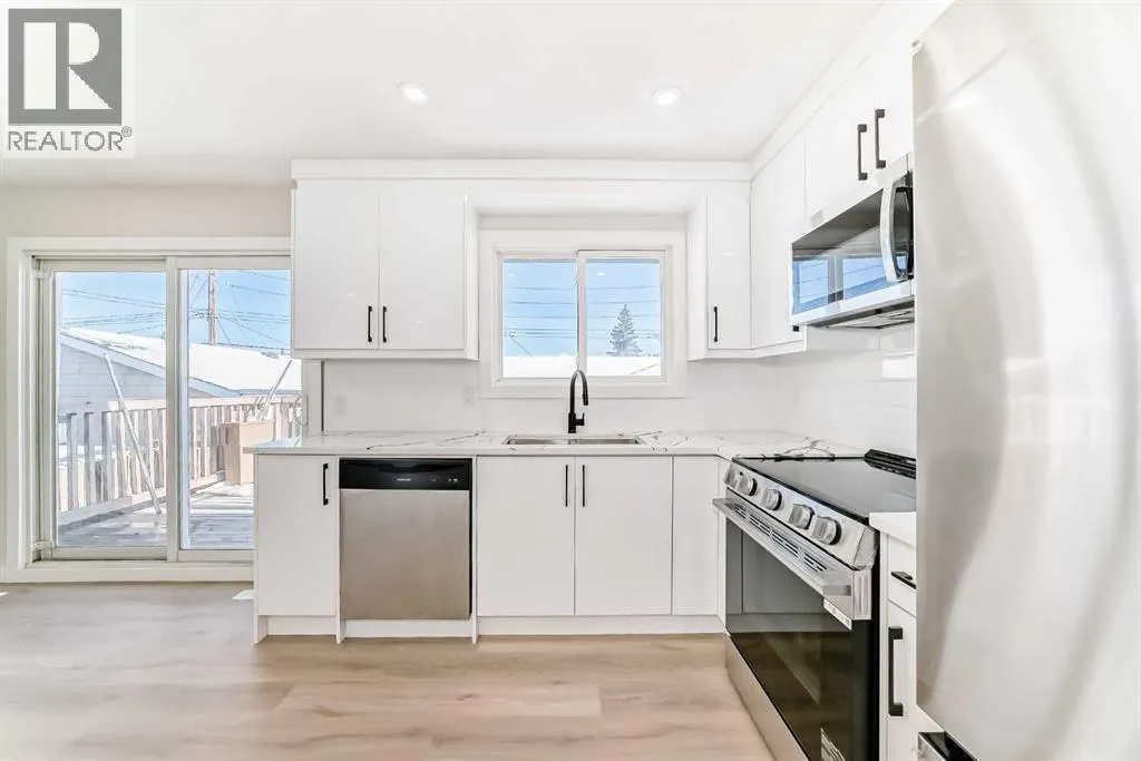 Welcome to 6128 Madigan Drive NE. Well cared for bi-level home offering four spacious bedrooms and two bathrooms. This property is well suited for families, first-time buyers, or investors looking for a solid home in a desirable area.Upon entry, you are welcomed by a bright open layout that balances comfort and functionality, making it ideal for everyday living and entertaining. Large windows throughout the main living space allow abundant natural light, creating a warm and inviting atmosphere. The dining area connects smoothly to the brand new kitchen on the main level, which provides ample cabinet and counter space for daily use and family meals. Sliding doors from the dining area lead to a generous deck, perfect for outdoor gatherings, barbecues, or relaxing while overlooking the backyard.The fully developed lower level adds valuable living space and features a large recreation room, along with a brand new kitchen. The lower-level suite is illegal and offers flexibility for extended family use or additional living space. There is also plenty of storage throughout the lower level, ensuring the home remains organized and practical.An oversized double detached garage completes the property. Located in a family-friendly community, this home is close to schools, parks, and everyday amenities. With convenient access to shopping, dining, and main commuting routes, the location offers both comfort and practicality for busy households. (id:27476)
