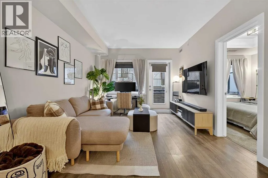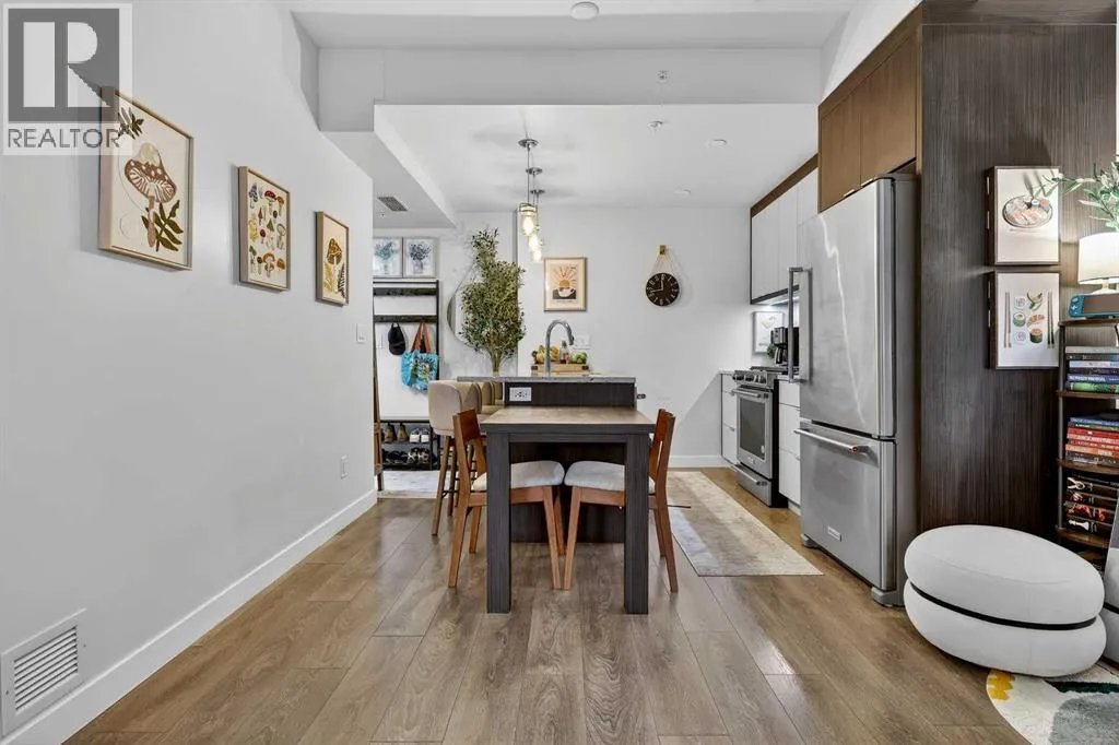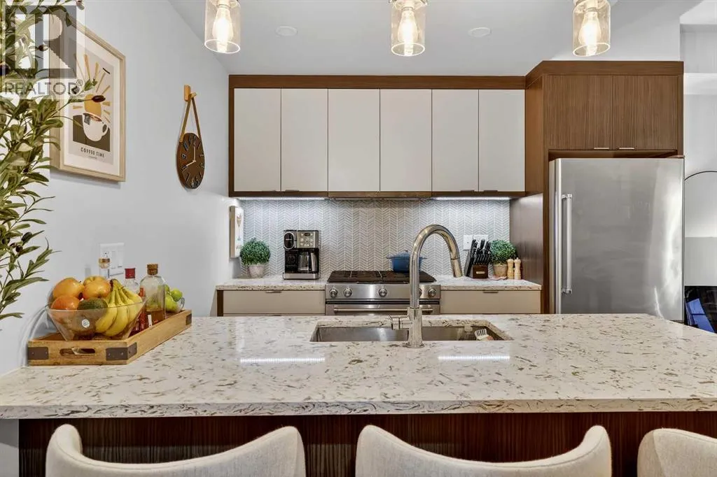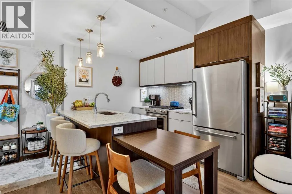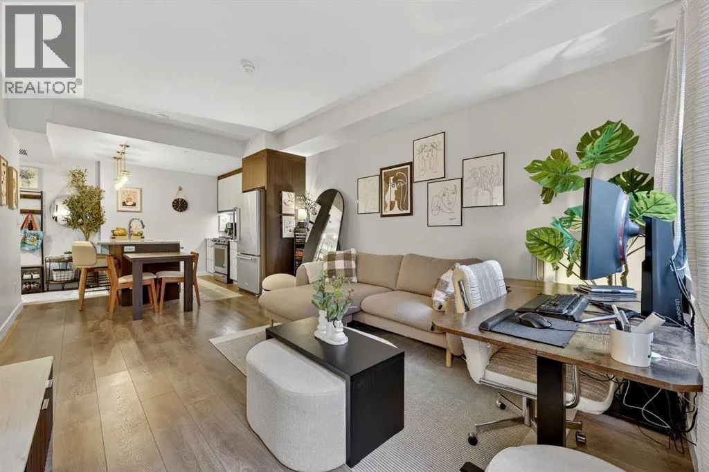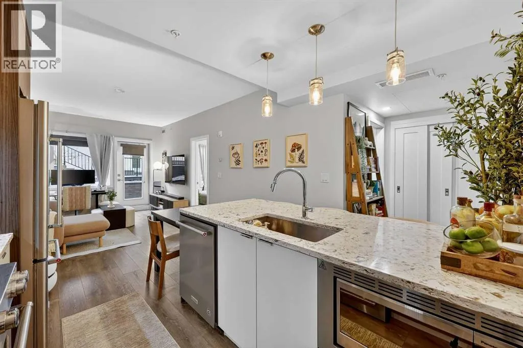 Welcome to COCO, a contemporary residence that defines upscale urban living in the heart of vibrant Marda Loop. Thoughtfully designed with modern sophistication, this air-conditioned one-bedroom home seamlessly blends style, comfort, and everyday functionality. Soaring 9-foot ceilings and sleek laminate flooring enhance the bright, open layout, while the efficient floor plan makes excellent use of every square foot. The kitchen is a true standout, showcasing stainless steel appliances including a gas convection range and concealed slide-out hood fan, complemented by full-height cabinetry, polished quartz countertops, and an extended peninsulaâperfect for casual dining, entertaining, or working from home. The open-concept living area is filled with natural light and flows effortlessly onto a spacious private patio with a gas line, creating an ideal space for summer evenings and outdoor enjoyment. The bedroom offers a calm retreat, complete with a walk-through closet leading to a stylish 4-piece bathroom finished with quartz counters, ceramic tile, and a fully tiled tub/shower surround. Additional highlights include in-suite laundry with a full-size washer and dryer, along with a titled, heated underground parking stall for year-round convenience. COCO is a pet-friendly building designed for modern living, with low condo fees that include heat and water, plus access to impressive amenities such as secure bike storage, guest parking, a rentable guest suite, multi-use resident lounge, indoor dog wash, water bottle refill station, and a beautifully landscaped courtyard. Ideally located just steps from shops, restaurants, cafés, fitness studios, parks, and public transit, this home places you at the center of everything Marda Loop has to offer. With refined finishes, smart design, and an unbeatable location, this exceptional property delivers contemporary city living at its finest. Book your private showing today and experience the COCO lifestyle. (id:27476)