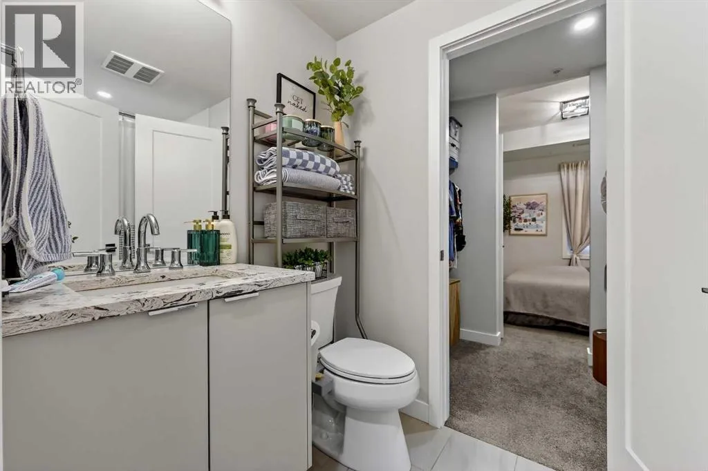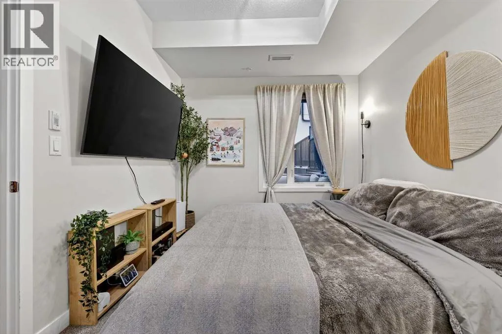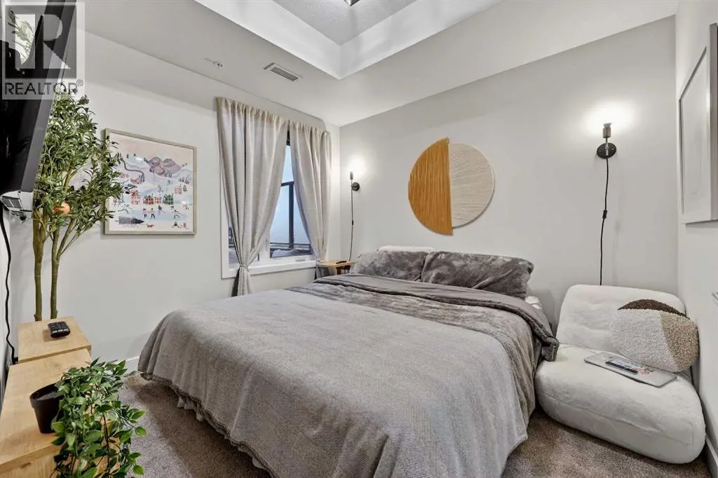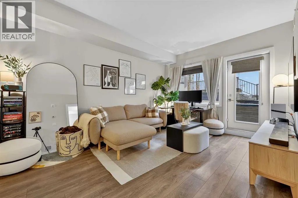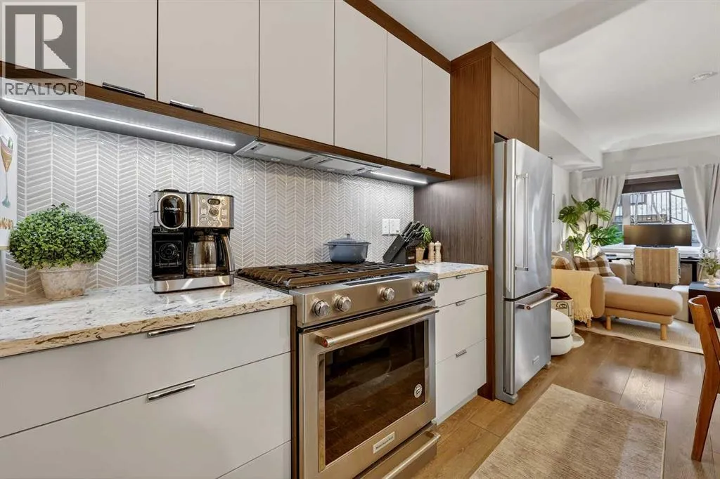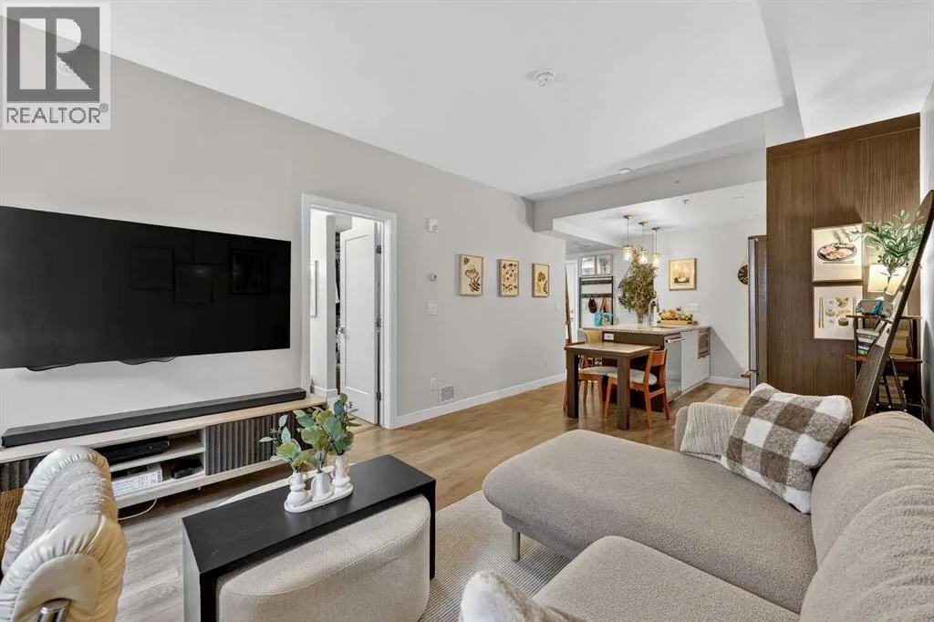 Welcome to COCO, a contemporary residence that defines upscale urban living in the heart of vibrant Marda Loop. Thoughtfully designed with modern sophistication, this air-conditioned one-bedroom home seamlessly blends style, comfort, and everyday functionality. Soaring 9-foot ceilings and sleek laminate flooring enhance the bright, open layout, while the efficient floor plan makes excellent use of every square foot. The kitchen is a true standout, showcasing stainless steel appliances including a gas convection range and concealed slide-out hood fan, complemented by full-height cabinetry, polished quartz countertops, and an extended peninsulaâperfect for casual dining, entertaining, or working from home. The open-concept living area is filled with natural light and flows effortlessly onto a spacious private patio with a gas line, creating an ideal space for summer evenings and outdoor enjoyment. The bedroom offers a calm retreat, complete with a walk-through closet leading to a stylish 4-piece bathroom finished with quartz counters, ceramic tile, and a fully tiled tub/shower surround. Additional highlights include in-suite laundry with a full-size washer and dryer, along with a titled, heated underground parking stall for year-round convenience. COCO is a pet-friendly building designed for modern living, with low condo fees that include heat and water, plus access to impressive amenities such as secure bike storage, guest parking, a rentable guest suite, multi-use resident lounge, indoor dog wash, water bottle refill station, and a beautifully landscaped courtyard. Ideally located just steps from shops, restaurants, cafés, fitness studios, parks, and public transit, this home places you at the center of everything Marda Loop has to offer. With refined finishes, smart design, and an unbeatable location, this exceptional property delivers contemporary city living at its finest. Book your private showing today and experience the COCO lifestyle. (id:27476)