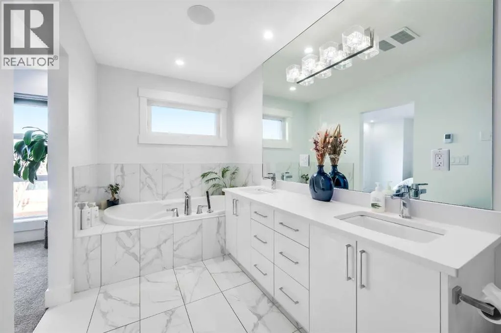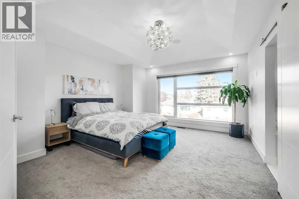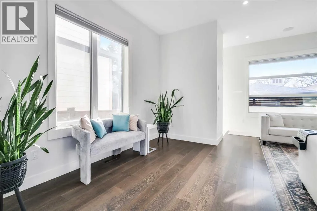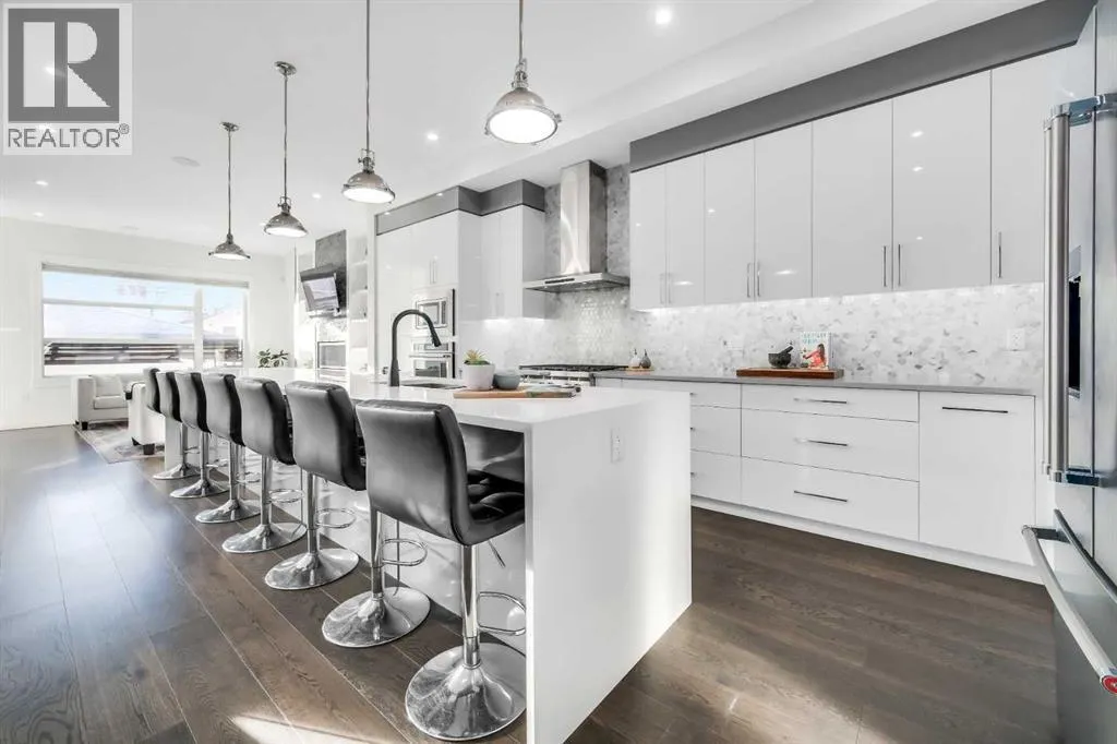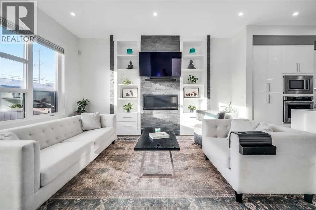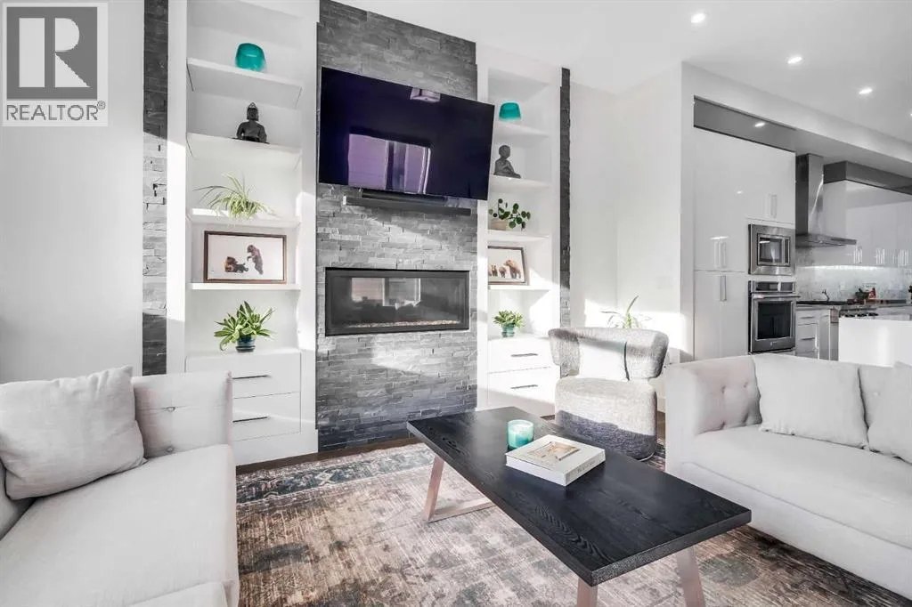 Welcome to this stunning contemporary detached home in Banff Trail, offering over 3,100 sq. ft. of beautifully finished living space across all three levels-designed to balance upscale style with everyday comfort in one of Calgaryâs most desirable inner-city communities.This home features air conditioning, a humidifier, built-in speakers (including outdoors), plus an A1 alarm and camera system paired with a Honeywell security setup, and approximately 3 years remaining on the structural warranty.Step inside to soaring 10-foot ceilings, engineered hardwood, modern tile, and sleek glass railings that elevate the open-concept design. The chef-inspired kitchen showcases a massive 15-foot quartz island, gas stove, and custom cabinetry-perfect for entertaining or daily living. The main floor is complete with a formal dining room, spacious great room with a gas fireplace, breakfast nook, and a convenient powder room.Upstairs offers a luxurious primary retreat with a spa-inspired ensuite featuring heated floors and a jetted tub, plus two additional bedrooms each with their own private ensuite, and convenient upper-level laundry.The fully finished basement continues the luxury with heated floors, a cozy family room with a second gas fireplace, wet bar, dedicated home gym, fourth bedroom, and full bathroom-ideal for guests or added living space.Outside, enjoy the freshly painted exterior, along with a fully fenced and landscaped backyard with a new pergola, concrete patio, and an insulated double garage.Ideally located close to the C-Train, U of C, parks, shopping, and several top-rated bilingual and French-immersion schools-offering unbeatable inner-city lifestyle and convenience. (id:27476)