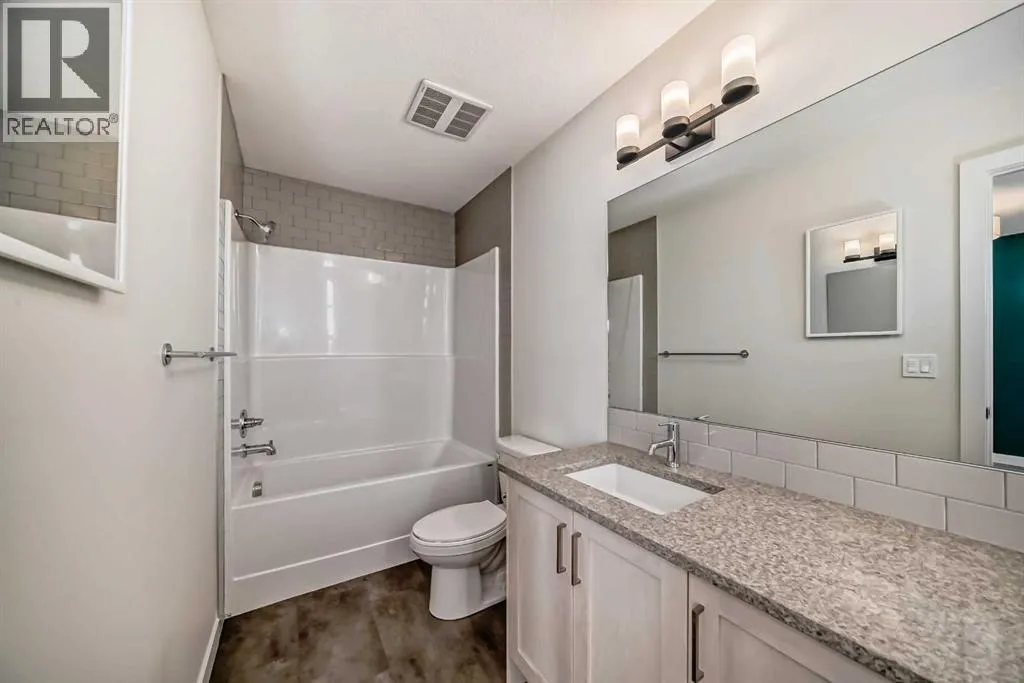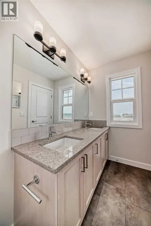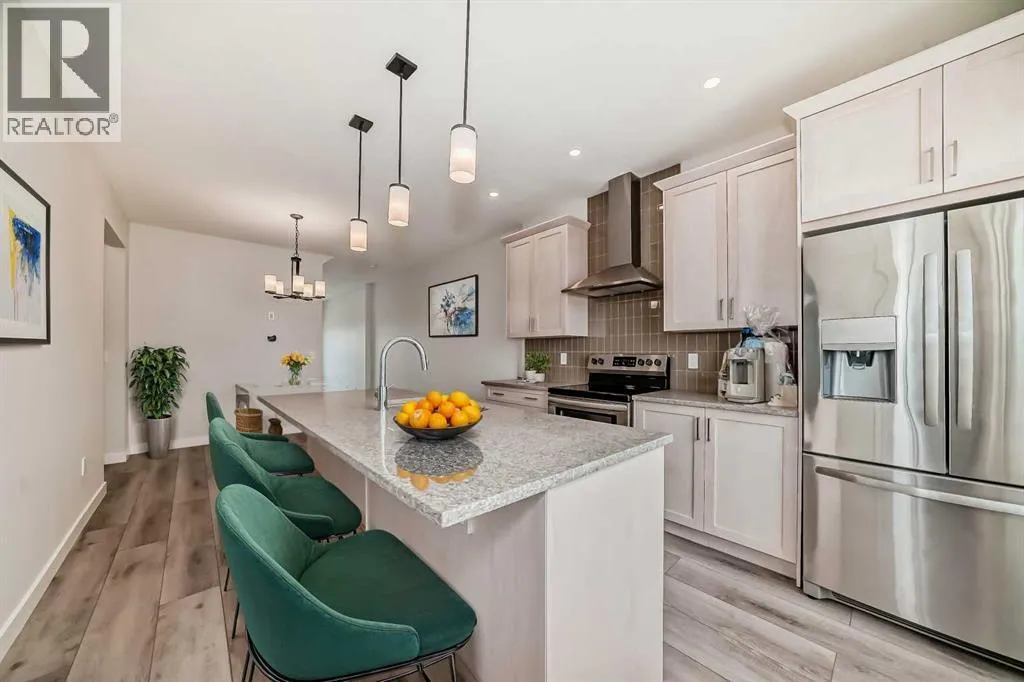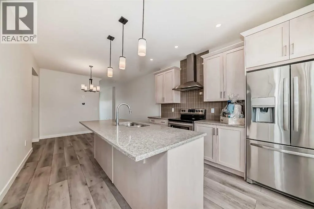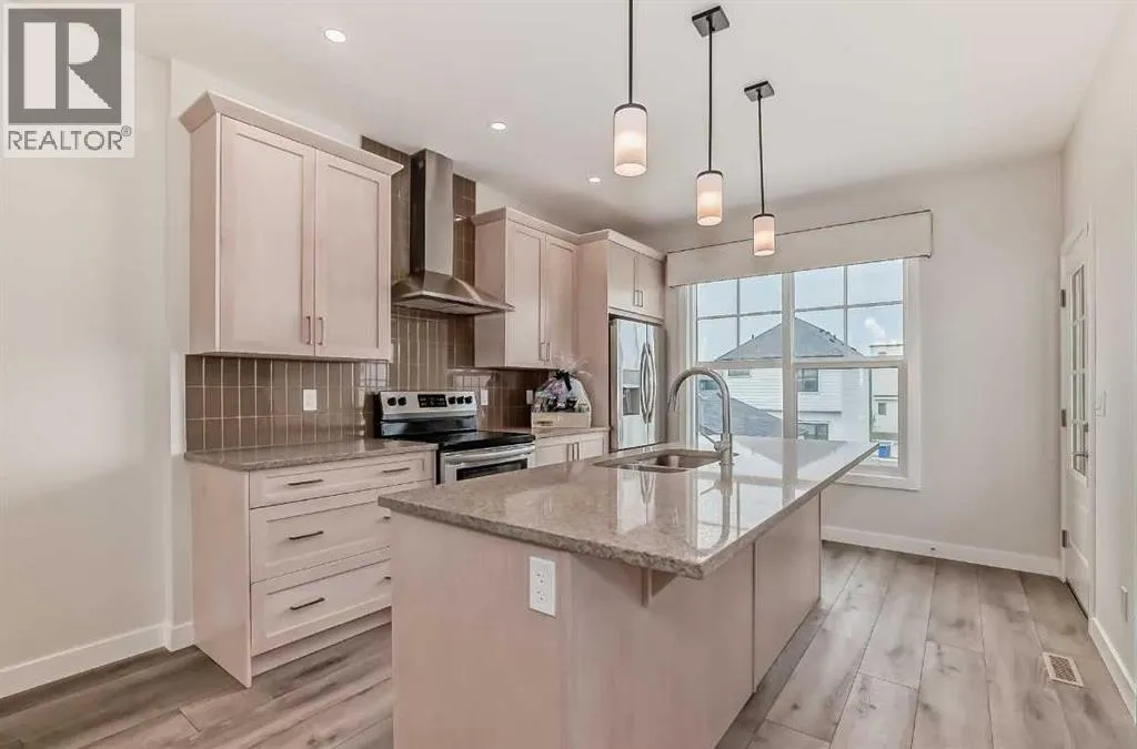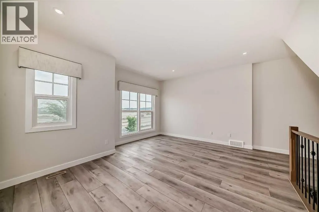 Offered, is a former Genesis show home - The "Alicia" model.  The home is situated on an oversized corner lot, one of the largest available for this style of property, allowing for additional windows, enhanced natural light, and a clear advantage over interior units. Professional landscaping has already been completed, including trees, shrubs, and underground sprinklers, providing a seamless and low-maintenance transition for the new owner.  Inside, youâll appreciate the impressive modern layout and interior finishes/high-end features. Included, is a highly functional kitchen with a walk-in pantry including stainless steel appliances with the option for gas to both the kitchen and balcony, high end countertops, nine-foot ceilings, luxury vinyl plank flooring, and a conveniently located upper-floor laundry complete with washer and dryer. A unique and highly desirable feature of this home is the ground-level bedroom or flex space, making it ideal for a private home office, studio, or guest roomâperfect for professionals seeking work-life balance without the daily commute. Additionally, the double attached rear garage features an upgraded carriage-style garage door and wall-mounted heaters, offering both comfort and added security A comprehensive list of upgrades is available for review, please ask your agent to view it. Alpine Park is a community that deserves a top spot on your home search journey. Located just off Stoney Trail in the SW quadrant of Calgary and near the new Taza shopping Development, this area reflects the bold and thoughtful planning vision of the developer, Dream. Contact your agent to book a private showing and explore this exceptional opportunity. Some photos have been virtually staged. (id:27476)