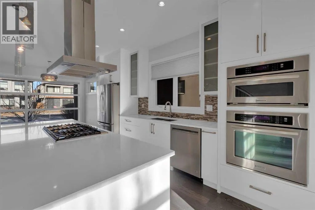 Welcome to Richmond/Knob Hill! This beautifully finished home offers 4 bedrooms, 3.5 bathrooms, a thoughtful layout, and a fully developed basementâtruly a standout property. The bright, open-concept main floor features 9-foot ceilings, hardwood floors, and oversized windows that fill the space with natural light. The tiled front entry includes a spacious closet with French doors and custom organizers (no wire shelving in this house!), leading into a generous living room perfect for entertaining or settling in for a movie night. The chef-inspired kitchen boasts quartz countertops, a large island, ceiling-height cabinetry, a gas cooktop, built-in wall oven and microwave, and a pantry with custom shelving. It flows seamlessly into the dining area, which comfortably seats eight and is anchored by a gas fireplace with built-ins and a south-facing window. A discreetly positioned 2-piece powder room and a mud room with French door closet and additional built-ins complete the main level. Upstairs, an extra-wide staircase and skylight create an inviting transition to the second floor, where youâll find 9-foot ceilings and an ideal layout. The private primary suite overlooks the backyard and includes a spacious 5-piece ensuite with dual vanities, a deep soaker tub, an oversized shower, and a dreamy walk-in closet with extensive built-ins. Two additional large bedrooms sit at the opposite end of the home, each with built-in closets, large windows, and a shared balcony complete with soffit lighting. A 4-piece bathroom with quartz countertop and a dedicated laundry room with soft-close cabinetry complete this level. The basement feels anything but below-grade, thanks to large windows and cozy in-floor heat. The rec room offers a great space for family time and includes a well-appointed wet bar. A fourth bedroom with two windows and a huge walk-in closet sits next to a full 4-piece bathroom. Additional highlights include a linen closet, ample storage, and an exceptionally tidy u tility room. Outside, the sunny south facing backyard features a lovely deck and leads to a detached double garage (insulated and drywalled). *LOCATION - 5 minute walk to Richmond Elementary, 3 kms to Mount Royal University, 10 blocks to Marda Loop, easy access to all major commuter routes and only a 10 minute drive into downtown. *BONUS - central vac rough-in, sump pump, freshly painted, professionally cleaned and move-in ready! (id:27476)