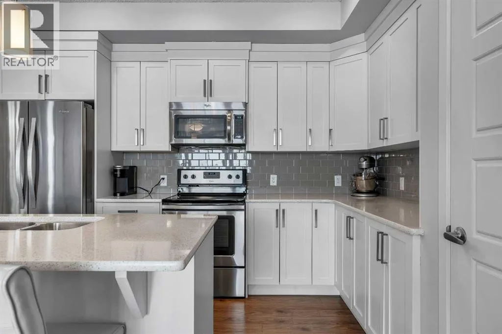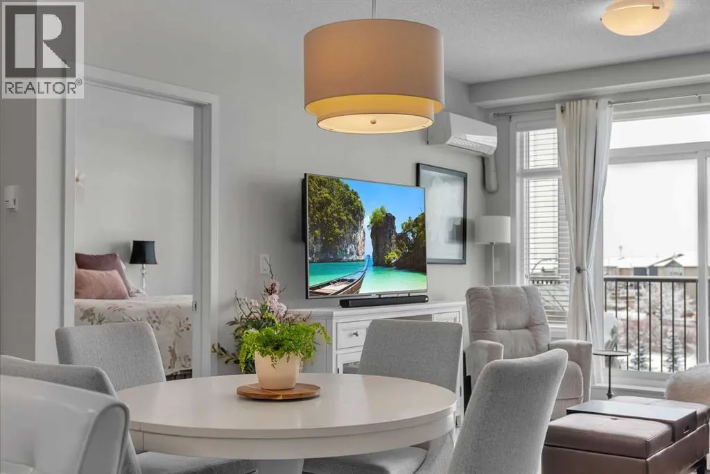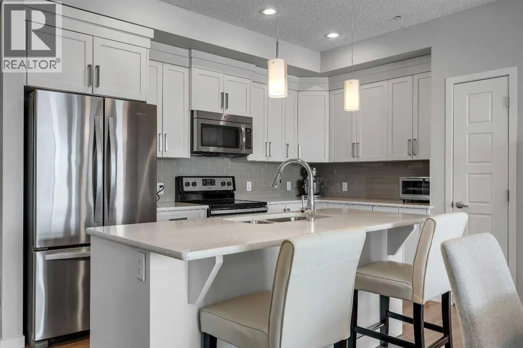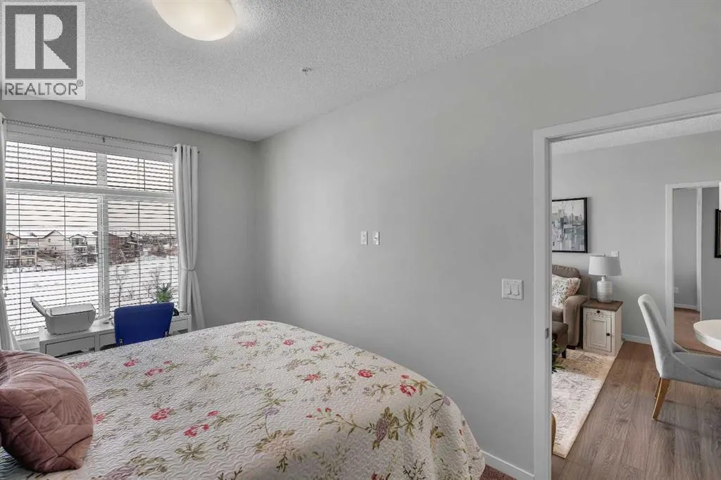 Welcome to this light-filled and beautifully designed 2-bedroom, 2-bathroom condo in the highly sought-after community of New Brighton. Offering a fantastic layout with 9-foot ceilings and triple-pane windows, this bright and airy unit is filled with natural light and designed for comfortable, modern living. The open-concept kitchen is a true standout, featuring a spacious 7-foot island with quartz countertops, stylish tile backsplash, stainless steel appliances, and ample cabinetryâperfect for cooking, entertaining, or casual dining. The kitchen flows seamlessly into the dining and living areas, creating an inviting space to relax or host guests. Step out onto your private balcony and enjoy peaceful pond and mountain views, stunning sunsets, and the convenience of a BBQ gas hookupâan ideal outdoor retreat. Inside, durable laminate flooring enhances the main living areas, while both generously sized bedrooms offer plush comfort. The primary suite is complete with twin closets and a large ensuite featuring an oversized walk-in shower. A second spacious bedroom and full bathroom make this home ideal for guests, roommates, or a home office.Additional features include in-suite laundry with full-size machines and extra storage, along with additional storage conveniently located by the heated underground parking. Central air conditioning ensures year-round comfort. Beyond the home itself, residents enjoy access to the incredible New Brighton Community Centre, which offers a waterpark, two outdoor skating rinks, and tennis/pickleball courts. Ideally located close to South Trail Crossing, South Health Campus, schools, playgrounds, and scenic walking paths, with easy access to Deerfoot and Stoney Trail, this home delivers the perfect balance of convenience, lifestyle, and community. Donât miss your opportunity to call this beautiful home your own. Schedule your showing today! (id:27476)