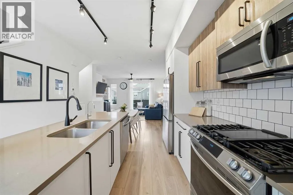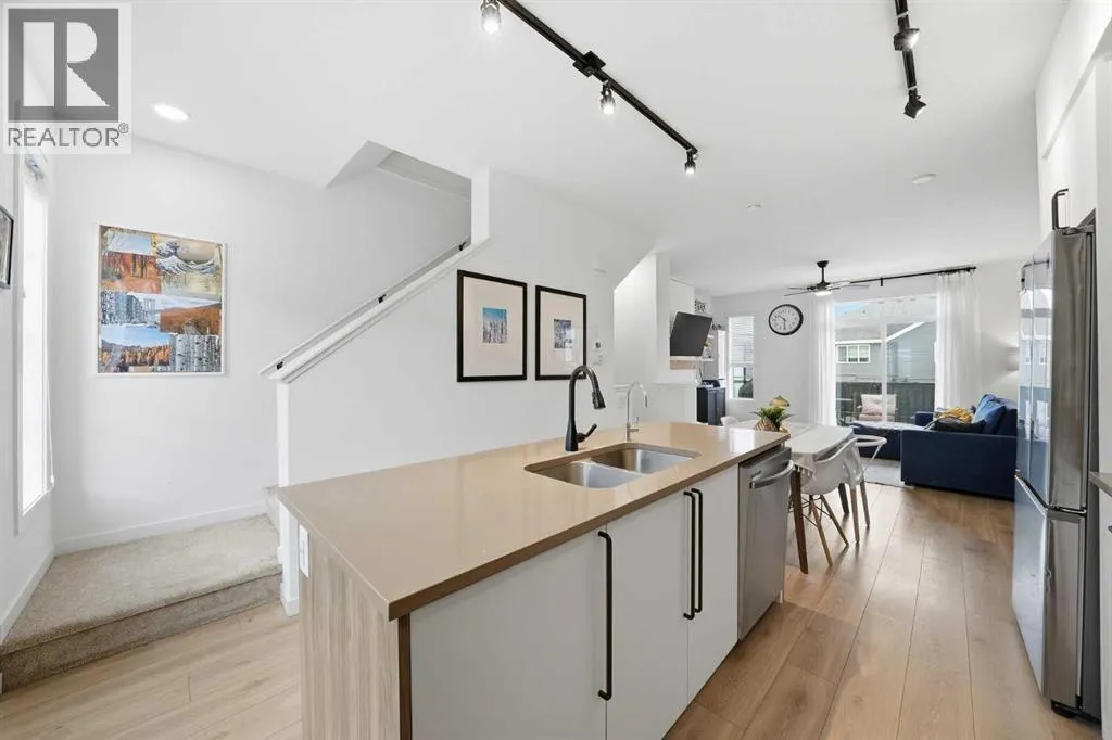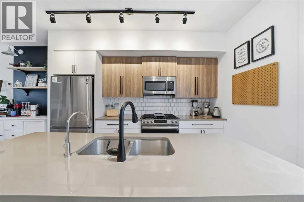 Welcome to this charming, meticulously maintained Walden townhome! Offering 2 bedrooms, 2.5 bathrooms, and single garage with driveway. Step inside to 9-foot knockdown ceilings that create a bright, spacious main floor. The open-concept layout seamlessly connects the living, dining, and kitchen areas, with large windows bathing the space in natural light and showcasing high-quality finishes. The chef-inspired kitchen boasts quartz countertops, stainless steel appliances, ample cabinetry, and a breakfast barâperfect for casual dining or entertaining. Upstairs, youâll find generously sized bedrooms, including a primary suite with a large closet and ensuite featuring modern fixtures and dual vanities. Located in the vibrant community of Walden, close to picturesque surroundings and essential amenities, this move-in-ready townhome combines modern style with functional comfort. Donât miss your chance to experience the best of Walden livingâschedule your viewing today! (id:27476)
