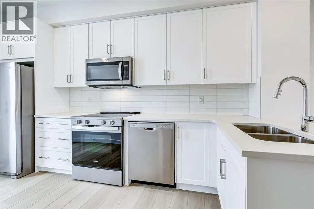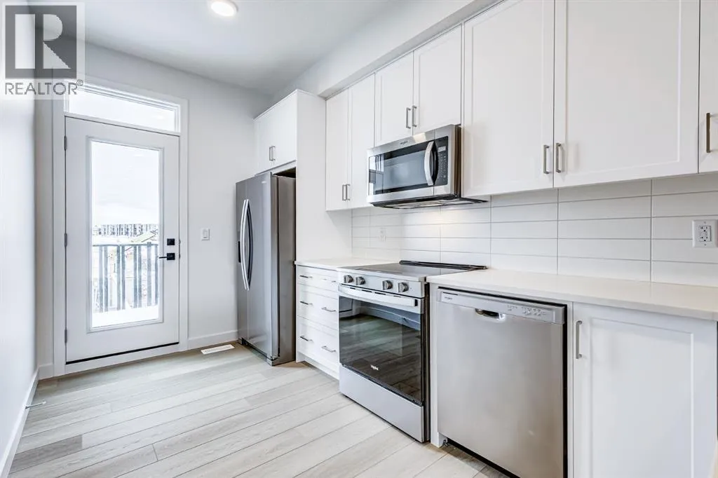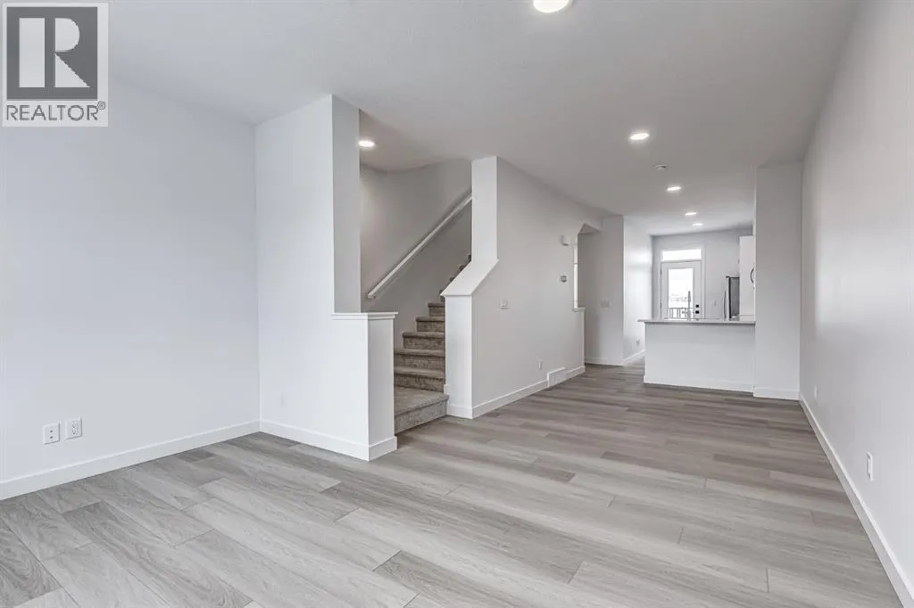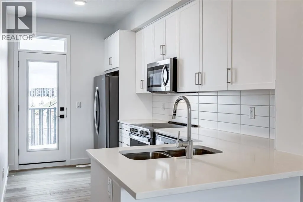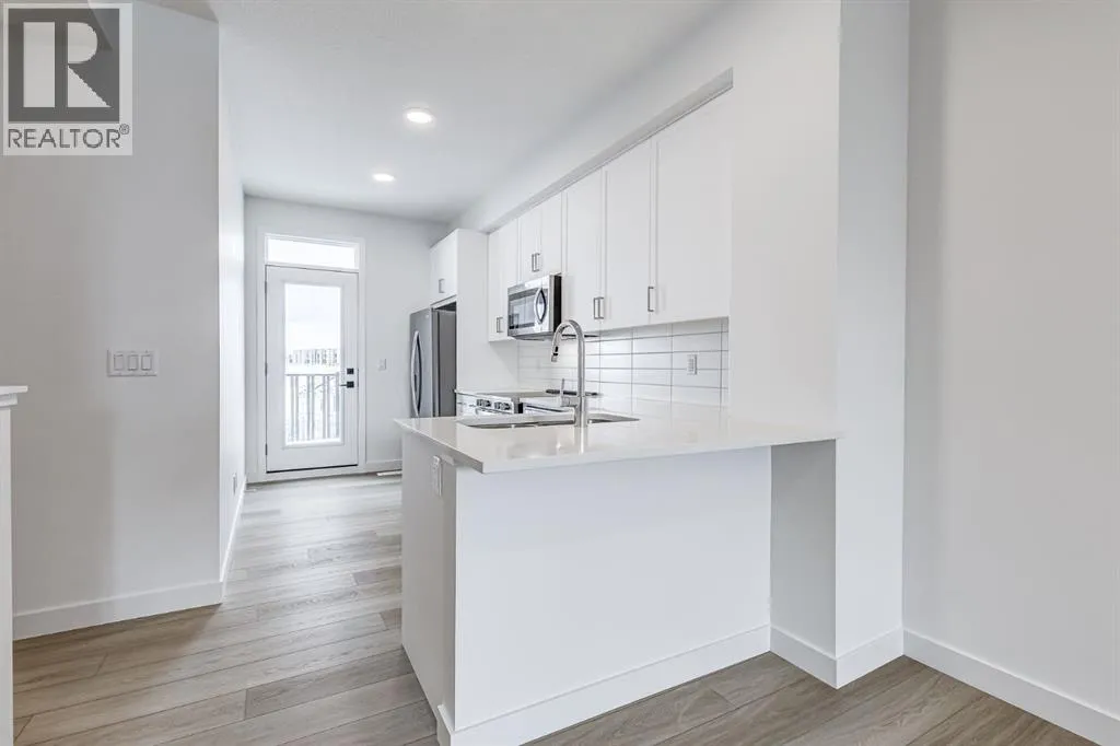 Welcome to Alpine Park, Calgaryâs west-side community known for bold architecture, modern streetscapes, and walkable energy. This brand-new, never-lived-in townhome offers the perfect alternative to building from scratch- all the perks of a new home, including full Alberta New Home Warranty.Designed for effortless everyday living, the layout unfolds across bright, thoughtfully planned levels. The ground floor features a clean, welcoming entry with interior access to your double attached garage, ideal for secure parking, storage, or seasonal gear.Upstairs, the open-concept main floor is all about natural light and flow. A modern kitchen anchors the space with quartz counters, sleek cabinetry, stainless steel appliances, and a peninsula perfect for quick breakfasts, meal prep, or evening wine with friends. The adjoining dining and living areas create a comfortable, cohesive space for hosting or unwinding. A private balcony expands your living area outdoors, perfect for coffee, fresh air, or grilling.The top level keeps both bedrooms separated for privacy, with two full ensuites, a rare and highly desirable feature at this price point. The primary suite offers a 4-piece ensuite, while the second bedroom includes its own 3-piece ensuite, making it ideal for guests, roommates, or resale flexibility. Upper-floor laundry keeps chores convenient and out of sight.Because the home has never been lived in, everything feels fresh, modern, and untouched, flooring, mechanical systems, appliances, and finishes remain in pristine condition. Set in a growing community celebrated for its design vision, walkability, and upcoming Village Centre, this home delivers long-term value and day-one comfort. A true turn-key option in one of Calgaryâs most talked-about new neighbourhoods.Move-in ready, never occupied, full warranty, this is Alpine Park living at its best. (id:27476)