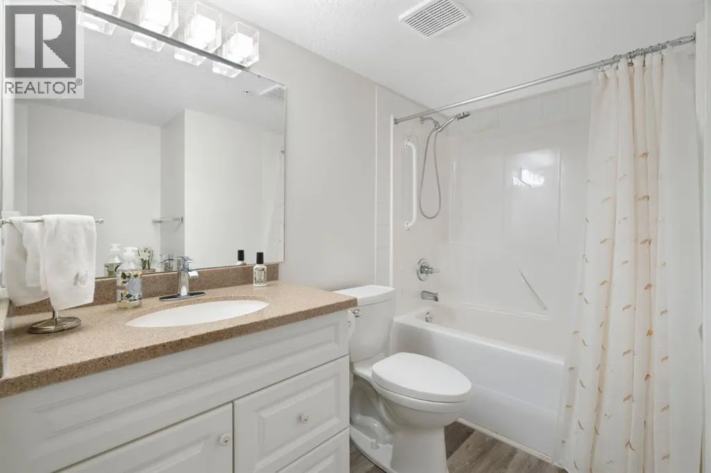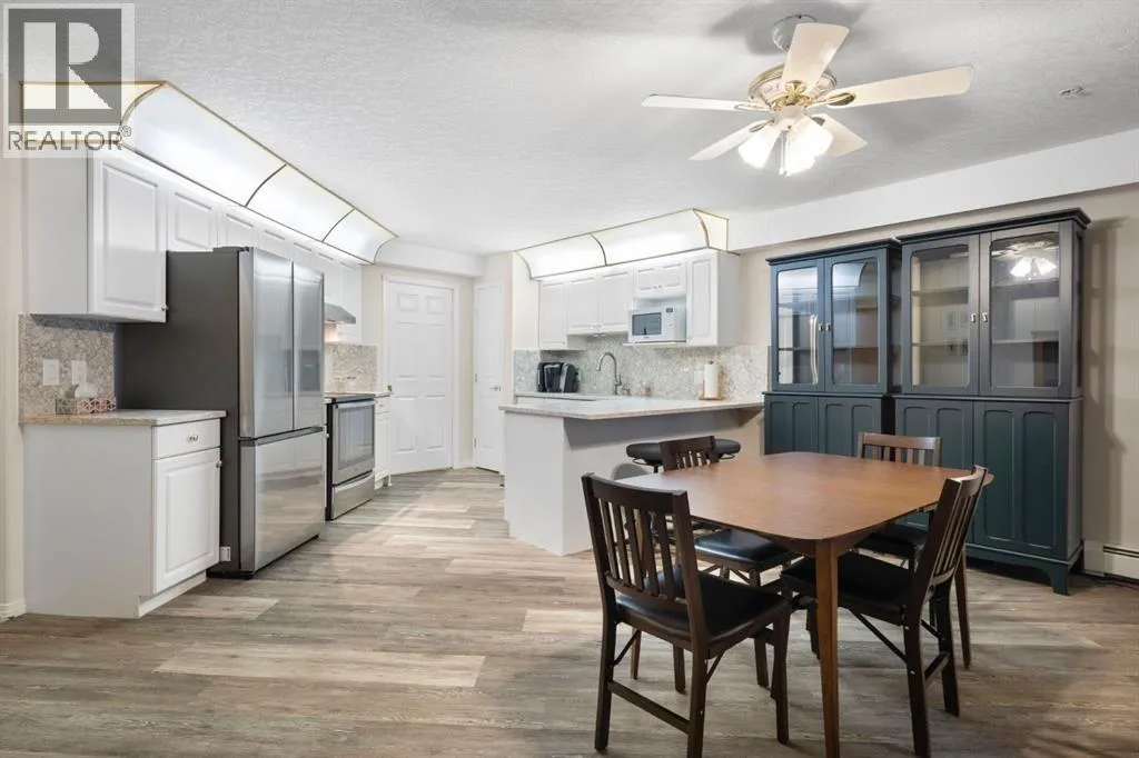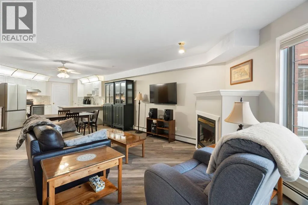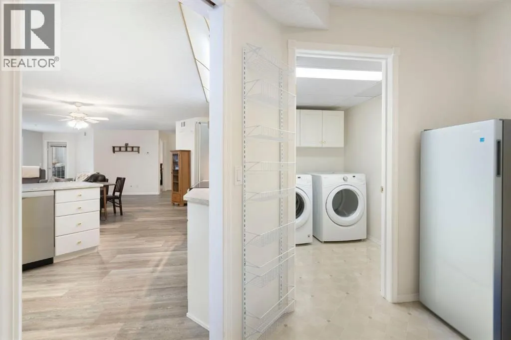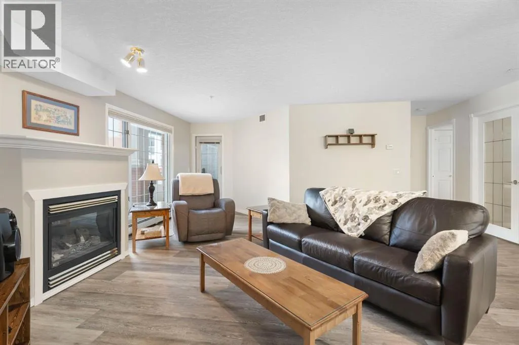 Located in one of the most desirable 55+ complexes the south has to offer, this amenities-loaded building provides a unique lifestyle that you'll be sure to enjoy... welcome to Sierra's of Heritage. This unit offers 2 bedrooms, 2 bathrooms, 2 parking stalls, an out-of-unit storage locker, a full-sized kitchen, direct access to the west-facing courtyard, and upgrades throughout! This complex conveniently INCLUDES ALL UTILITIES in the condo fee as well as the cost of all your luxurious amenities. At the entrance, you're welcomed with updated paint (2024) on the walls, ceiling, baseboards, and trim, vinyl flooring, a front closet, and a spacious open-floor concept. The large kitchen has been upgraded with newer appliances (2024) and newer quartz countertops with a matching quartz backsplash (2024). With plenty of cabinetry and a generous pantry, you'll be able to bring all your cooking appliances with you for this transition. Some of the cabinets have also been upgraded with roll-out drawers for easy access and convenience. Walking through your large pantry, you have an additional stand-up freezer and access to your laundry room with a side-by-side washer/dryer. Off the kitchen, you have a dining space that's open to your living room, featuring a gas fireplace and access to your ground-floor patio that has direct access to the west-facing courtyard! With this ground-floor unit, you no longer need to trade your backyard for a balcony; this unit provides the luxury of an outdoor living space that you can walk right onto and enjoy.Off the living space, you have the multi-purpose secondary bedroom or den/office, featuring french doors and a closet. Nearby, you also have an updated 4-piece bathroom and linen closet. The primary bedroom features a west-facing window, enough room for a king-sized bed, and a 4-piece ensuite with a proper walk-in closet. Both toilets have been upgraded to chair height. This unit eliminates the need to compromise. Offering a full-size kitchen, p antry, proper laundry room, courtyard access, and 1,160 sq/ft of living space, this is a great place to call home. The building amenities include a pool, hot tub, gym, library, craft room, theatre room, pool tables, poker table, dart board, car wash, bike storage, and an amazing woodshop. (id:27476)