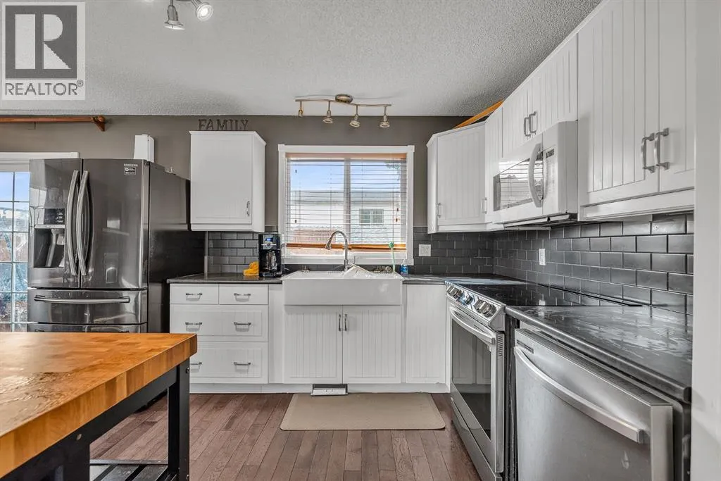 Welcome to 9883 Athens Road SE â a beautifully updated bi-level home situated on a generous corner lot. Offering over 1,680 sq. ft. of developed living space, this 4-bedroom, 2-bathroom property blends comfort and style with thoughtful updates throughout. The main living areas showcase gleaming hardwood floors, sleek white cabinetry, and a striking wood burning fireplace that creates a warm, inviting atmosphere. Natural light fills every corner of the home, highlighting the modern finishes and functional layout. Step outside to enjoy your private backyard retreat, perfect for entertaining. A large deck is ideal for summer barbecues, with a dedicated hot tub area, garden planters, and plenty of green space. The oversized double detached garage, with convenient side alley access, provides excellent parking and storage solutions. Additional highlights include basement laundry facilities and the advantage of a large corner lot measuring over 57 feet wide and more than 100 feet deep â offering both space and privacy. This home is also ideally located just a short drive to retail, shopping, public transit, and major highways including Deerfoot Trail and Macleod Trail. Families will appreciate the close proximity to many excellent schools such as Acadia School, St. Cecilia (Bilingual) Elementary, David Thompson School, Southeast Elementary Campus, South Middle School Campus, R. T. Alderman School, Maple Ridge School, Willow Park School, Janus Academy Junior/Senior High School, and Lord Beaverbrook High School. Nearby shopping and dining options include Southcentre Mall, Deerfoot Meadows with Costco, IKEA, and a wide selection of restaurants, plus endless choices along Macleod Trail. Recreation amenities such as the Acadia Recreation Complex, Alberta Tennis Centre courts, Trico Centre pool, and Sue Higgins Dog Park are all close at hand. A versatile and stylish property in a desirable Calgary community â welcome home! (id:27476)