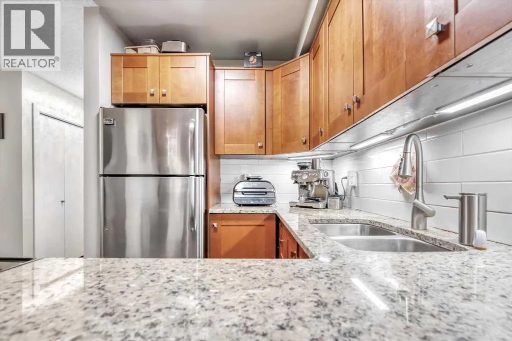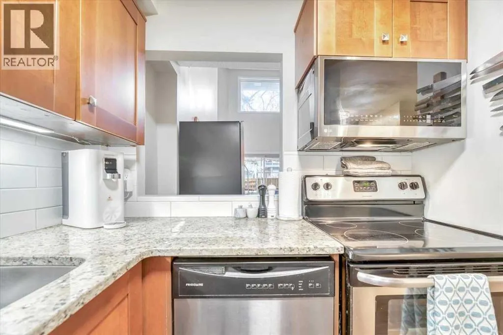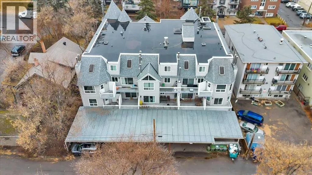 This is a standout spacious and upgraded unit with must-have features. Starting with the ideal CENTRAL LOCATION on a quiet street in Lower Mount Royal with easy access to restaurants, shops, downtown, and main roads. Everything you need is close by, including Mount Royal School, trendy 17th Avenue district, major transit routes, the Bow River Valley and more. This suite has modern finishes and functional layout with big separate living spaces allowing for many options to fit your lifestyle. The welcoming entrance gives access to a closet, half bathroom, upper level, and big dining space with a pantry to the side. The functional kitchen is complete with stainless-steel appliances, stone counter tops, soft close cabinets, and serving counter to a flex space. The grand living room features a two-story ceiling, fireplace, multiple west windows, and walkout to the patio. On the upper level the bonus space loft gives more options for living, work at home, gym, or a studio. The two bedrooms are big enough for a king bed and have great closet space. The main bathroom includes stylish finishes and shelving. Completing this full package is the laundry space with a top-end combination washer/dryer (non-venting). The 200+ sq ft private patio with evening sun is roofed, enclosed with fencing maintained by the condo, and finished with artificial turf.All spaces are bright, open, sunny, and easy keep. Most recent upgrades include the high-tech efficiency wash/dryer (no venting needed), microwave hood fan, and various light fixtures. The fireplace is cleaned and inspected annually. Parking spot is covered, closest to back entrance, and easy access drive-through. This is a quiet and solid concrete frame building. It is well-maintained and funded. Common rooms include bike storage, recycling, and a laundry room. This MOVE-IN READY home truly is a must-see. (id:27476)