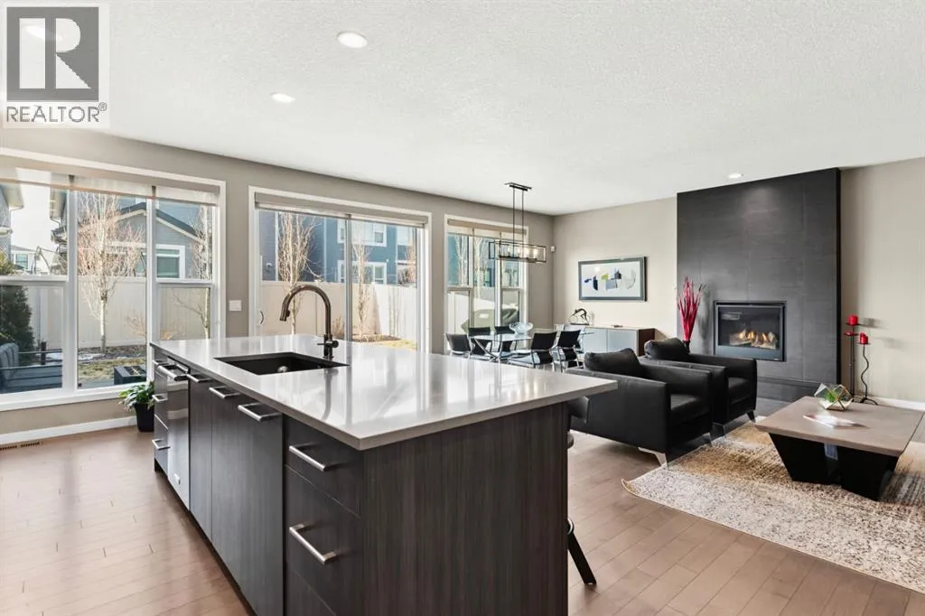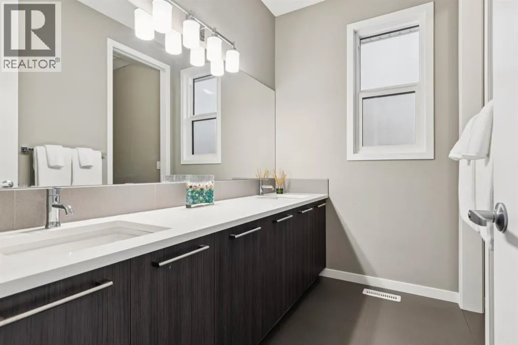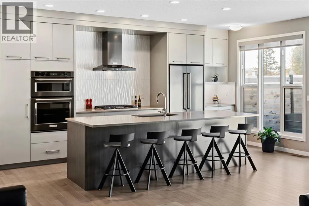 OPEN HOUSE - Sat Feb 14 (12-2pm) This Cedarglen home, just 7 years young, presents a sophisticated, contemporary design, clean and crisp throughout. Featuring a bright, open plan, 9 foot ceilings and 8 foot doors across all three levels, wide plank hardwoods, quartz countertops and an urban vibe throughout â SHARP! This two storey home, just seven years young .... SHOWS LIKE NEW, offering 3218 sq ft of living space over three levels, 3+1 beds PLUS a Bonus Room up, 3.5 baths and a fully developed lower level! Your family will love this space. This is a premier address, West Grove estates, a lightly travelled crescent in highly desirable West Springs.... a wonderful tot park steps away, great schools, shopping and services within walking distance of your new home! On arrival you will be struck by the exposed aggregate drive and walkway, and acrylic stucco â NICE! Entering you will love the 9â ceilings (on all 3 levels!), wide plank hardwoods and the BRIGHT, OPEN PLAN, with its western exposure and wall of windows across the back The main floor centers around the Great Room in back, a broad open space with a large family room, generous dining space and a striking kitchen. The kitchen features an abundance of counter space, a center island breakfast bar, S/S appliances including a gas cooktop and wall oven, a SPACE for ENTERTAINING⦠leading directly to your rear composite deck which spans the entire back of the house â NICE! Leading upstairs you will find a large Bonus Room and three beds. The primary retreat is generous in size and features a 5pc en suite complete with quartz countertops, a soaker tub, free-standing seamless glass shower and a large walk-in closet with built-ins. The two additional beds up are also generous in size and share a full 5 pc bath. The lower level has been professionally developed and offers a broad open rec room which will easily accommodate a media space and/or fitness space as you choose, plus a guest bedroom and full bath. (id:27476)