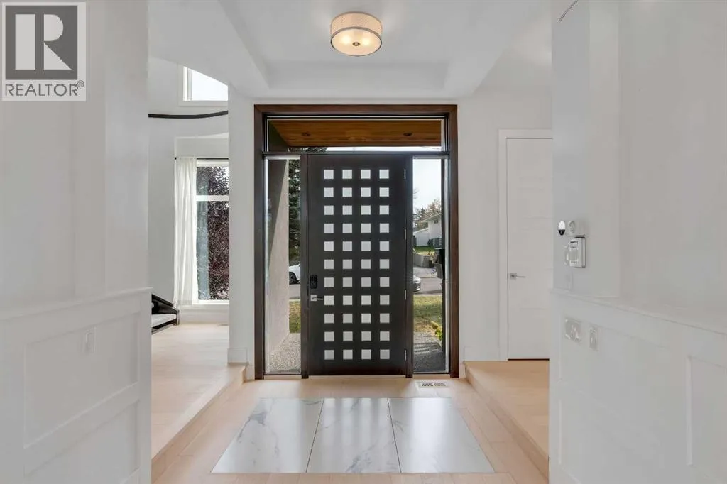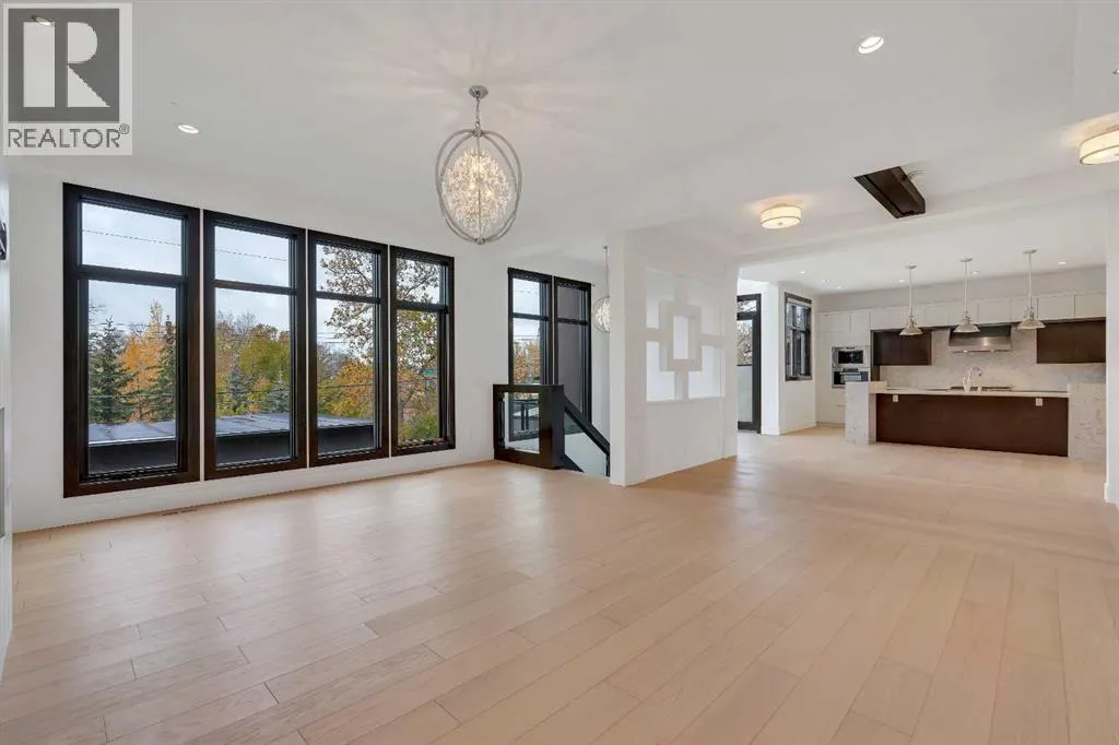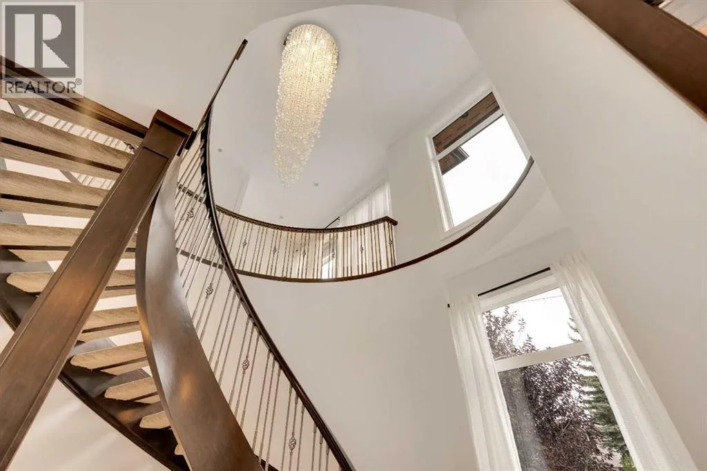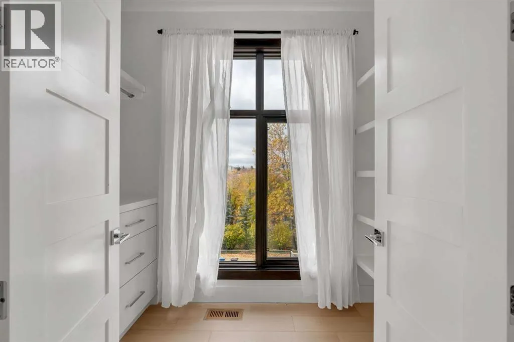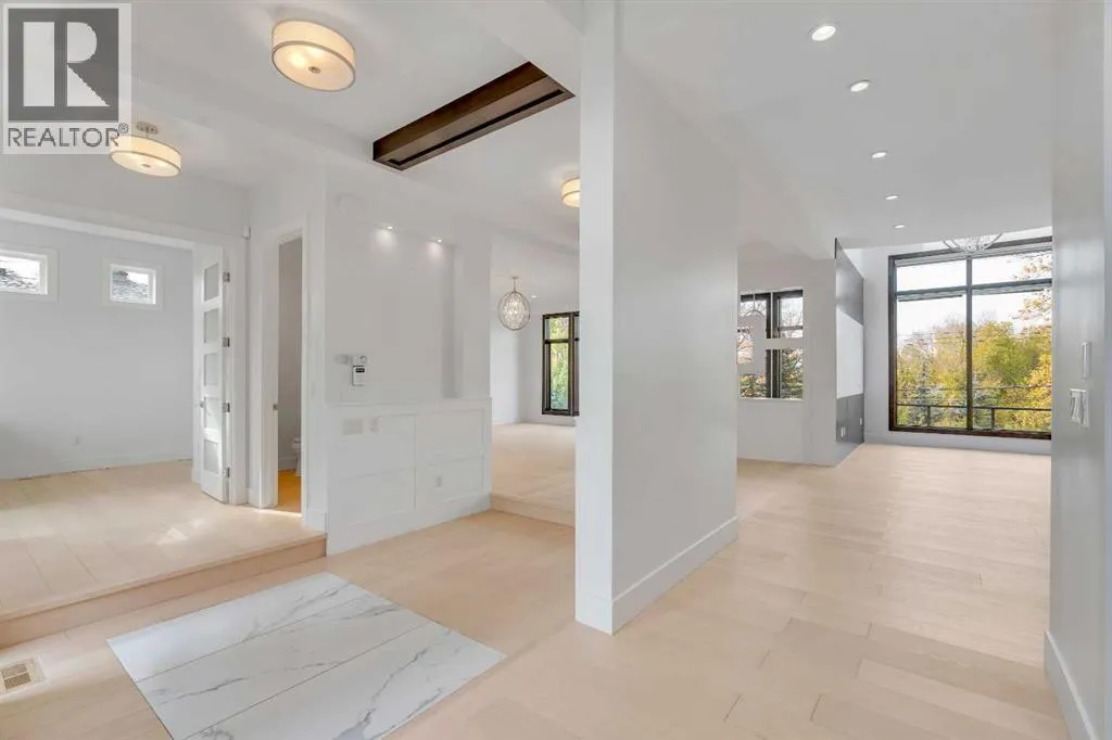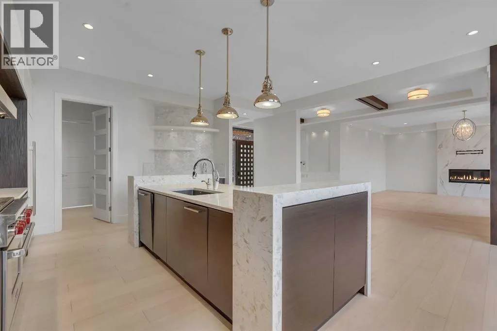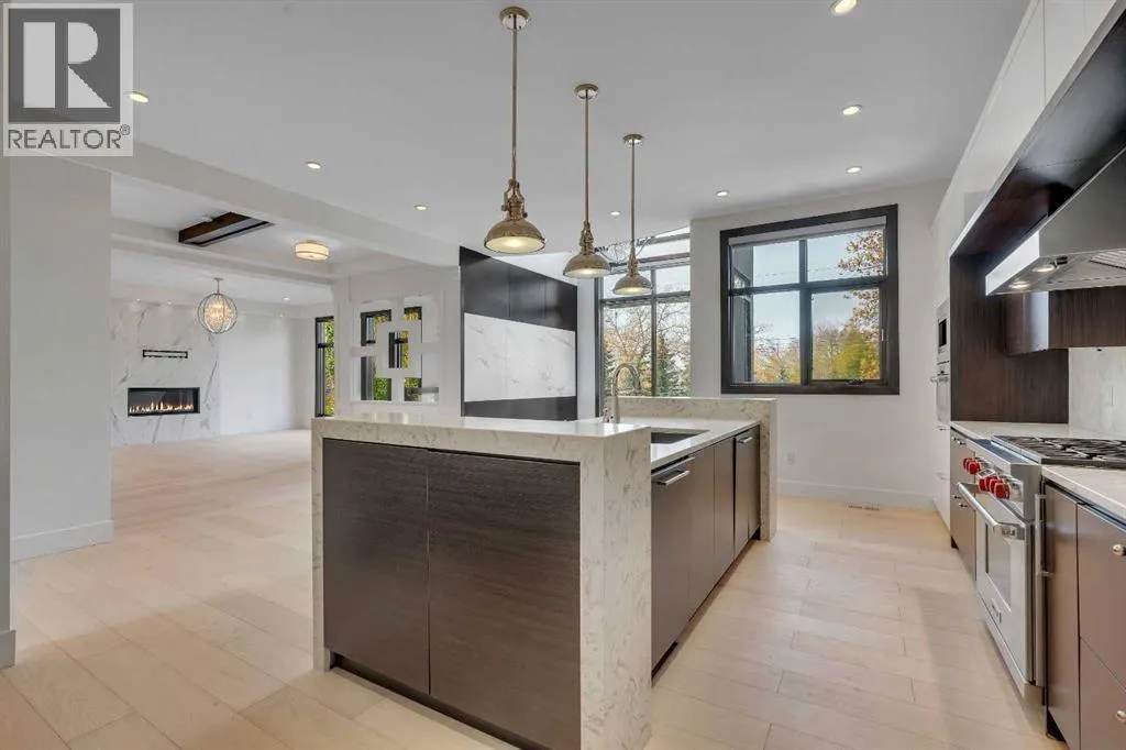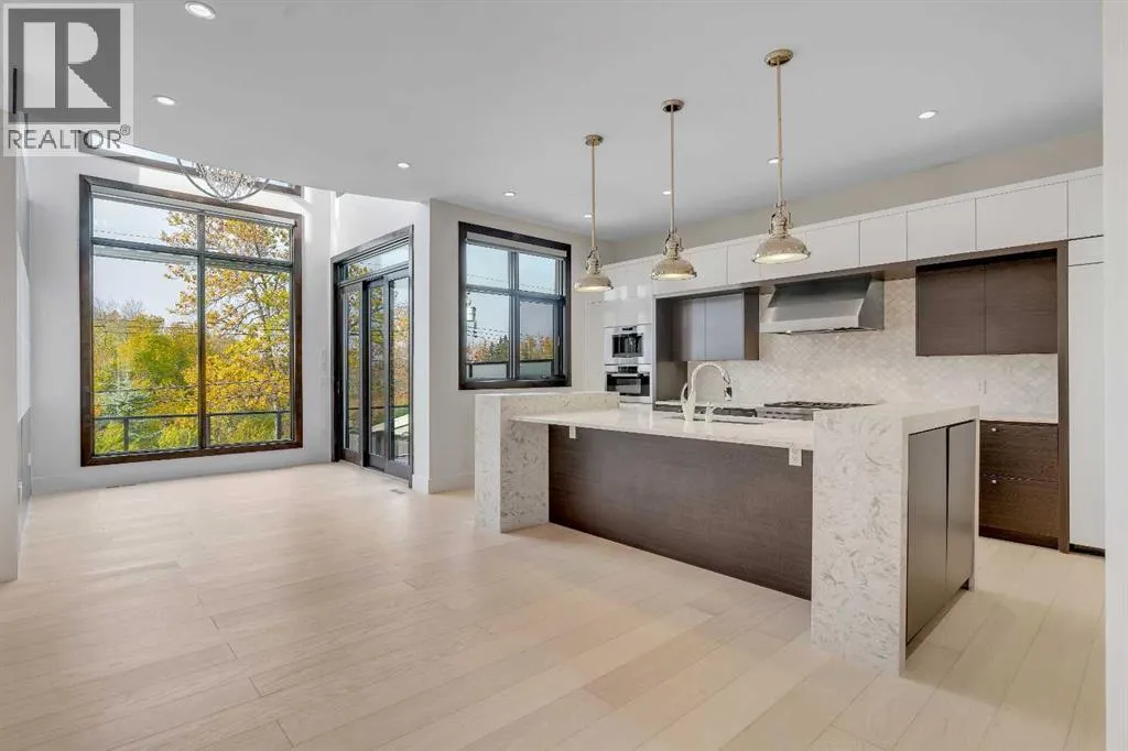 The perfect harmony of sophistication, light & function, this luxurious inner-city residence offers over 4,800 sq. ft. of refined living space backing west amid treetop outlooks & glowing sunset skies. A dramatic entry sets the tone with wide plank hardwood & a marble inlay, leading to soaring ceilings framed by custom millwork, exposed beams & black-clad windows that capture every nuance of daylight. French doors open to a private office detailed with built-ins, creating an ideal work-from-home sanctuary. The heart of the home is an exquisite designer kitchen that balances modern minimalism with warmth, showcasing pristine white cabinetry contrasted by rich wood accents, a waterfall-edge granite island & professional-grade Wolf appliances including a 6-burner gas range, steam oven & built-in espresso system. A curved wet bar & walk-through butlerâs pantry enhance the homeâs entertaining flow. Beyond, the dining roomâs double-height ceiling, sculptural chandelier & wall of glass doors invite connection between indoors & out, while an automated awning provides shade over the upper deck for sunset dinners. The adjoining living room blends quiet luxury with comfort around a sleek linear fireplace wrapped in full-height marble, its ambiance carried by soft recessed lighting & serene west views. Ascend the glamorous curved staircase illuminated by a cascading crystal chandelier to the upper level. French doors lead to a sumptuous primary retreat where a private balcony, spa-inspired ensuite with steam shower & soaker tub, and a custom dressing room create a boutique-hotel experience. 2 additional bedrooms, each with its own ensuite, complete this level. The fully finished walkout lower level continues the homeâs refined aesthetic, offering a seamless blend of comfort & sophistication. Heated epoxy floors provide quiet warmth underfoot, while a sleek wet bar invites easy entertaining & relaxed evenings with friends. The spacious recreation area is ideal for movie nights o r game-day gatherings, complemented by a well-appointed fourth bedroom & a stylish full bath for guests. A versatile den adds flexibility for a gym, yoga studio or private theatre, & dual stairwells connect this level effortlessly to the rest of the home for exceptional flow. Outside, the fenced west yard offers ample green space for relaxation or play, with a detached double garage featuring its own electrical panel, drive-through door & additional RV parking. Thoughtful upgrades include remote blinds, smart thermostats, tankless water heating, central air conditioning, in-floor boiler heat, sump pump & central vacuum. Perfectly positioned within Hounsfield Heights/Briar Hill, this exceptional property offers unmatched access to parks, top schools, SAIT, Kensington, the Bow River pathway system, North Hill Centre, hospitals, downtown & the mountains beyondâall wrapped in elevated design & timeless luxury! (id:27476)