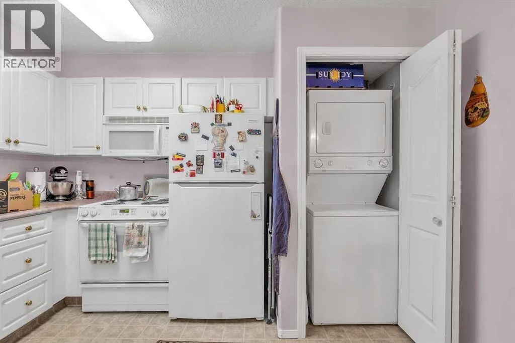 Welcome to Legacy Estates, a vibrant and welcoming 55+ community. This top-floor unit offers a spacious and functional layout, with an open-concept living and dining area that flows into a well-equipped kitchen featuring a generous walk-in pantry and convenient in-suite laundry with a stackable washer/dryer. The bedrooms, along with the private balcony, overlook the peaceful courtyard greenspaceâperfect for enjoying a morning coffee or some fresh air. The home is complete with a large 4 piece bathroom. Recent updates include newer carpeting and a newer refrigerator, offering added comfort and peace of mind. Legacy Estates is known for its strong sense of community and an impressive list of amenities: a dining hall, games room, library, craft rooms, hair salon, fitness rooms, and even a bistro in the lobby. There's also a guest suite available for visitors. Located just minutes from shopping, restaurants, public transportation, and all other amenities, this is a fantastic opportunity to enjoy living in a well-managed, friendly environment. Donât miss your chance to own this affordable top-floor unit in one of the city's most welcoming senior communities! (id:27476)