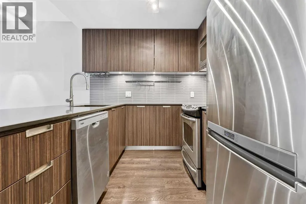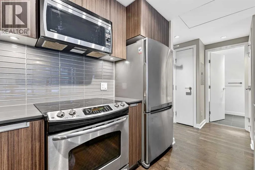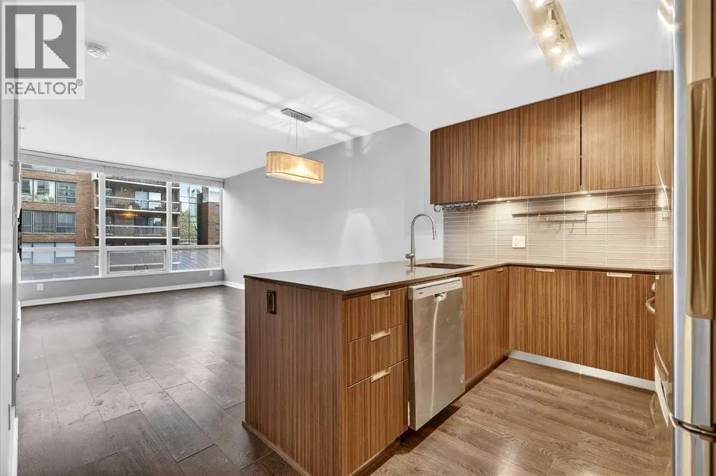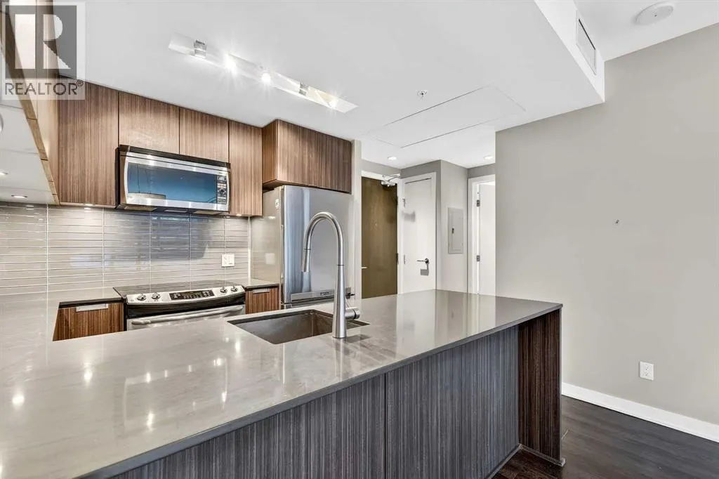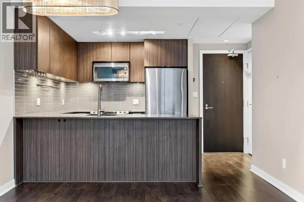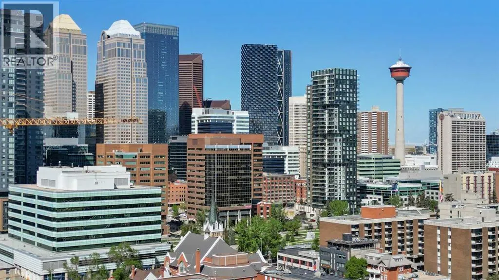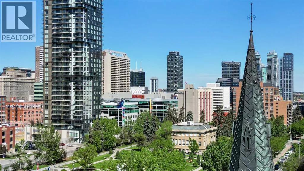 This stylish 1-bedroom condo in the highly regarded Calla building offers an exceptional urban lifestyle in the heart of downtown Calgary. Ideally located directly across from Beaulieu Gardens and the historic Lougheed House, the building provides a peaceful, park-adjacent setting while remaining just steps from Calgaryâs downtown core, Stampede Grounds, public transit, dining, shopping, and nightlife. The Calla is a well-managed, concrete-constructed building known for its quality and quiet living environment. Residents enjoy an elegant lobby and an impressive selection of amenities, including a fully equipped fitness centre, yoga studio, concierge service, guest suite, and secure bike storage. Inside, the condo features 9-foot ceilings, central air conditioning, and floor-to-ceiling south-facing windows that flood the space with natural light and showcase beautiful city views, including front-row views of the Calgary Stampede fireworks. The modern kitchen is thoughtfully designed with full-height cabinetry, quartz countertops, stainless steel appliances, and a peninsula with breakfast bar, offering both functionality and style. The kitchen flows seamlessly into the dining area and oversized living room, creating an inviting space for everyday living and entertaining. The living room opens onto a large private balcony, ideal for summer barbecues, outdoor dining, or relaxing while taking in the urban skyline. The spacious bedroom continues the bright, open feel with large windows and dual closets providing ample storage. A well-appointed 4-piece bathroom features contemporary finishes and low-flush plumbing. Additional conveniences include in-suite laundry, a titled underground parking stall, and an assigned storage locker. This property presents an outstanding opportunity for low-maintenance, upscale downtown living in one of Calgaryâs most desirable locations. (id:27476)