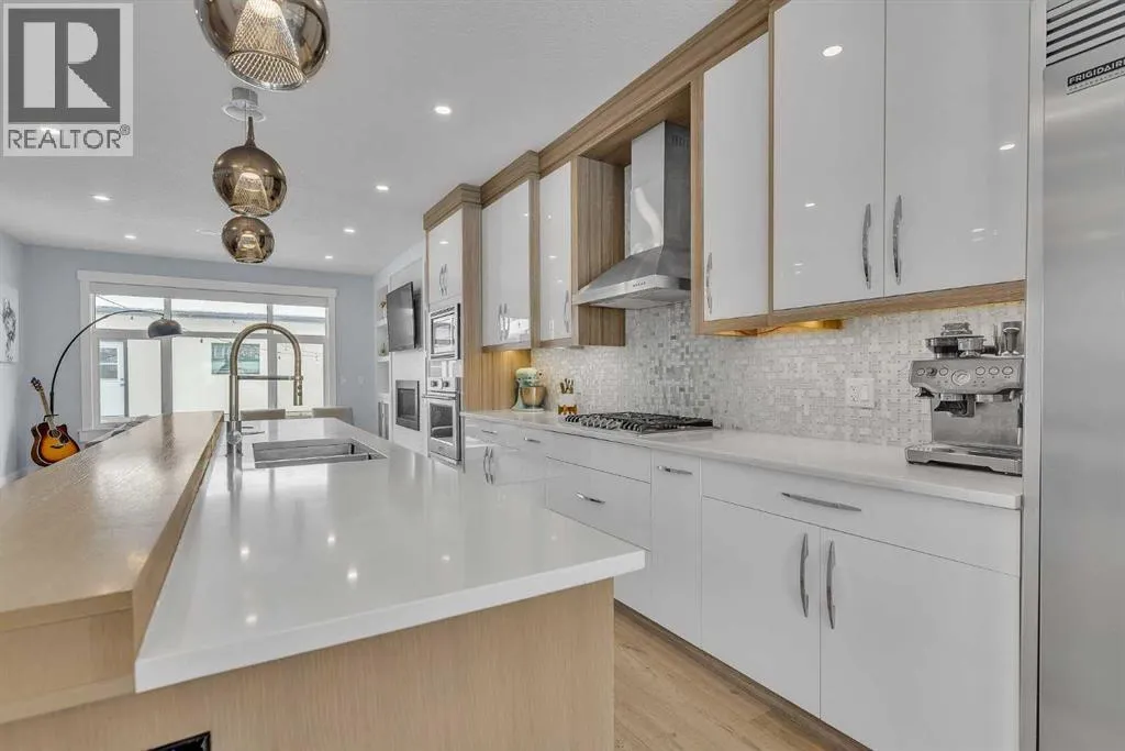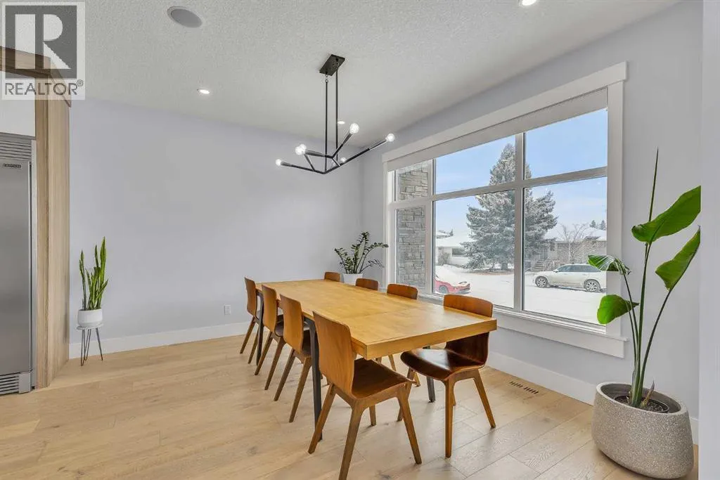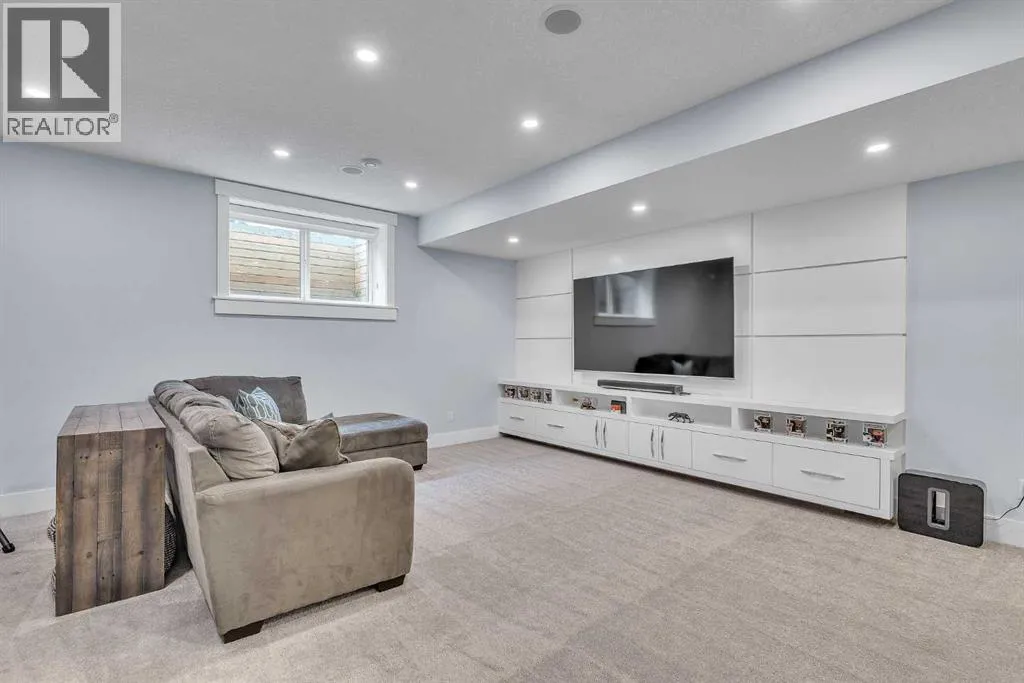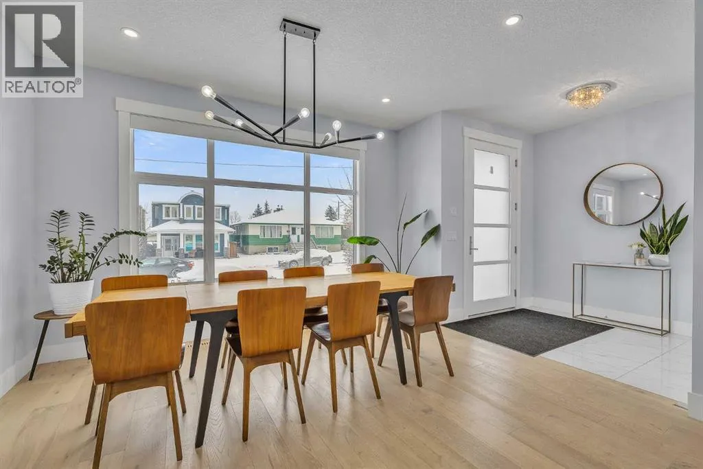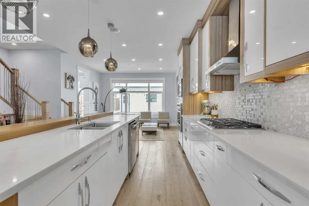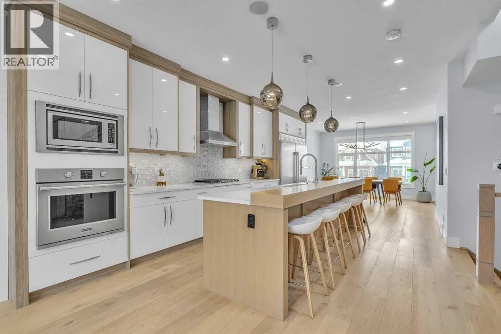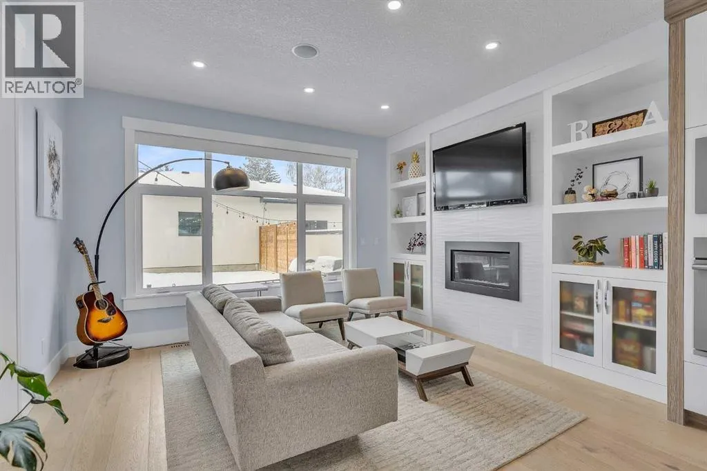 Upon entry, youâre welcomed by a spacious front formal dining area and distinctive hardwood flooring that flows throughout both the main and upper levels. The thoughtfully designed main floor showcases a striking hardwood staircase and a chef-inspired kitchen centered around an oversized quartz island with raised eating bar. The kitchen is further elevated by an extra-large, professional-grade fridge and freezer combination, offering exceptional storage and functionality for entertaining and everyday living. Additional main-floor features include ceiling speakers, a functional mudroom, a sleek modern linear fireplace with custom built-ins, and a convenient half bath.The upper level offers 9â ceilings throughout, anchored by a luxurious primary retreat with vaulted ceilings, a beautifully appointed ensuite featuring heated floors, and a walk-in closet. Two generously sized secondary bedrooms, a full bathroom, and an upper laundry room with ample cabinetry, counter space, and a utility sink complete this level.The fully developed basement is ideal for entertaining, featuring a large media room with custom built-ins, a wet bar, a fourth bedroom, and a full bathroom, along with hydronic heated floors.Enjoy the fully landscaped, west-facing backyard, all just minutes from downtown, schools, and shopping. This exceptional infill home delivers modern living with standout features throughout. (id:27476)