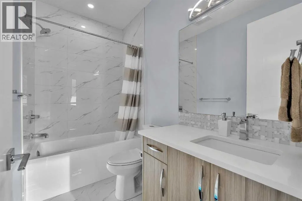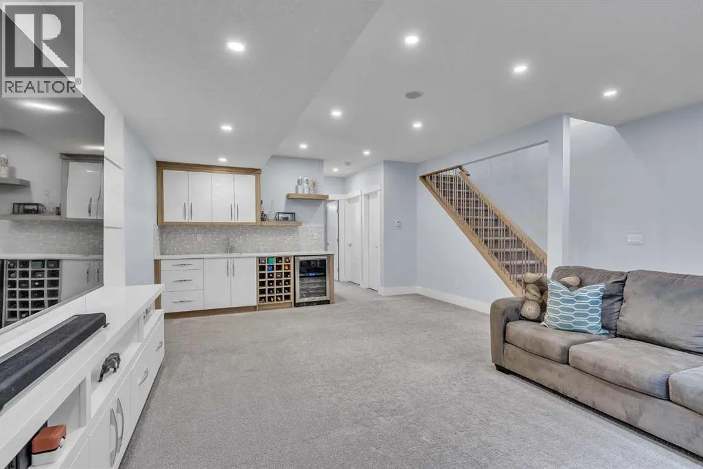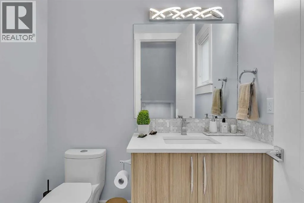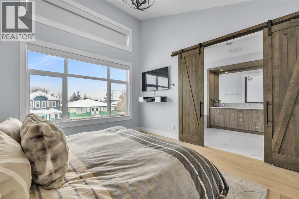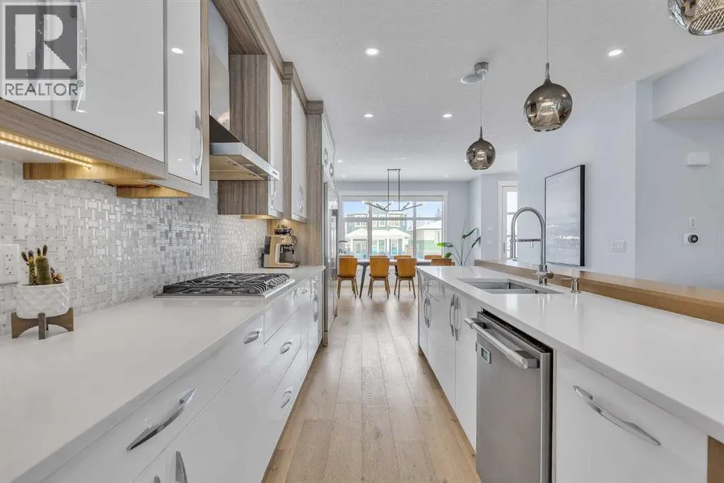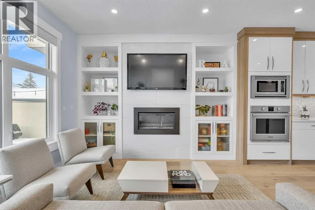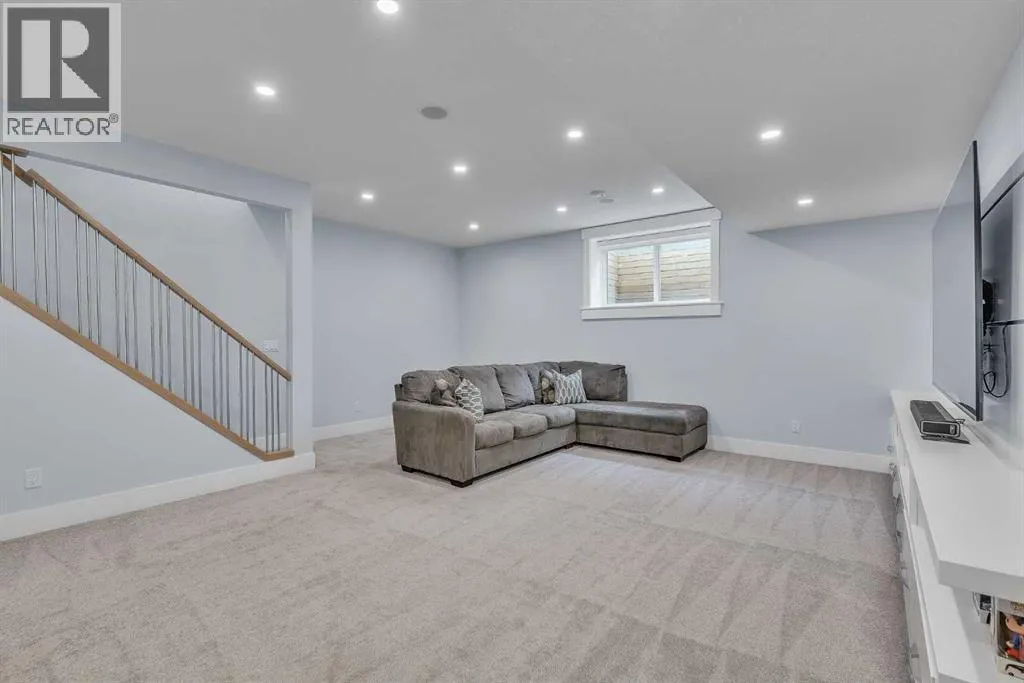 Upon entry, youâre welcomed by a spacious front formal dining area and distinctive hardwood flooring that flows throughout both the main and upper levels. The thoughtfully designed main floor showcases a striking hardwood staircase and a chef-inspired kitchen centered around an oversized quartz island with raised eating bar. The kitchen is further elevated by an extra-large, professional-grade fridge and freezer combination, offering exceptional storage and functionality for entertaining and everyday living. Additional main-floor features include ceiling speakers, a functional mudroom, a sleek modern linear fireplace with custom built-ins, and a convenient half bath.The upper level offers 9â ceilings throughout, anchored by a luxurious primary retreat with vaulted ceilings, a beautifully appointed ensuite featuring heated floors, and a walk-in closet. Two generously sized secondary bedrooms, a full bathroom, and an upper laundry room with ample cabinetry, counter space, and a utility sink complete this level.The fully developed basement is ideal for entertaining, featuring a large media room with custom built-ins, a wet bar, a fourth bedroom, and a full bathroom, along with hydronic heated floors.Enjoy the fully landscaped, west-facing backyard, all just minutes from downtown, schools, and shopping. This exceptional infill home delivers modern living with standout features throughout. (id:27476)