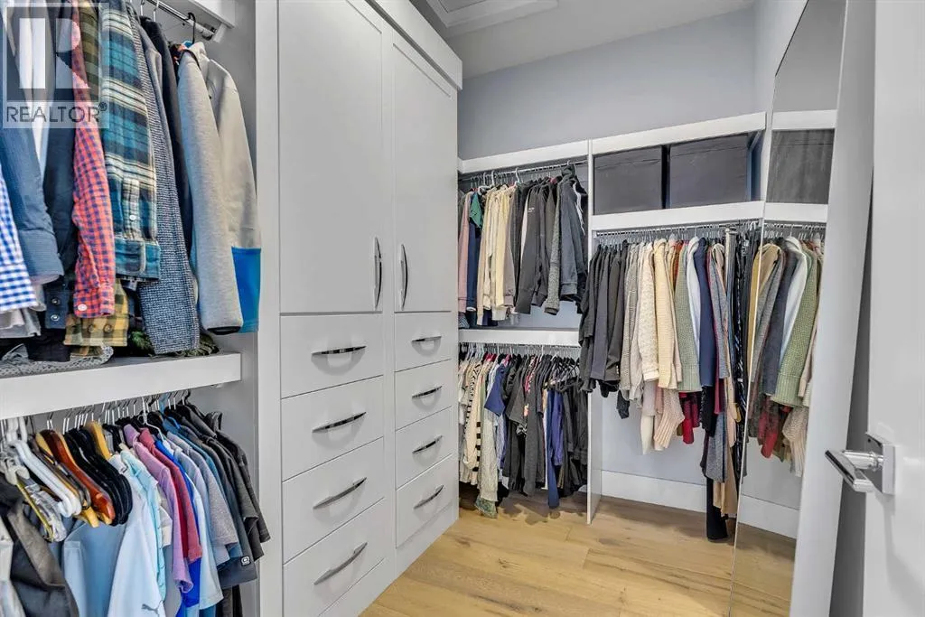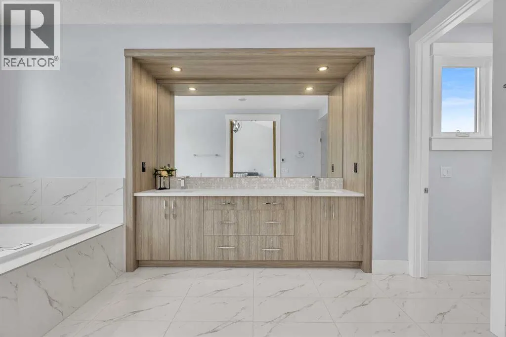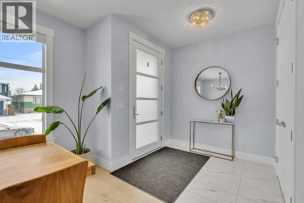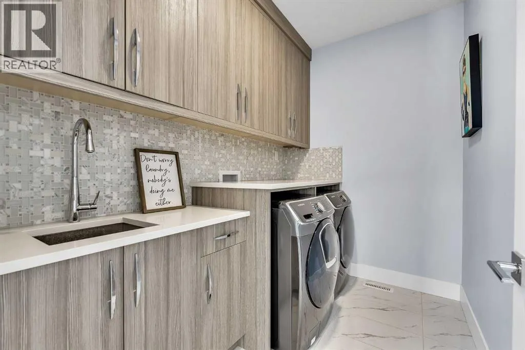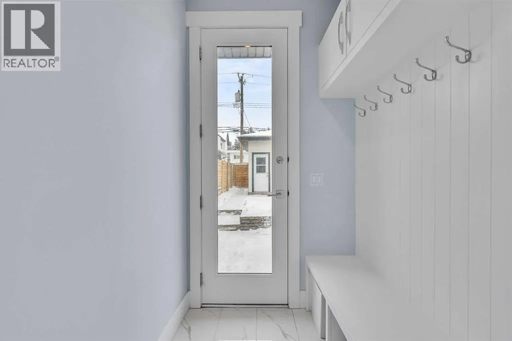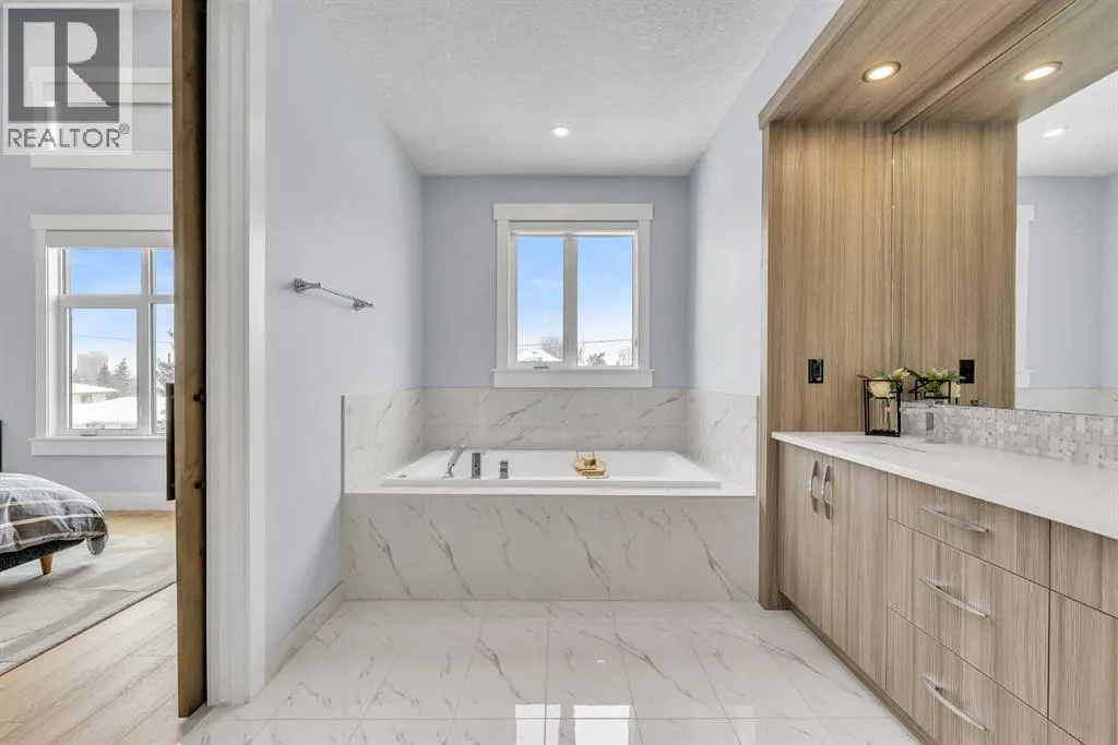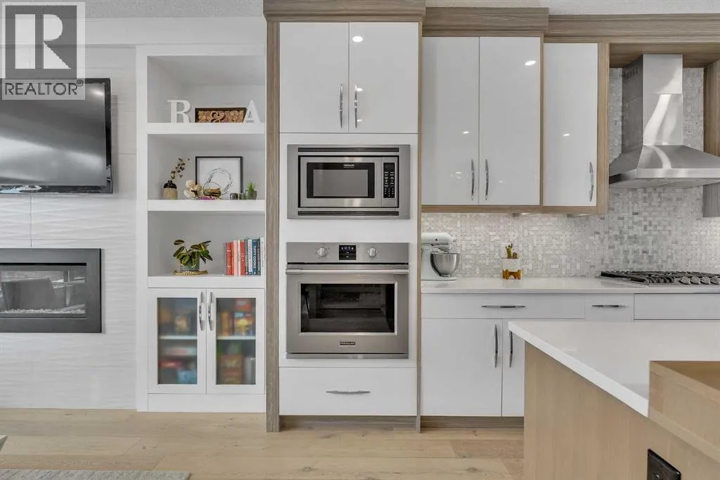 Upon entry, youâre welcomed by a spacious front formal dining area and distinctive hardwood flooring that flows throughout both the main and upper levels. The thoughtfully designed main floor showcases a striking hardwood staircase and a chef-inspired kitchen centered around an oversized quartz island with raised eating bar. The kitchen is further elevated by an extra-large, professional-grade fridge and freezer combination, offering exceptional storage and functionality for entertaining and everyday living. Additional main-floor features include ceiling speakers, a functional mudroom, a sleek modern linear fireplace with custom built-ins, and a convenient half bath.The upper level offers 9â ceilings throughout, anchored by a luxurious primary retreat with vaulted ceilings, a beautifully appointed ensuite featuring heated floors, and a walk-in closet. Two generously sized secondary bedrooms, a full bathroom, and an upper laundry room with ample cabinetry, counter space, and a utility sink complete this level.The fully developed basement is ideal for entertaining, featuring a large media room with custom built-ins, a wet bar, a fourth bedroom, and a full bathroom, along with hydronic heated floors.Enjoy the fully landscaped, west-facing backyard, all just minutes from downtown, schools, and shopping. This exceptional infill home delivers modern living with standout features throughout. (id:27476)
