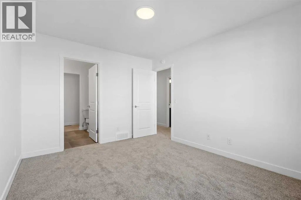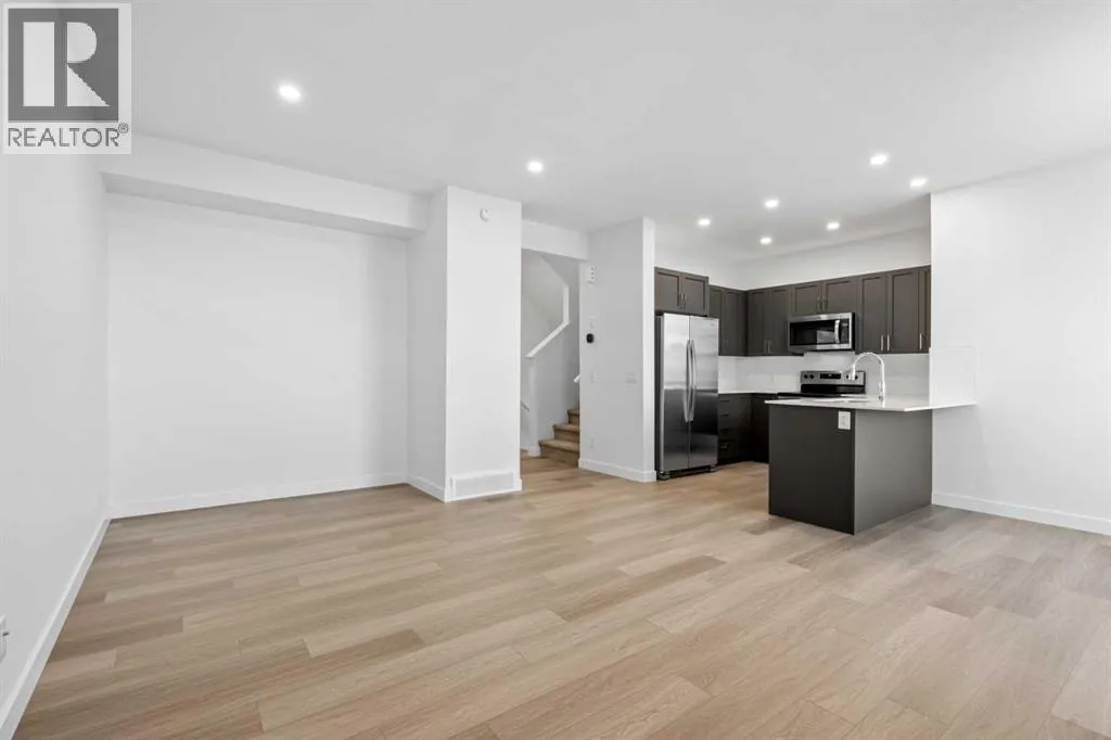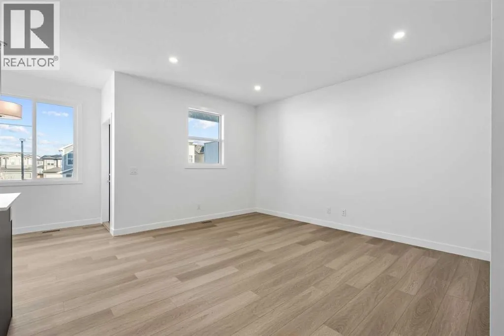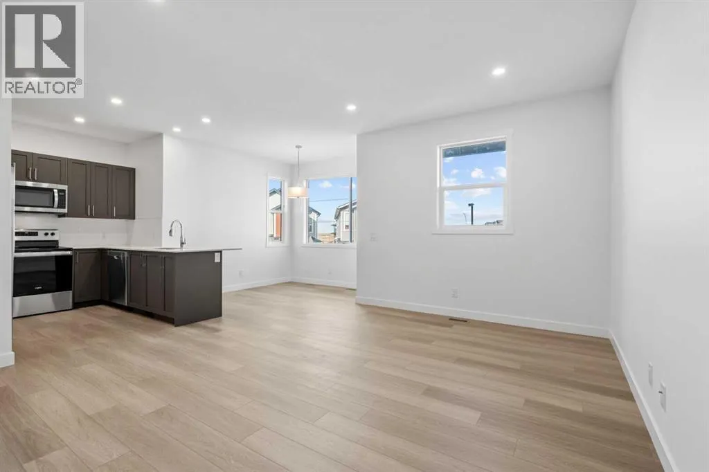 NEW BUILD 3-STOREY TOWNHOME | END UNIT NEAR GREEN SPACE | LOW CONDO FEES | 3 BED / 3.5 BATH / 1544 SQ FT | SINGLE ATTACHED GARAGE | Welcome to the Townsend 1 by Minto Communities, an award-winning Canadian builder for over 70 years! Belvedere Rise offers an intimate collection of just 56 thoughtfully designed townhomes located in the growing community of Belvedere, steps from East Hills Shopping Centre. This end-unit home offers added privacy and is ideally positioned near green space, combining modern design, everyday convenience, and excellent value for families and professionals alike.The main living level showcases a bright and functional layout designed for both comfort and entertaining. The kitchen is well-appointed with a pantry, stainless steel appliances, and peninsula counter space, seamlessly connecting to the dining area located at the front of the home with direct access to a private balcony. Adjacent to the kitchen and dining area is a spacious living room featuring an additional flex space, ideal for a home office, reading nook, or play area. A convenient 2-piece bathroom completes this level.Upstairs, the upper floor is designed with privacy and functionality in mind. The spacious primary bedroom features a walk-in closet along with a 4-piece ensuite. The second bedroom also includes a walk-in closet and is serviced by another separate full bathroom. Upper-floor laundry adds everyday convenience and completes this well-planned level.The ground floor offers a large welcoming entryway, a third bedroom, and a 3-piece bathroomâideal for guests, a home office, or multi-generational living. This level also provides direct access to the single attached garage, keeping daily routines simple and efficient.Belvedere Rise fosters a true sense of community with its pedestrian pathways, nearby greenspace, and intimate scale, creating an environment where neighbours can easily connect. Located just steps from East Hills Shopping Centre, residents enjoy unmatc hed walkability to Costco, Walmart, banks, restaurants, and everyday essentialsâall just across the street. With quick access to major roadways and public transit, commuting downtown or around the city is effortless.Combining modern finishes, a functional three-storey layout, low condo fees, and an unbeatable location, this is a fantastic opportunity to secure a brand-new townhome in one of southeast Calgaryâs most convenient communities. Contact Mintoâs sales staff and book your visit today! (id:27476)