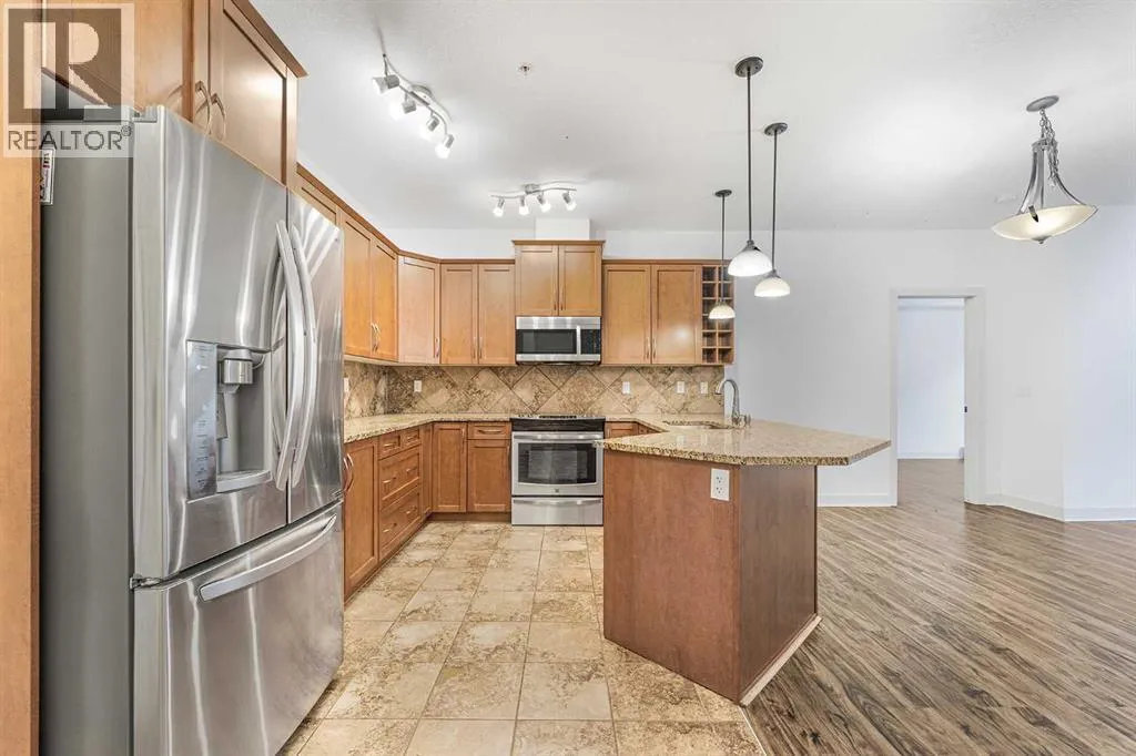 ** OPEN HOUSE: Saturday, 14 February at 1:00 - 3:00 pm and Sunday, 15 February at 2:00 - 4:00pm ** It is not often that we get units of this size available. Welcome to a refined main-floor corner unit in the heart of Aspenwoods. Featuring two-bedrooms, two-bathrooms this condo has an open-concept layout filled with natural light and finished with luxury vinyl plank flooring. The kitchen showcases granite countertops, stainless steel appliances, a built-in wine rack, and a convenient breakfast bar.The primary bedroom offers a walk through closet and private four-piece ensuite with soaker tub, while the second bedroom enjoys direct access to a full bathroom, ideal for guests or a home office. Additional features include in-suite laundry, two portable air conditioning units, titled underground parking, and two storage lockers and the unique option to purchase an additional titled parking stall.Residents enjoy excellent building amenities including two fitness centres, a guest suite, and ample visitor parking. Ideally located steps from scenic walking paths and within walking distance to Aspen Landing, with easy access to top-rated schools, recreation facilities, transit, and major commuter routes. (id:27476)