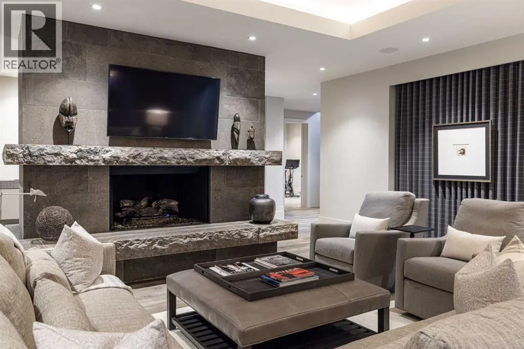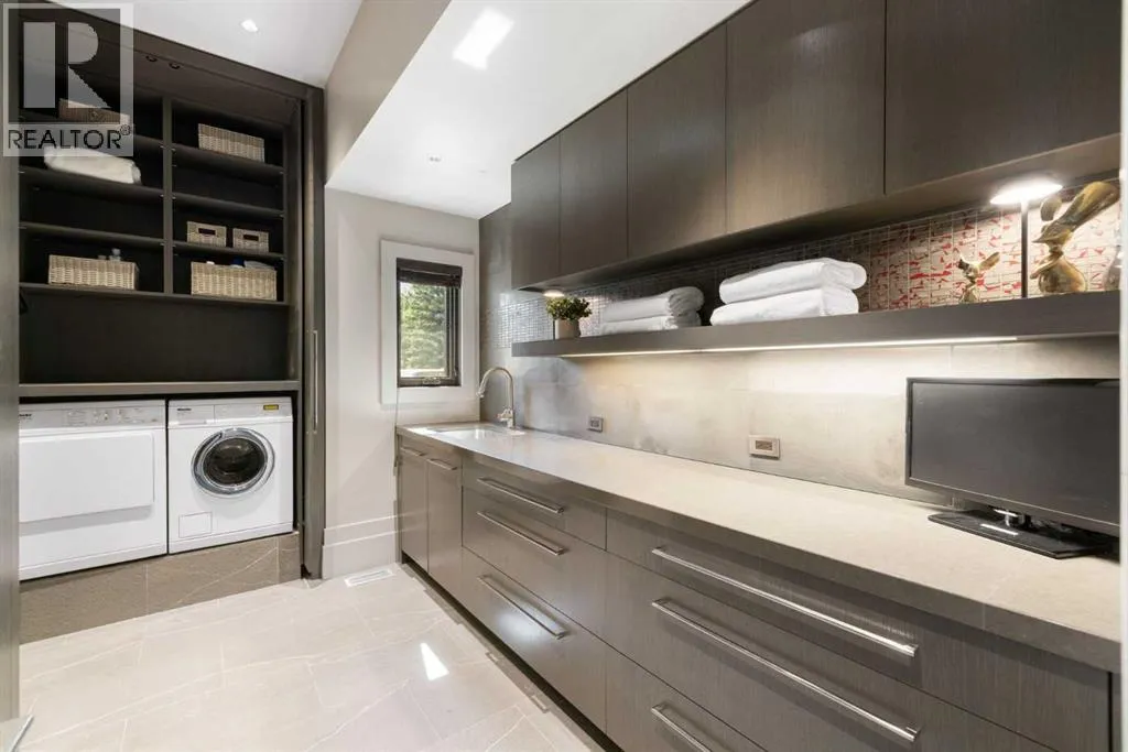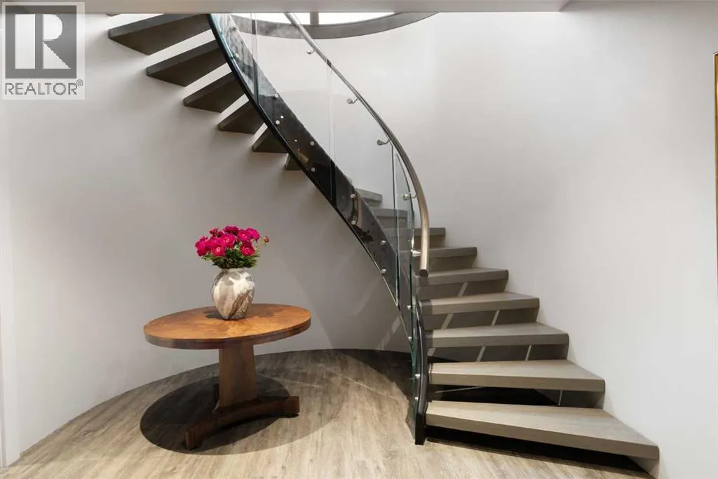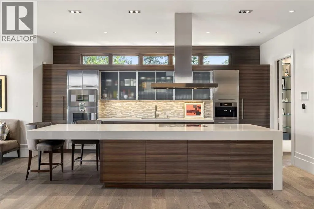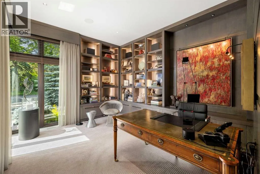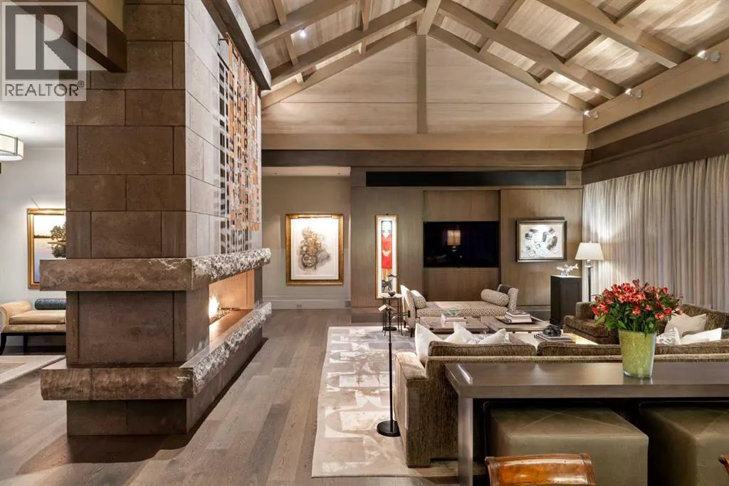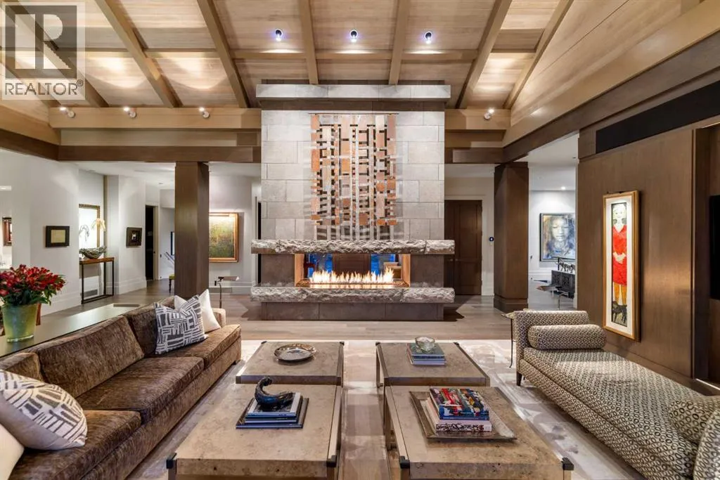 A rare offering where modern architecture & meticulous execution meet on one of Elbow Parkâs most prized riverfront lots. Situated on a coveted tree-lined street steps from river pathways, parks, top schools, vibrant restaurants & the downtown core, this is a once-in-a-lifetime opportunity to own one of Calgaryâs most architecturally significant homesâa perfect harmony of design, craftsmanship, & location.Thoughtfully designed by award winning architect Mark Burkart and custom built by Mission Custom Homes, this extraordinary residence offers over 6,600 sq ft of refined living space. The design is quietly sophisticated, blending natural materials & light-filled spaces to create a home of remarkable beauty & comfort. The exterior, clad in warm silver-to-charcoal Saint Marc limestone, copper roofing, and Meranti hardwood soffits lends a sense of permanence and quiet strength evoking the spirit of a small modern museum. A front courtyard with a tranquil reflecting pool invites you into the home, while the rear terrace creates a serene outdoor retreat overlooking the Elbow River. Inside, elegant proportions and rich finishes create an atmosphere of understated luxury. Soaring 19' ceilings define the great room, where a monumental limestone fireplace serves as a stunning focal point. A 30' retractable glass wall opens entirely to a heated limestone terrace with phantom screens, infrared heaters, & built-in speakers, perfect for year-round enjoyment and effortless indoor-outdoor living. The chefâs kitchen is both functional & striking, featuring custom tigerwood cabinetry, a cantilevered 13â Caesarstone island, and top-of-the-line Gaggenau and Miele appliances. A walk-in pantry, wet bar, & seamless flow to the dining area make the space ideal for entertaining or everyday living. The primary suite is a private riverside sanctuary with floor-to-ceiling windows, silk wall coverings, & heated marble floors. Its spa-caliber ensuite offers Bianca Carrera marble, a steam show er, a freestanding tub & a walk-in closet with custom cabinetry. Two exceptional home offices, a beautifully appointed laundry room, & an exquisite powder room complete the main floor. The lower level continues the homeâs thoughtful design with a floating oak staircase, spacious family/rec room anchored by a stunning four-sided limestone fireplace, three bedrooms each with a full ensuite, a professional-grade gym, a custom wine room & a 12-foot wet bar. Radiant in-floor heating & elevator access ensure comfort & convenience on every level. Advanced mechanical and smart home systems provide comfort & security, Crestron AV, Lutron lighting, triple-pane Lowen windows, a heated driveway, Viessmann boilers, a water filtration system, & backup generator. Professionally landscaped, the outdoor living spaces include three distinct patio areas: a limestone-encased hot tub, a rundle stone firepit patio surrounded by lush perennial gardens & built-in BBQ area. More than a home, this residence is about a lifestyle. (id:27476)