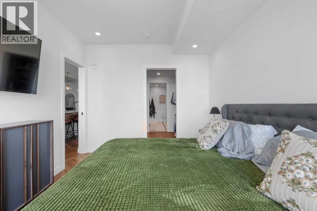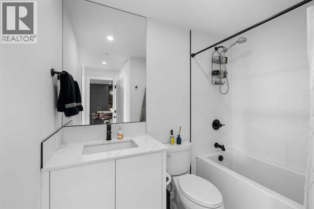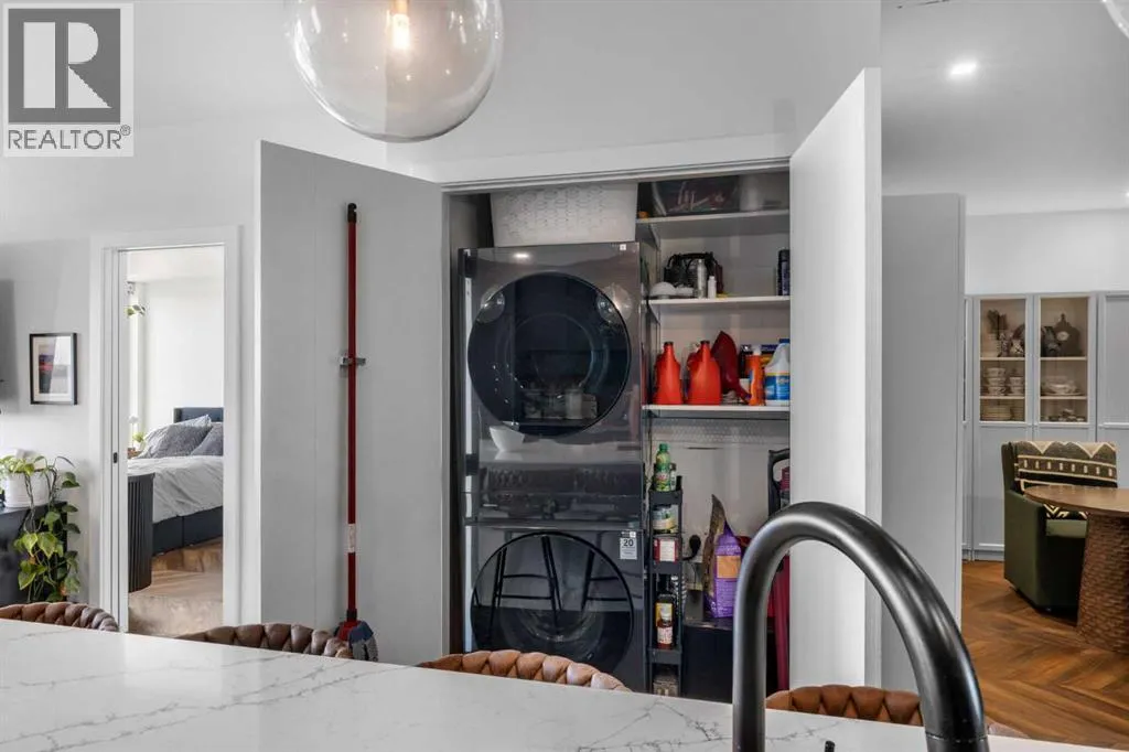 Discover sophisticated living in this upscale 2-bedroom, 2 bathroom condo nestled in the heart of West Springs. Perfect for professionals or downsizers, this concrete-built, low-maintenance residence offers quiet comfort, durability, and a prime location in a vibrant, walkable community. Step through the generous foyer into a sun-drenched open-concept layout featuring expansive windows and sliding glass doors that flood the space with natural light and showcase breathtaking views, including the mountains. The spacious living area opens seamlessly to a large balcony (one of the few private ones in the building), ideal for morning coffee or evening relaxation. The chef-inspired kitchen impresses with integrated stainless steel appliances, a gas range, and a large eat-up islandâperfect for entertaining. The adjacent dining room is both generous in size and versatile enough to serve as a home office or library. Retreat to the primary suite offering a large walk-in closet and a spa-like 4-piece ensuite with dual vanities and a walk-in shower. A second bedroom and a stylish 4-piece bath with deep soaker tub provide flexibility for guests or family. The flexibility of the bedrooms and bathrooms in this unit would also lend itself to two adults easily sharing the space. Youâll also appreciate the in-suite laundry and flooring with acoustic underlay throughout. Additional features include: air conditioning, 1 titled underground parking stall, EV charging stations & bike storage, ownerâs lounge on same level, lobby concierge, ground-level restaurants, shops, wellness studios, community gardens. Just minutes from Calgary French & International School, Webber Academy, Rundle College, and Ernest Manning High School, and quick access to Stoney Trail for weekend getaways. This quiet unit is extremely well-maintained and move-in ready, and combines luxury, lifestyle, and location into one exceptional offering. (id:27476)
