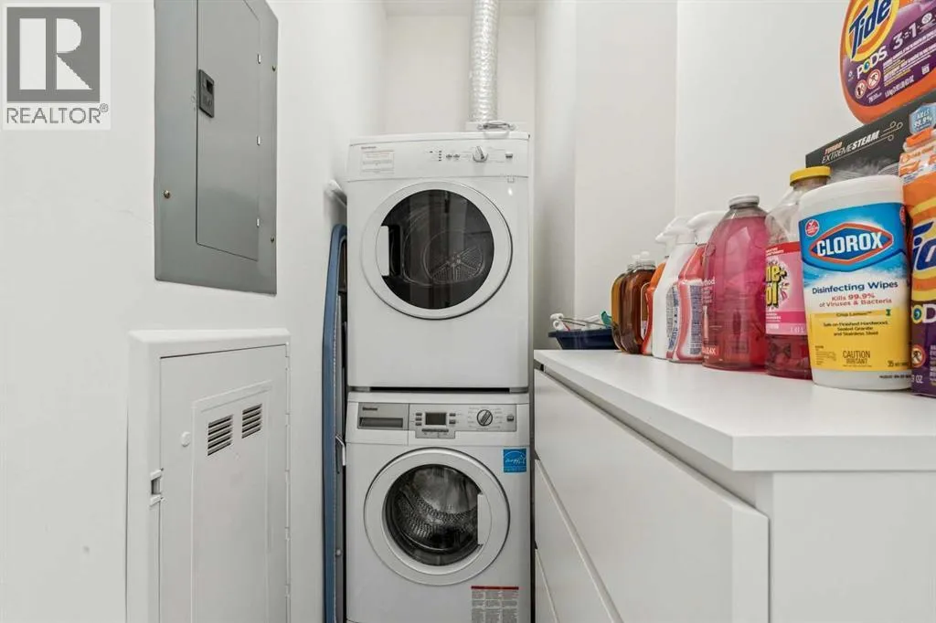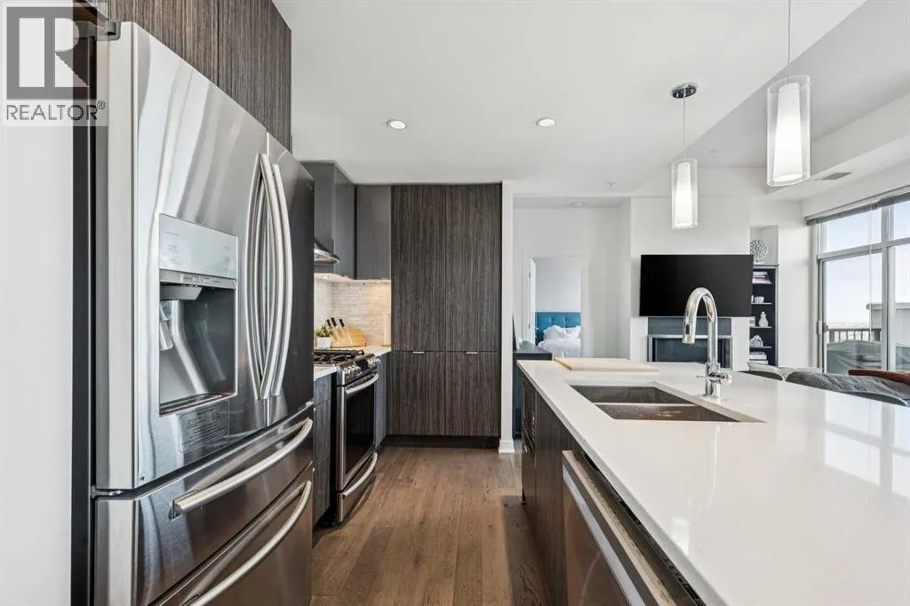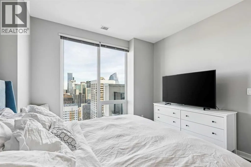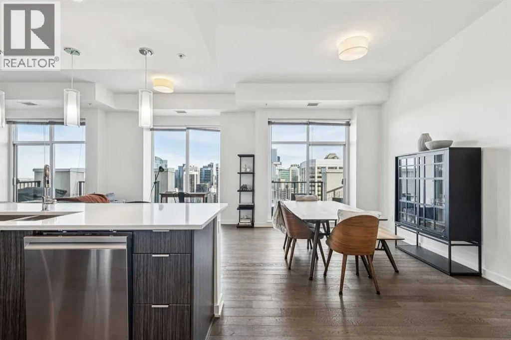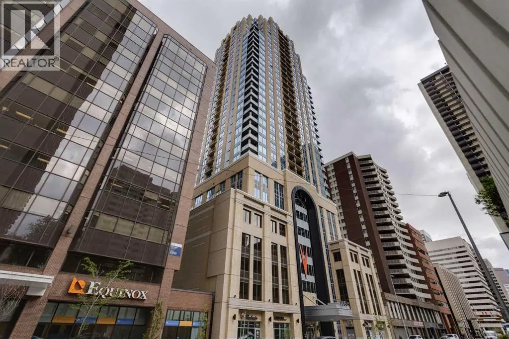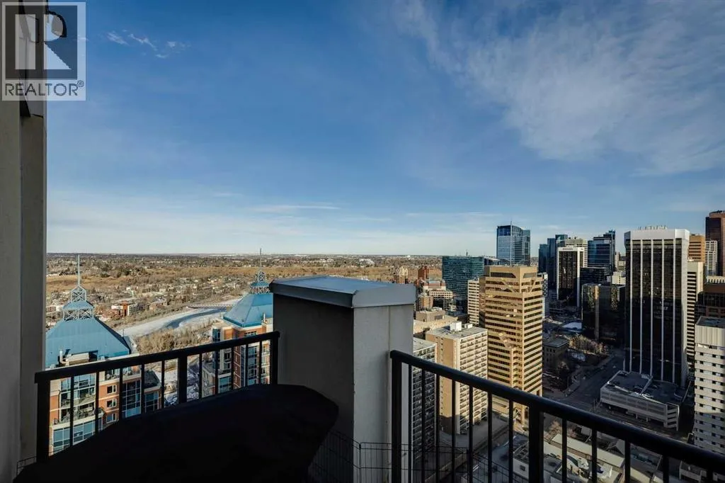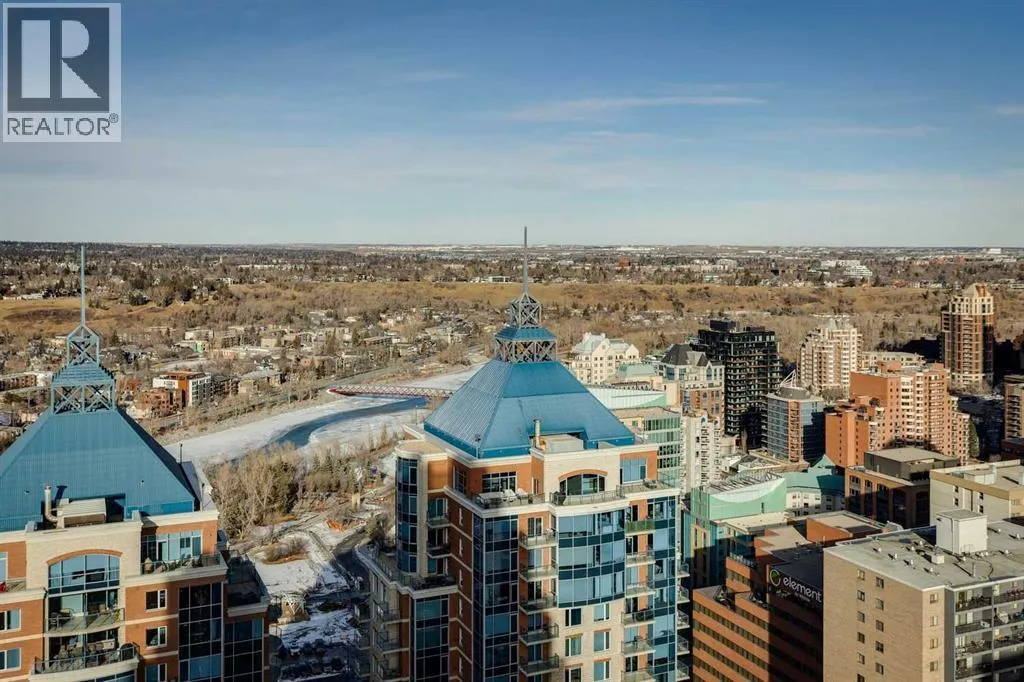 PRICE IMPROVEMENT! Experience elevated penthouse living at The Vogue, perched high above the cityâs financial core. This rare 2 bedroom, 2 bathroom residence features soaring vaulted ceilings, floor-to-ceiling windows, and TWO well-placed balconies that capture sweeping urban views, river views, and natural light throughout the day. The thoughtfully designed layout includes a spacious primary retreat with a walk-in closet and an exceptional 5-piece ensuite with double vanity, a separate in-unit laundry room, and open-concept living ideal for both everyday comfort and entertaining. Offered in only a limited number of high-rise units, this penthouse delivers a truly exclusive living experience. Completing the package are TWO TITLED underground parking stalls (UNITS 1 & 2) with immediate access from the parkade entrance - a rare and valuable convenience in the downtown core. (id:27476)