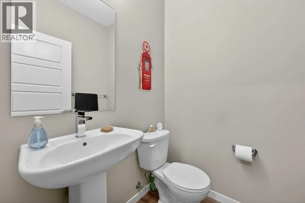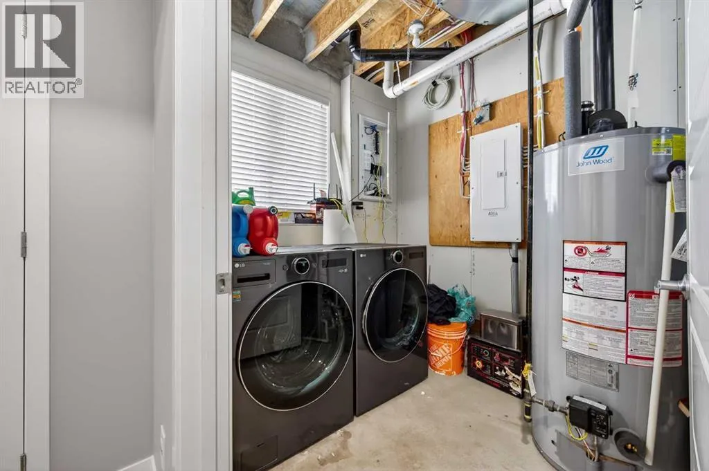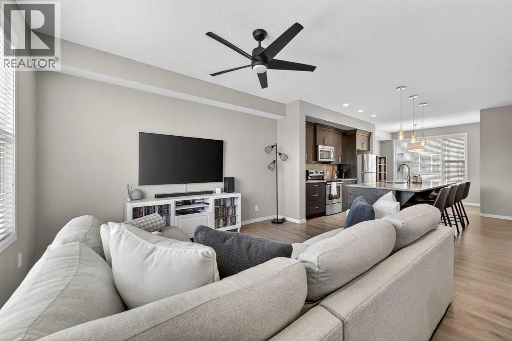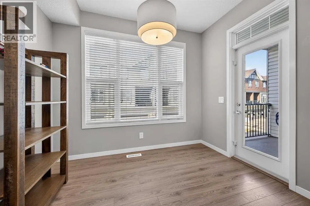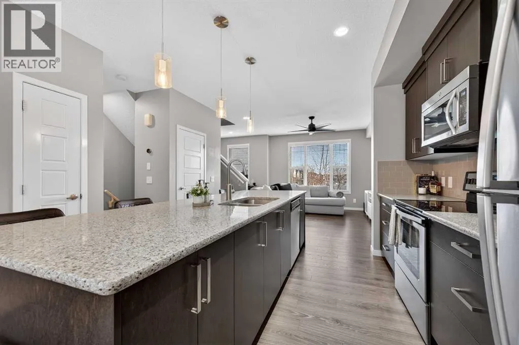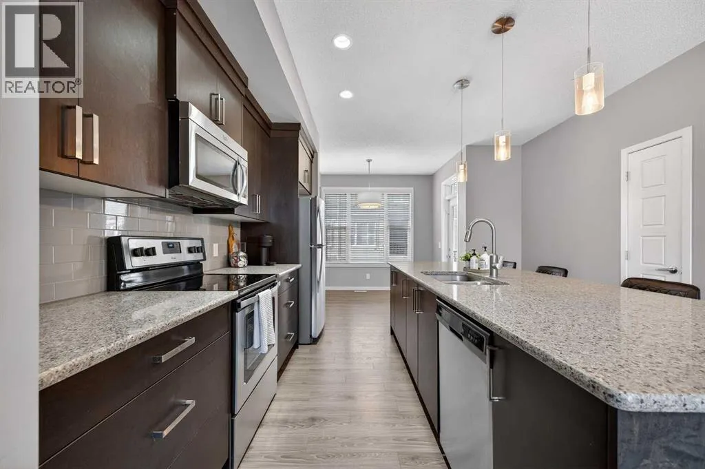 Welcome to the highly sought after Elements complex in New Brighton! This unit features 1600 of above grade square footage and twice as wide as most townhouses in the area with a true double garage that fits a full-size truck. Spacious open floor concept with modern grey laminate flooring throughout the main floor and large windows flooding the property with natural light. Chef's dream kitchen with rich espresso-stained cabinetry, granite counters, stainless steel appliances, subway tile backsplash, and huge 12 ft center island with undermount sink! Open to the dining room with a large window and access door to the sunny West balcony with power and natural gas hook up. Good sized living room with picture window and office nook, perfect for those working from home. Head upstairs to the two master suites both with walk-in closets and full ensuite bathrooms with granite counters and tile flooring. This well laid out upper level also features an extra open providing flexibility. A 2-piece powder room and lower-level laundry room with new high end LG front-loading washer and dryer to complete this great space. Fully finished and heated garage that fits a full-size truck, which is rare in even new detached houses these days, let alone a townhome! Central A/C with low dBs added and included to stay comfortable on those hot summer nights. With its excellent location close to shopping, parks, schools, New Brighton Athletic Park, and all the amenities and restaurants on 130th Avenue, this home has everything youâve been looking for in an established and family-friendly community. Commuting is a breeze with quick access to Stoney Trail Ring Road, 52nd Street, and 22x. This property is a must see! (id:27476)