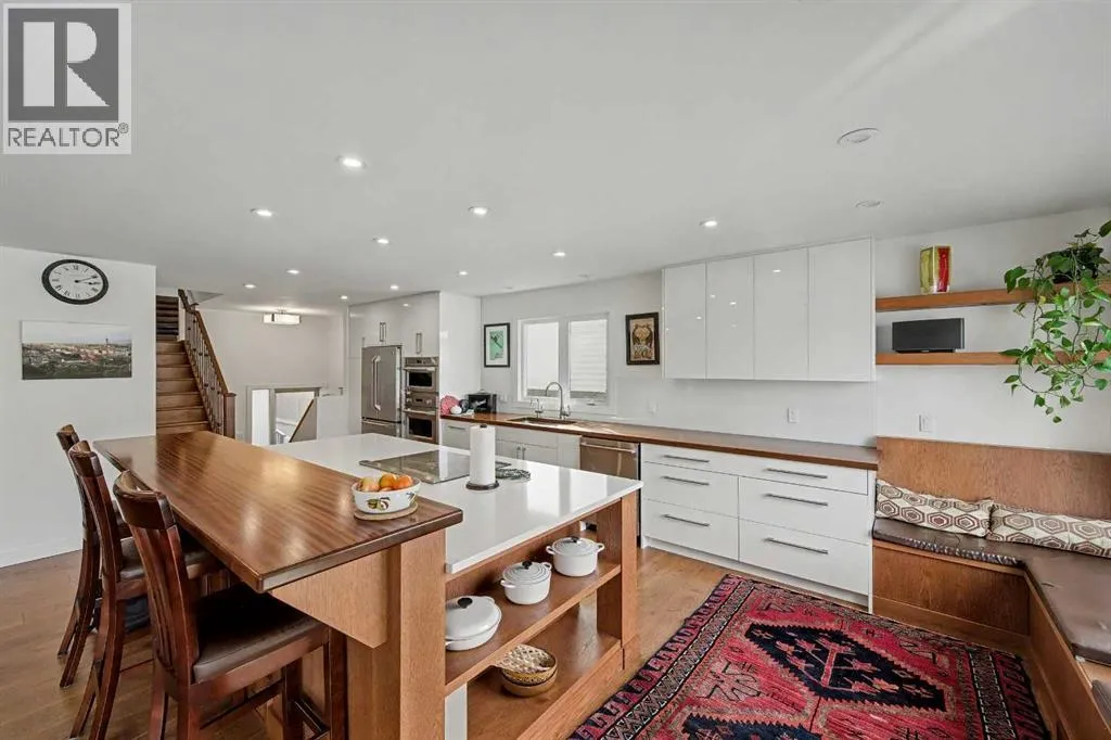 This extensively renovated 1,585 sq. ft. above grade family bungalow offers exceptional upgrades throughout. The main floor has an open layout with a large kitchen and dining space, a striking feature fireplace, and abundant natural light. Attention to detail is evident throughout, including mahogany wood accents, quartz countertops, and custom cabinets. There are two large bedrooms on the main floor, the primary having a luxurious ensuite bathroom, and direct access to the deck. The deck benefits from south-facing exposure year-round; a remotely powered awning adds convenience and shade. The home also features a spacious raised family room with vaulted ceilings and a high-efficiency wood burning fireplace, providing both indoor comfort and a covered outdoor living area with an additional exterior fireplace. The lower level contains a spacious recreation room, an additional fireplace, two more bedrooms, storage, laundry facilities, and a four-piece bath. All appliances, including a lower-level fridge and microwave, are included. All mechanical systems are updated, including a furnace (2025), water tank (2014), and central air conditioning (2022) for summer comfort. The property also includes a newer oversized double garage (2021) that is heated, insulated, drywalled, and features an 8 ft door height and high ceilings. There is so much living space in this home, a total of 2,492 sq. ft., including the basement level. With the generous yard, deck, covered patio, and the oversized garage, you can have it all. Located on a quiet residential road in the heart of Silver Springs, this property is just steps from the ravine and two elementary schools. The community provides access to schools, shopping, an outdoor pool, hiking trails, scenic views, the Bow River, public transit, and major roadways. Viewing is highly recommended; please refer to the accompanying photos for further details. (id:27476)