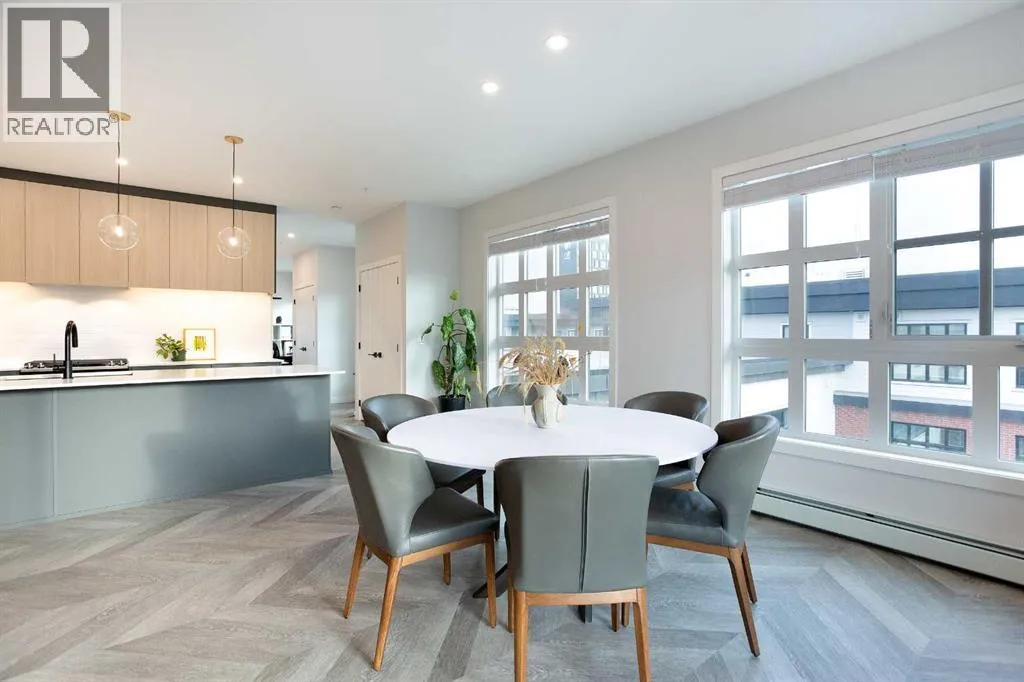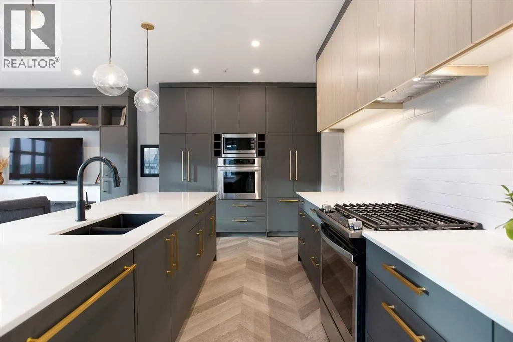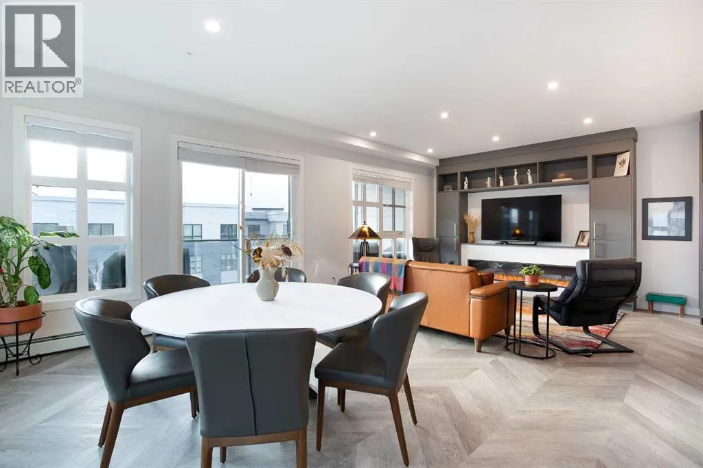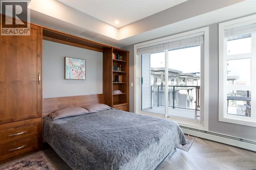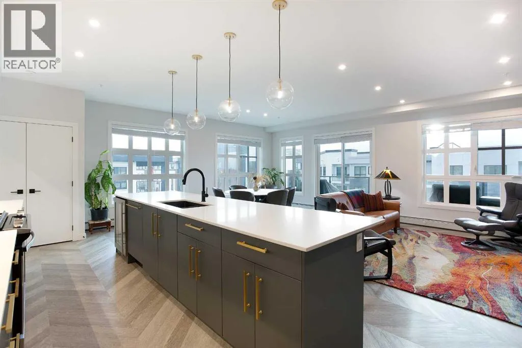 Welcome to Esquire in the University District! This CORNER UNIT, TOP-FLOOR PENTHOUSE is designed for luxury, style and comfort. The gourmet kitchen features a 12-foot central island, TWO built-in refrigerators, a gas range, a built-in oven, a built-in microwave and a bar fridge making entertaining and preparing meals a delight! The spacious living room features gorgeous herringbone flooring and a stylish electric fireplace with built-ins. TWO balconies provide beautiful views - one facing west with MOUNTAIN VIEWS! and the other facing east overlooking the courtyard and park. The primary bedroom has an OVERSIZED walk-in closet with custom built-ins and a luxurious 4-pc ensuite with a floor-to-ceiling tiled walk-in shower and dual sinks. The 2nd bedroom includes a murphy bed and has space for an office / study area. A 2nd 4-pc bathroom is in the hallway for added convenience. A laundry room, a spacious front closet and storage room and THREE underground STORAGE lockers ensure plenty of space for all your needs. TWO underground TITLED parking stalls are included. Loaded with amenities, this building offers a gym, a pet wash station, bike storage and tuning areas and a workshop. Conveniently located close to the University of Calgary, the Albertaâs Childrenâs Hospital, an urban dog park, Central Commons park, multiple shops, restaurants and grocery stores as well Market Mall, a daycare and the Cineplex VIP theatre. Accessing the rest of the city and downtown is a breeze with nearby transit routes and major road networks. This luxurious penthouse is waiting for you to call home! Call to book your private showing today. (id:27476)