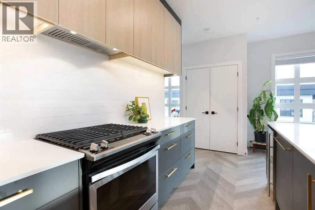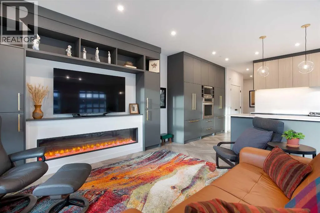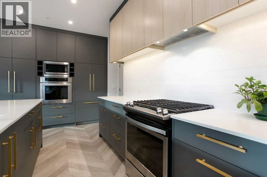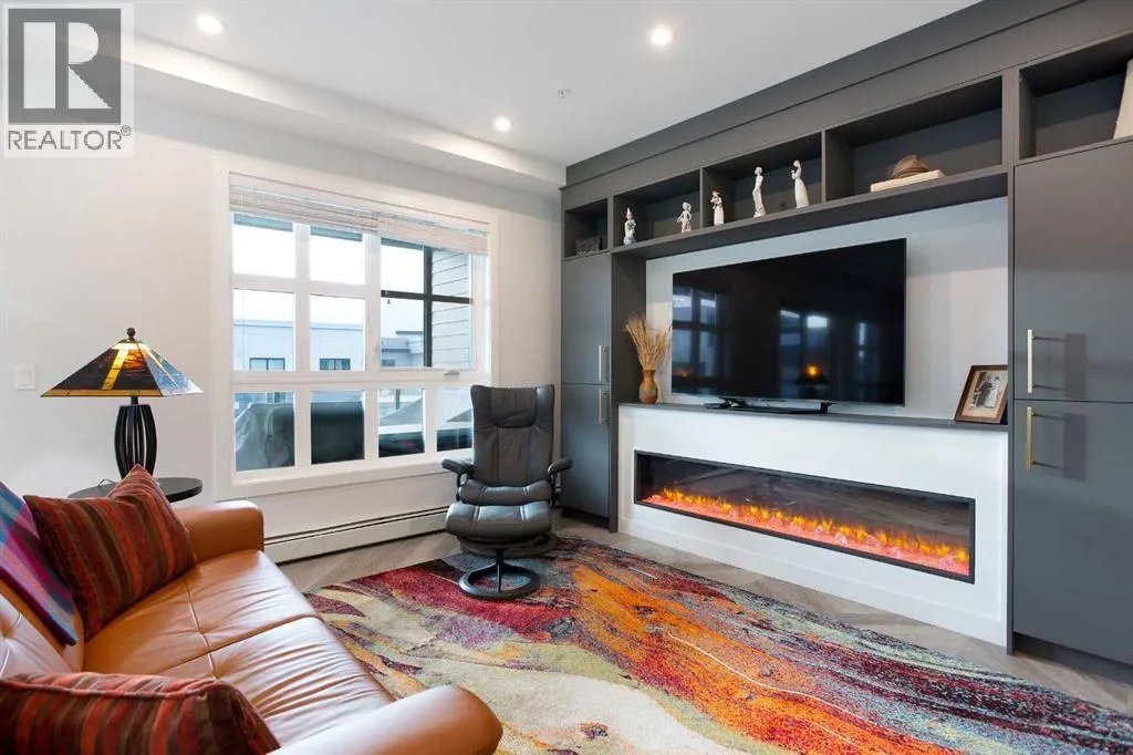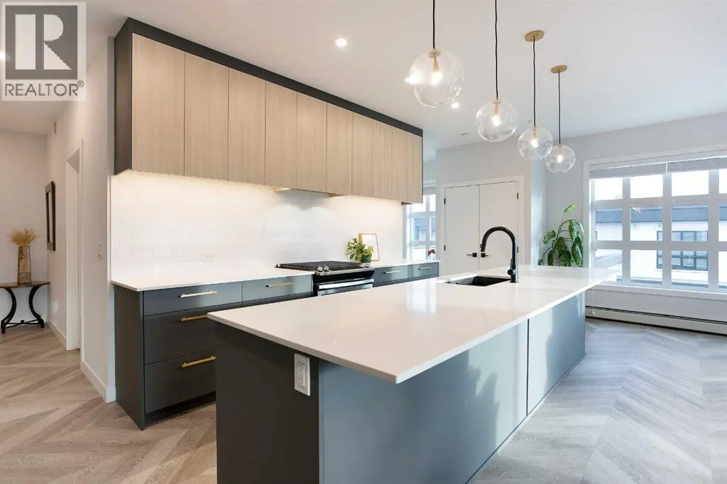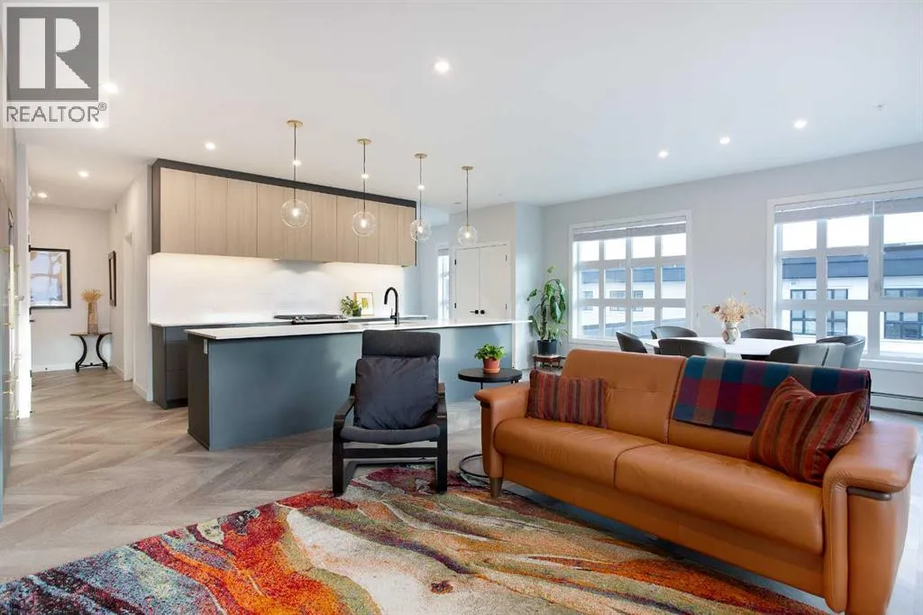 Welcome to Esquire in the University District! This CORNER UNIT, TOP-FLOOR PENTHOUSE is designed for luxury, style and comfort. The gourmet kitchen features a 12-foot central island, TWO built-in refrigerators, a gas range, a built-in oven, a built-in microwave and a bar fridge making entertaining and preparing meals a delight! The spacious living room features gorgeous herringbone flooring and a stylish electric fireplace with built-ins. TWO balconies provide beautiful views - one facing west with MOUNTAIN VIEWS! and the other facing east overlooking the courtyard and park. The primary bedroom has an OVERSIZED walk-in closet with custom built-ins and a luxurious 4-pc ensuite with a floor-to-ceiling tiled walk-in shower and dual sinks. The 2nd bedroom includes a murphy bed and has space for an office / study area. A 2nd 4-pc bathroom is in the hallway for added convenience. A laundry room, a spacious front closet and storage room and THREE underground STORAGE lockers ensure plenty of space for all your needs. TWO underground TITLED parking stalls are included. Loaded with amenities, this building offers a gym, a pet wash station, bike storage and tuning areas and a workshop. Conveniently located close to the University of Calgary, the Albertaâs Childrenâs Hospital, an urban dog park, Central Commons park, multiple shops, restaurants and grocery stores as well Market Mall, a daycare and the Cineplex VIP theatre. Accessing the rest of the city and downtown is a breeze with nearby transit routes and major road networks. This luxurious penthouse is waiting for you to call home! Call to book your private showing today. (id:27476)