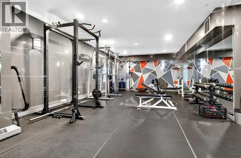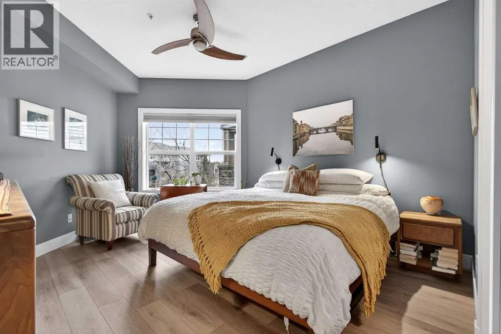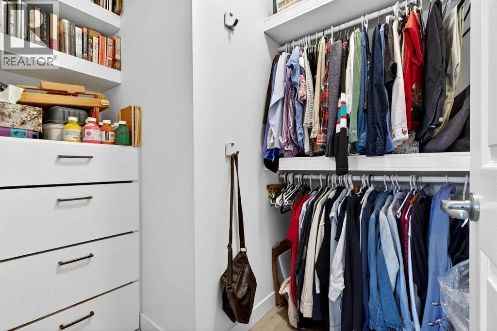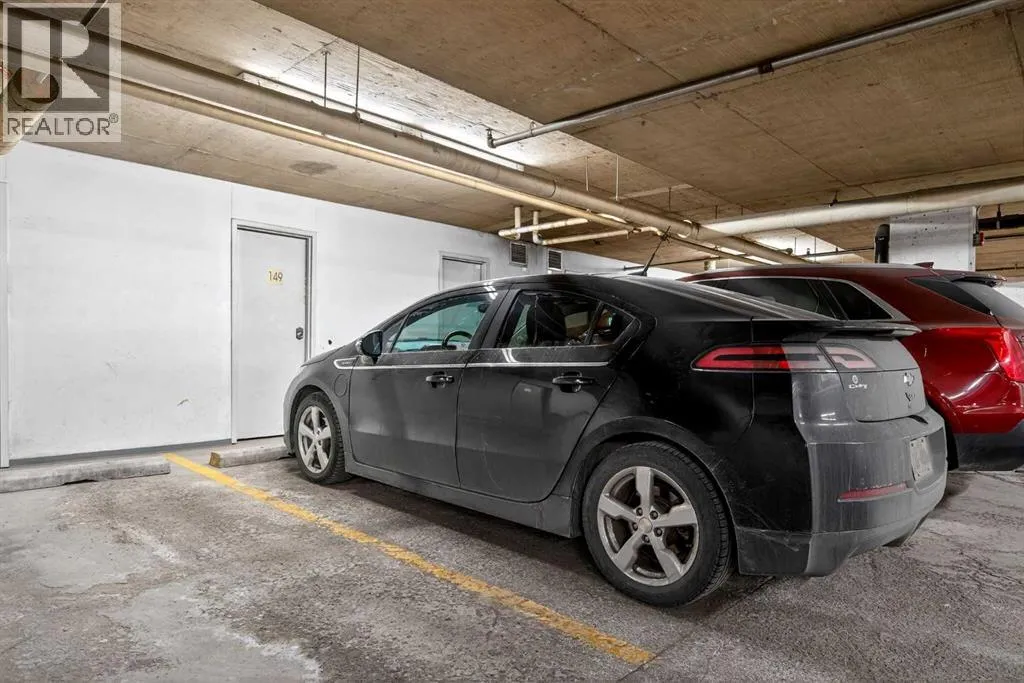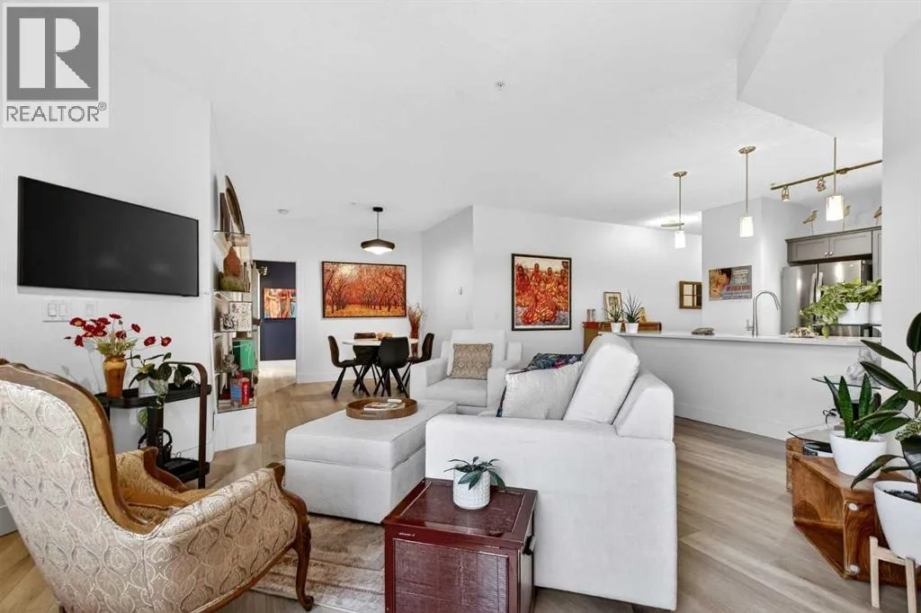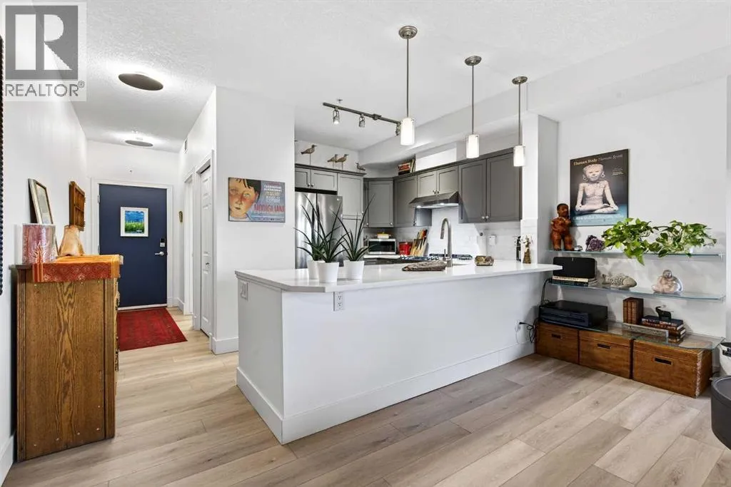 This is no cookie-cutter condo. This exceptional suite showcases creative attention to detail, with custom features left in place for new owners to enjoy from day one.The striking custom-built brick fireplace wall serves as a stunning focal point, complemented by two sets of thick glass shelving that float with unobtrusive grace. Luxury vinyl flooring flows throughout, while the spacious granite countertop provides ample room for meal preparation and entertaining.The refreshed kitchen features quartz countertops, freshly painted cabinets, and newer stainless-steel appliances. In the dining area, the sophisticated black light fixture complements the custom-built quartz table and sleek mid-century modern chairs, available for purchase separately.Southwest exposure floods the suite with natural light and frames beautiful sunsets, mountain views, springtime blossoms, and fall colours from your private balcony. Upgraded deck flooring, custom lattice surround, 12-foot roll-down sunscreen, and retractable screen door make the outdoor space distinctive.The large primary bedroom includes custom dresser and shelving in the closet. A second enclosed room, currently a home office, meets legal egress requirements thanks to the building's full sprinkler systemâmaking it a safe second bedroom. Ceiling fans in both bedrooms and built-in entry and laundry storage add comfort throughout.All this is yours in the friendly and inviting neighborhood of Inglewood, where you're an easy walk to the beautiful Bow River with kilometres of biking and walking trails. Stroll to the excellent shopping, vintage stores, cafes, breweries, and restaurants that Inglewood is famous for. Harvey Passage white water recreation is just 10 minutes away on foot.Heated underground parking and an ample storage locker near the elevator complete the package. (id:27476)