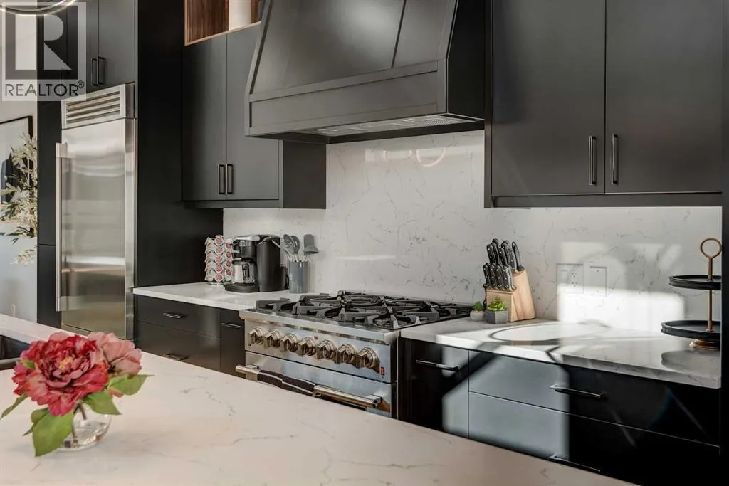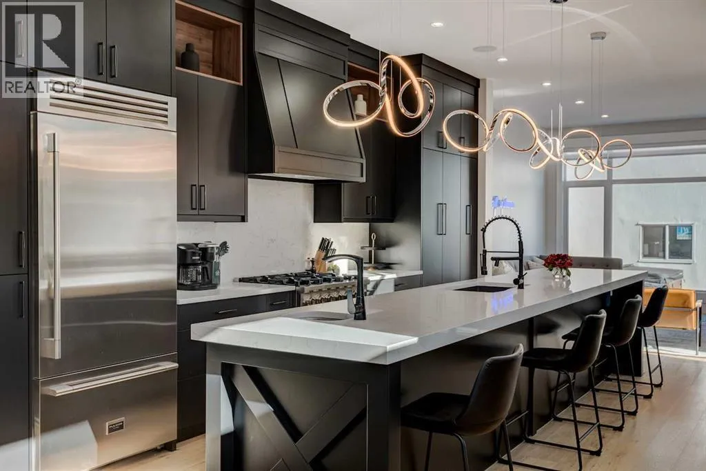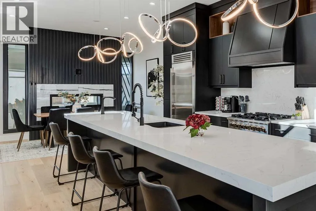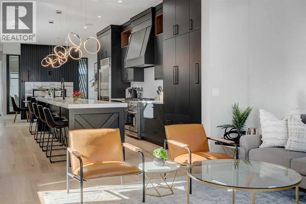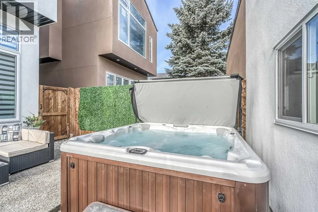 An exceptional opportunity to own a fully finished detached infill offering 3,178 sqft of refined living space, currently operating as a successful Airbnb and offered fully furnished with all décor and contents includedâa truly turnkey investment or effortless move-in opportunity. Designed with striking contemporary style and everyday functionality, this home impresses from the moment you arrive. The main level features an open, light-filled layout ideal for entertaining and daily living. A private main-floor office showcases a statement feature wall and elegant dual-sided fireplace, creating an inspiring work-from-home space. The heart of the home is the chefâs kitchen, complete with an oversized island and prep sink, premium stainless-steel appliances, gas stove, custom hood fan, and counter-depth refrigerator. Adjacent to the kitchen, the dining area is highlighted by a built-in wine display and offers ample space for hosting memorable gatherings. The inviting living room flows seamlessly to the outdoor retreat. Upstairs, enjoy a versatile bonus lounge, three well-appointed bedrooms, and a dedicated laundry room. The primary suite is a true sanctuary, featuring a generous walk-in closet and a spa-inspired five-piece ensuite with heated tile floors, glass-enclosed shower with body jets and dual shower heads (steam-ready), soaker tub, and a refined barn-door entry. Secondary bedrooms include custom wardrobes and share a beautifully finished four-piece bathroom. The bonus room, complete with a wet bar and beverage fridge, can easily convert into an additional bedroom or flexible living space. The fully developed basement rivals the upper levels with a spacious entertainment area featuring a custom wet bar and built-in media unit, perfect for hosting. A dedicated home gym with mirrored walls and luxury vinyl flooring, a large guest bedroom, and a full bathroom complete this level. Step outside to a private backyard oasis designed for year-round enjoyment, highlighted by a luxurious hot tub, ideal for both personal use and short-term rental appeal. Built with meticulous attention to detail, this home includes air conditioning, in-floor heating, and a central vacuum system. Located in the desirable inner-city community of Shaganappi, close to parks, schools, amenities, and the Shaganappi Point CTrain, and within the catchment for Western Canada High School, this property offers a rare blend of luxury living, income potential, and turnkey convenience. Book your private showing today. (id:27476)