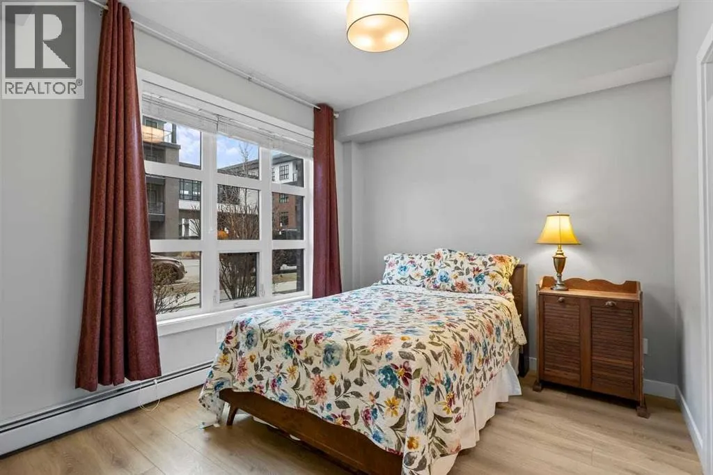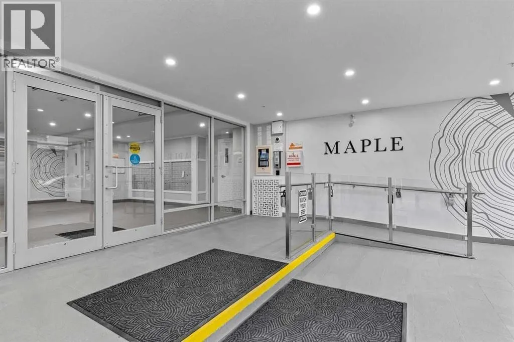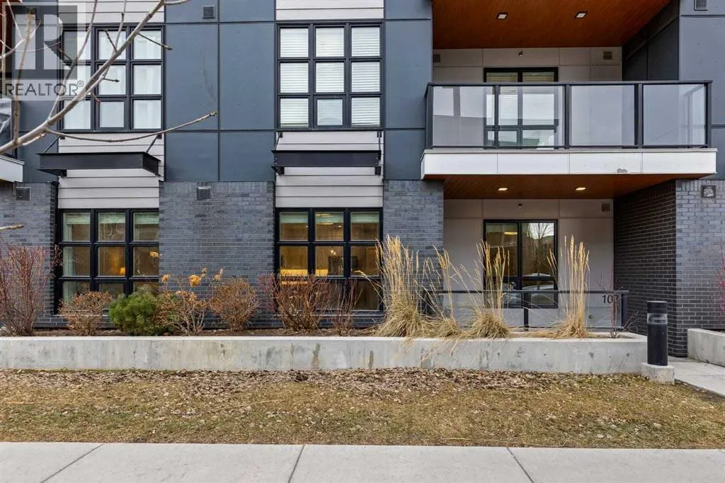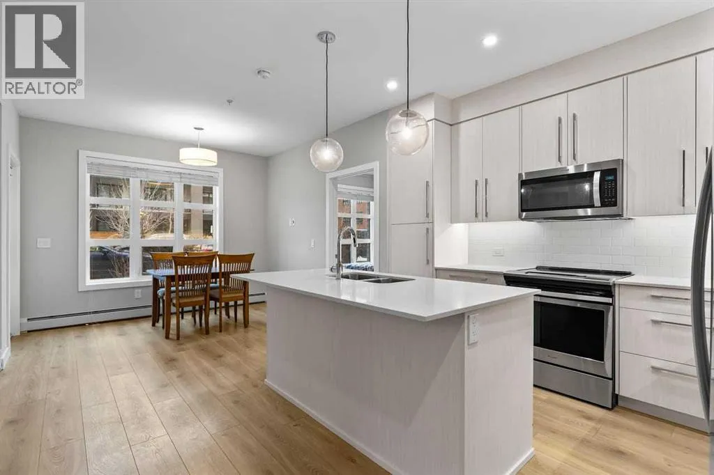 Catch the open house Valentine's Day Feb 14: 1-3pm or Sunday Feb 15: 4-6pm. Enjoy maintenance-free living in this spacious one-bedroom condo in the sought-after 55+ Maple building, ideally located in Calgaryâs vibrant University District. Built by Truman Homes, Maple offers a secure, social community with luxury finishes, perfect for those ready to simplify life without sacrificing lifestyle.Unit 107 is a convenient main-floor condo with direct access to the covered patio and walking paths; ideal for easy comings and goings or running a quick errand. This 728 sq ft home features an open-concept floorplan with 9-foot ceilings, engineered hardwood flooring, and large triple pane picturesque windows. The modern kitchen includes quartz countertops, stylish cabinetry, a designer backsplash, and stainless steel appliances. The large island is perfect for casual meals or prepping a beautiful dinner at home. The dining area is spacious and also great for hosting family visits or playing cards with the grandchildren. The kitchen and dining area open to the living room, creating a comfortable space to relax at the end of the day. The generously sized bedroom includes a walk-through closet and a spacious 4-piece ensuite. A second full bathroom adds extra convenience for any guests. This unit also includes in-suite laundry and your own titled, heated underground parking stall.The Maple building includes a heated underground parkade, plenty of visitor parking, elevators, and thoughtful âaging in placeâ features such as wide hallways, accessible entrances, and automated doors. Residents will also enjoy a beautifully landscaped courtyard with inviting seating areas.Living in the University District makes everyday life incredibly convenient. From groceries and banking to coffee dates and evening movies, everything is close by. Save-On-Foods, Staples, Shoppers Drug Mart, Cineplex, COBS Bread, Monogram Coffee, Market Mall, and a variety of cafés, restaurants, and shops along Main Street are all within easy walking distance. With more amenities opening all the time, the University District continues to stand out as one of Calgaryâs most vibrant and walkable communities.Next door is Cambridge Manor, a neighbouring residence offering independent and supportive living services. Maple residents are able to access select lifestyle and recreation amenities at Cambridge, including a bistro café, fitness centre, and a variety of fitness classes. A hair salon is also available, along with organized social activities such as coffee club, card games, crib club, drum circles, concerts, movies and documentaries, and special holiday meals.Whether youâre looking for a lock-and-leave lifestyle or a welcoming community to enjoy year-round, Unit 107 at Maple is an outstanding opportunity in one of Calgaryâs best urban neighbourhoods. (id:27476)