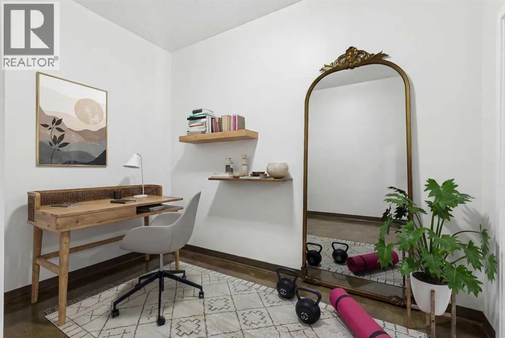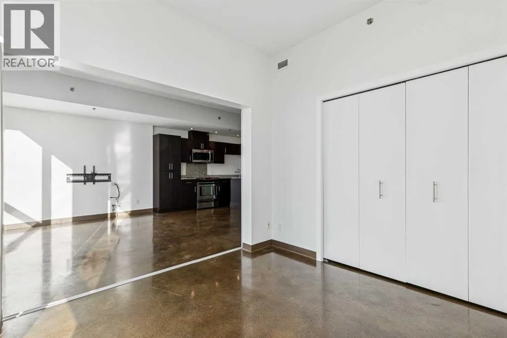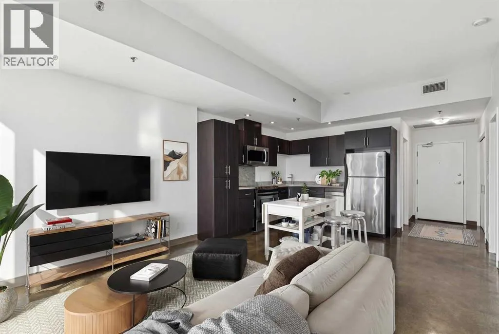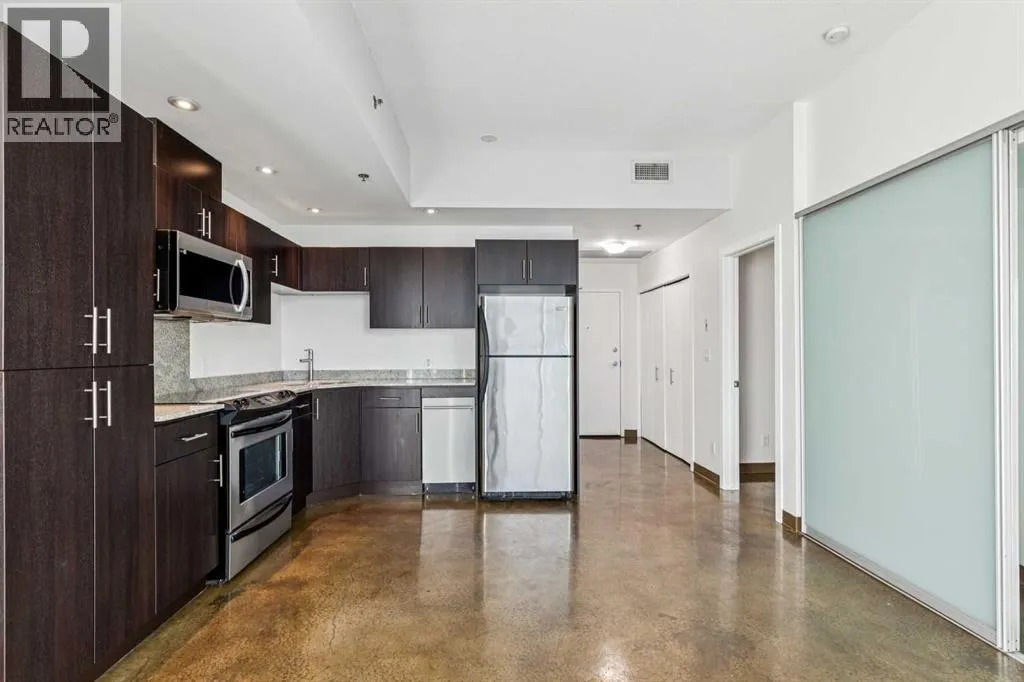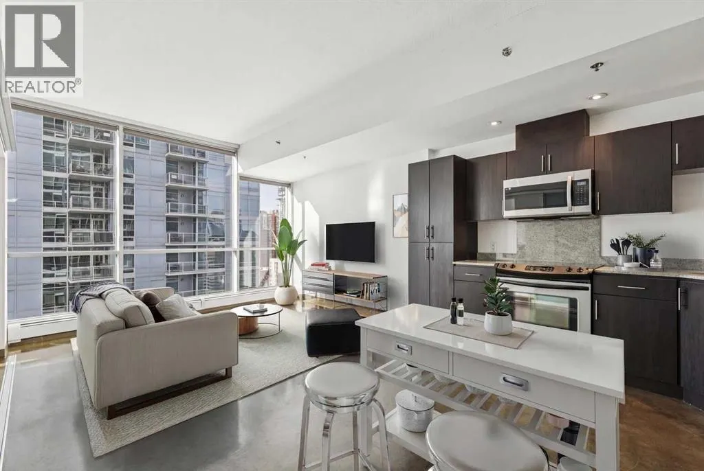 Step into urban living at Colours, where architecture, light, and location come together in all the right ways. This west-facing one bedroom plus den residence delivers a front-row seat to Calgaryâs skyline, with sweeping Downtown and Rocky Mountain views showcased through an impressive wall of floor-to-ceiling glass. As the sun sets, the entire space is washed in warm afternoon and evening lightâan everyday luxury youâll never tire of. The open-concept layout is designed for both style and function. The kitchen anchors the home with sleek ebony flat-panel cabinetry, granite countertops, and stainless steel appliances, offering a modern, streamlined aesthetic that pairs perfectly with the buildingâs industrial edge. Acid-stained polished concrete floors and 9-foot ceilings reinforce the loft-inspired feel, while central air conditioning keeps the space comfortable year-round. The versatile den is ideal for a 2nd bedroom, home office, creative studio, or reading nookâproof that smart design can do more with less. The bedroom enjoys the same west exposure and city outlook, while the contemporary four-piece bathroom, in-suite laundry, and sliding glass door to the window wall complete the interior. A titled underground parking stall adds everyday convenience and long-term value. Colours is known for its bold glass façade and unmistakable presence in the streetscape, reflecting the energy of the neighborhood itself. Located in Victoria Park, youâre surrounded by an eclectic mix of culture, cuisine, and nightlife. From 17th Avenue to the Downtown Core, and from Mission to Inglewood, everything Calgary has to offer is just minutes away. This is more than a condoâitâs a lifestyle defined by views, vibrancy, and walkable city living. (id:27476)