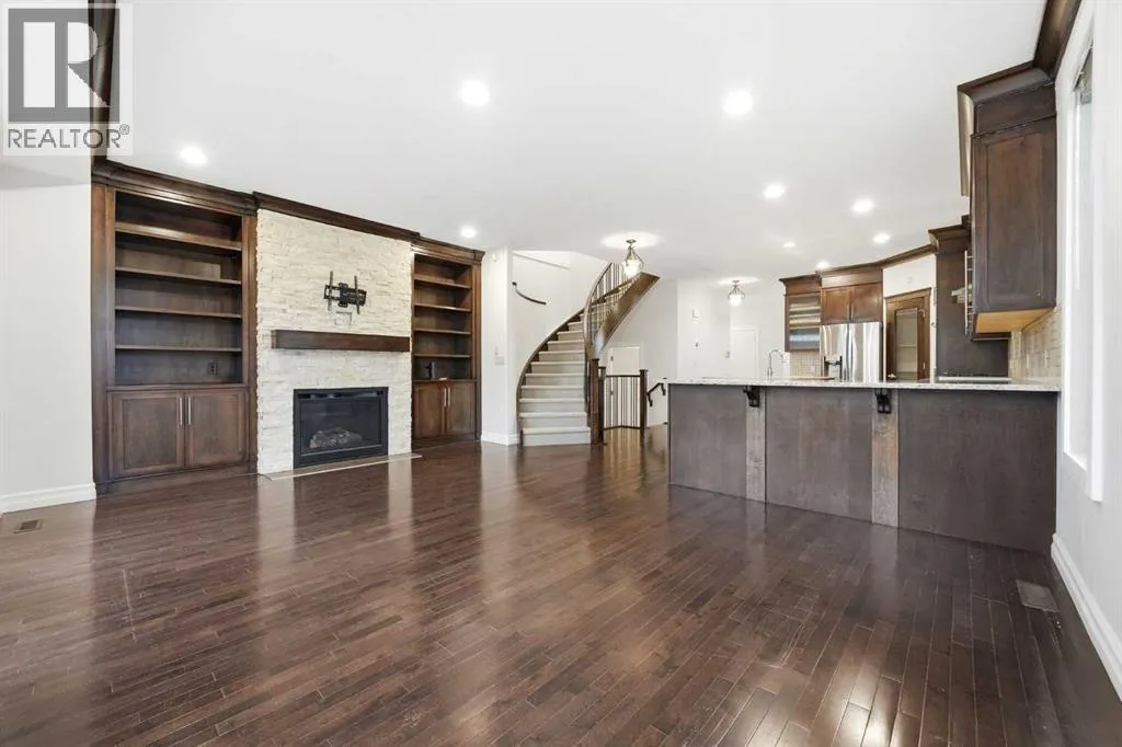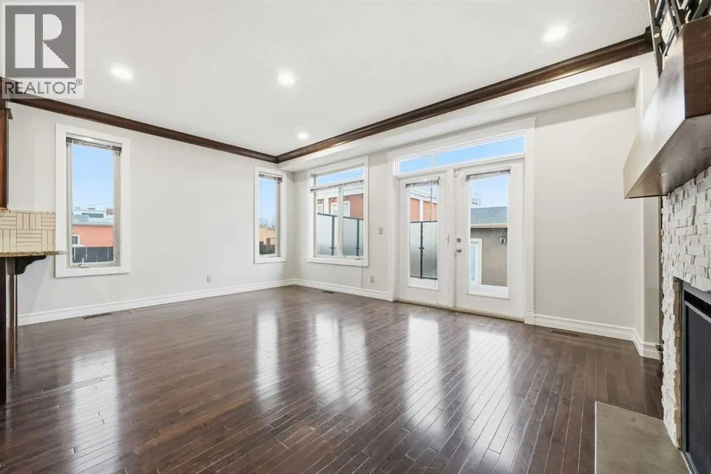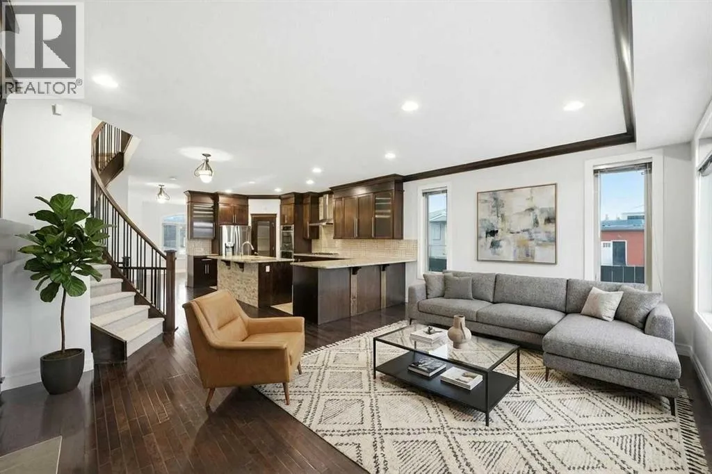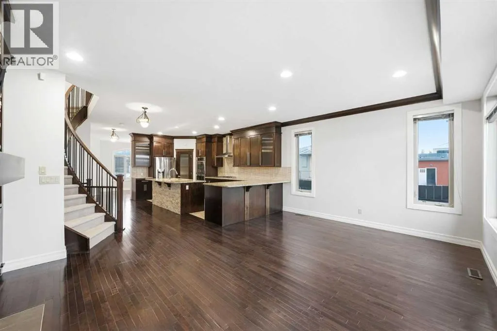 Welcome to this beautifully appointed 4-bedroom semi-detached home offering exceptional accessibility to downtown and nearby amenities in the sought-after community of Tuxedo Park. The main floor showcases an open-concept layout highlighted by a custom curved staircase, rich hardwood flooring, and 9-foot ceilings throughout.The open plan kitchen features full-height custom espresso-stained cabinetry, granite countertops, stainless steel appliances with a gas cooktop and wall oven, a central island, breakfast bar, and a walk-in pantry. Flowing seamlessly from the kitchen, the spacious great room is anchored by a cozy fireplace with custom built-in cabinetry on both sidesâideal for relaxing or entertaining. A dedicated dining room with ample space for a full-sized table is perfect for entertaining.Upstairs, the primary suite offers a luxurious retreat with a 5-piece ensuite, including a Jacuzzi tub, separate tiled shower, and a walk-in closet. Two additional generously sized bedrooms with large closets, an upper-floor laundry area, a 4-piece bathroom, and a skylight that fills the space with natural light complete the upper level.The professionally developed lower level adds valuable living space with a large recreation room and a fourth bedroom, and is roughed in for a third full bathroom. Additional features include central A/C, full-height custom cabinetry, built-in great room cabinets, a skylight above the staircase, gas line to BBQ, central vacuum rough-in, rear deck, window coverings throughout, and 9-foot main-floor ceilings. All of this is located just minutes from the city core.Available for quick possession, book your showing today! (id:27476)