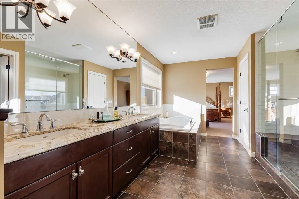 This exceptional 2,635 sq ft estate home offers a rare combination of space, craftsmanship, and thoughtful luxury, complete with a walk-out basement, heated ensuite floors, and a 24â deep triple garage with extensive storage and workshop spaceâideal for car enthusiasts, hobbyists, or those needing room to create and store.Curb appeal is immediate with professionally designed landscaping, mature plantings, and a massive stamped concrete patio, complemented by a sun-filled south-facing backyard perfect for entertaining or quiet evenings outdoors.Inside, the home impresses with 9â ceilings, prefinished hardwood flooring, and an elegant curved staircase featuring rich maple railings and wrought-iron spindles that create a striking architectural focal point.The gourmet kitchen is both functional and beautiful, showcasing natural granite countertops, rich dark Asbury maple cabinetry, oversized windows that flood the space with natural light, and a premium appliance package including side-by-side Electrolux refrigerator and freezer, a gas cooktop with integrated gas grill, double built-in ovens, and a butlerâs pantryâperfect for entertaining at a high level.Upstairs offers three generously sized bedrooms, with secondary bedrooms noticeably larger than typically found. The primary retreat is expansive and serene, featuring stunning views and a true spa-inspired ensuite with heated tile floors, a massive tiled shower enclosed in 10mm glass, bench seating, brick-lay tile detail, dual undermount vanities, and a huge walk-in closet.The walk-out basement is partially finished, offering a recreation area and an office or additional bedroom, with in-floor heating rough-in already in place, providing excellent flexibility for future development and direct access to the backyard.Silverado Ranch is one of Southwest Calgaryâs most established and desirable luxury communities, known for its estate homes, wide streets, extensive pathway system, parks, and proximity to Spruce Meadows. Residents enjoy quick access to Stoney Trail and Macleod Trail, making commutes across the city effortless, while nearby Shawnessy Shopping Centre, Silverado Plaza, schools, restaurants, and everyday amenities are just minutes away.A refined estate home offering space, comfort, and location in one of Southwest Calgaryâs premier communities. (id:27476)