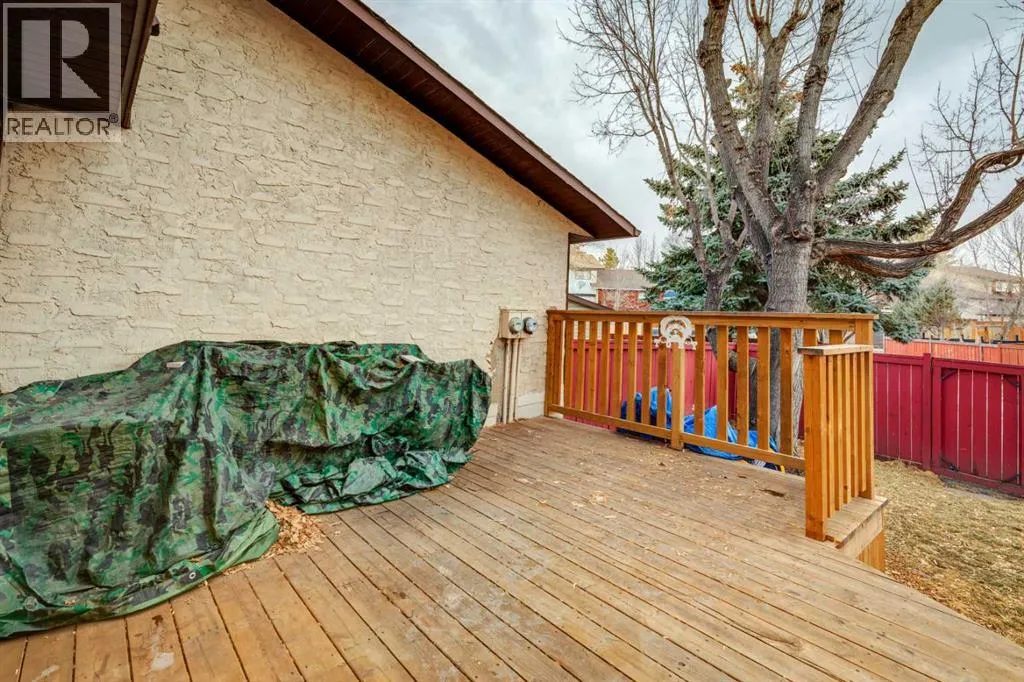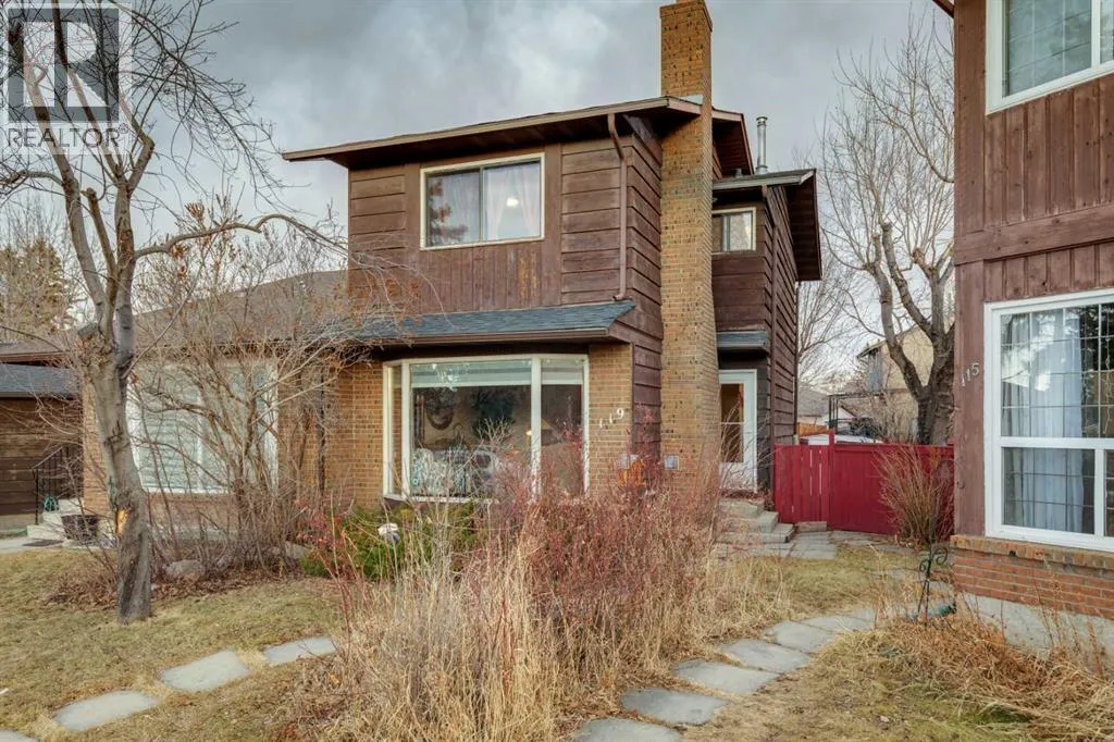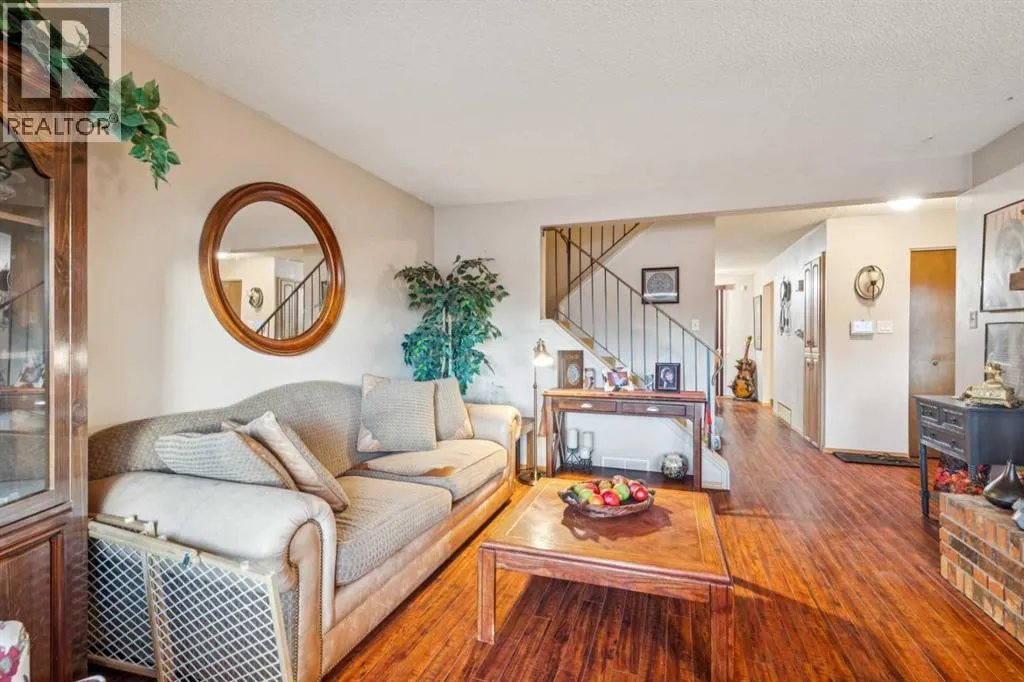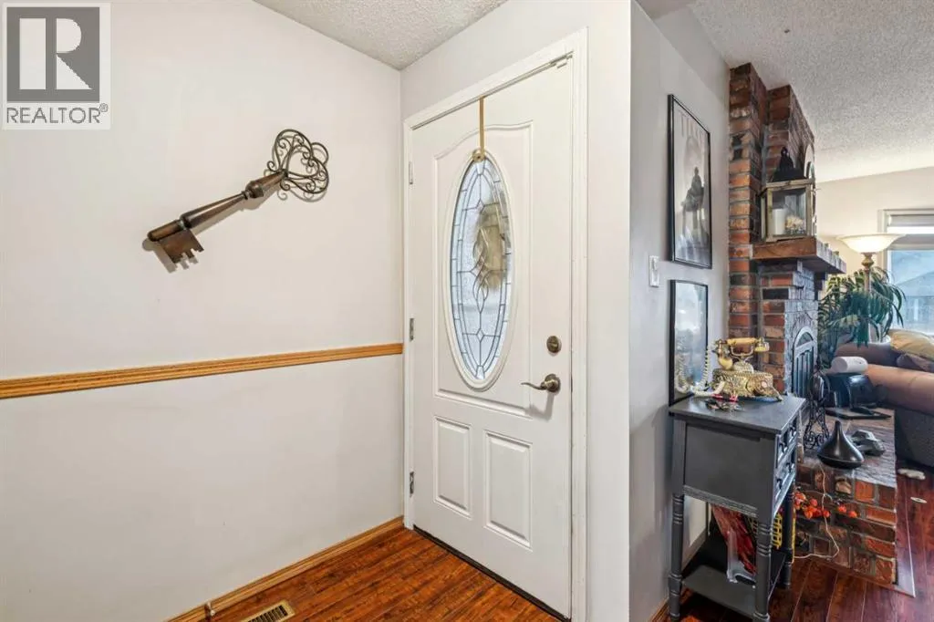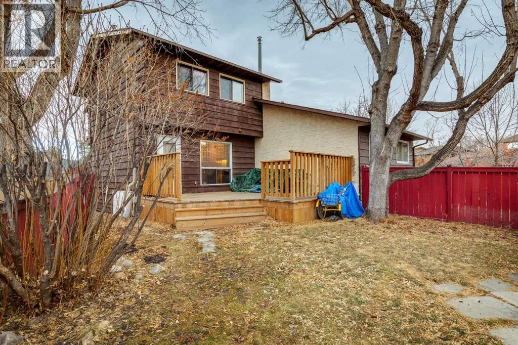 Welcome to this beautifully maintained home situated on a rare PIE-SHAPED LOT. Offering an exceptional combination of space, functionality, this move-in-ready home is ideal for first-time buyers, families, or investors alike.The main level welcomes you with a spacious front foyer and convenient closet. The bright living room is filled with natural light from a large bay window overlooking the meticulously landscaped front yard. A striking brick-faced wood-burning fireplace with a rich wood mantle anchors the space. Durable laminate flooring flows throughout the main level.The eat-in kitchen offers timeless oak cabinetry, a built-in pantry, full tile backsplash, laminate countertops, and ample room for family dining. A rear entry leads to a tastefully updated 2-piece bathroom featuring a stone countertop, adding everyday convenience.Upstairs, youâll find three generously sized bedrooms and a beautifully renovated 4-piece bathroom with elegant tilework, deep soaker tub with tiled surround, stone vanity, and brushed nickel fixtures.The fully finished basement expands your living space with a comfortable recreation room and an exceptionally large laundry and storage area complete with extensive shelving and racking.Outside, enjoy a fully fenced, beautifully landscaped backyard with mature trees that create a private and peaceful retreat. A storage shed and paved parking pad add to the homeâs functionality.Lovingly cared for and in very good condition.Ideally located in the established, family-friendly cul de sac, close to schools, parks, shopping, LRT, Peter Lougheed Hospital, and major routes. A fantastic opportunity in an unbeatable locationâschedule your private showing today! (id:27476)