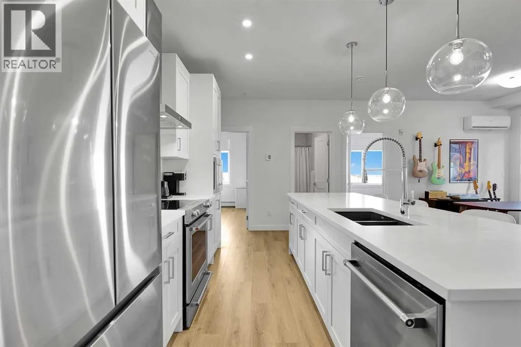 Discover this stylish 916 sq ft, 2 bedroom condo in the heart of one of Calgaryâs most walkable communities. This end unit has been extensively upgraded for comfort and design, and offers a premium urban lifestyle. You will be impressed with the beautifully Upgraded Kitchen which includes quartz countertops, custom tile backsplash, and a built in hood fan. The bright, open layout features luxury vinyl plank flooring, large windows and lots of space for comfortable living. The condo is also equipped with central A/C for the hot summer days! The primary bedroom includes a walk-in-closet and a four piece ensuite with a double vanity. There is a second bedroom, a three piece bathroom, in suite laundry and a large balcony to complete this home. Extras include titled underground parking along with an assigned storage unit. Steps from South Health Campus, the YMCA, public library, and local dining/shopping and quick access to Deerfoot and Stoney Trail, you are never far from where you need to go. Book your showing today! (id:27476)