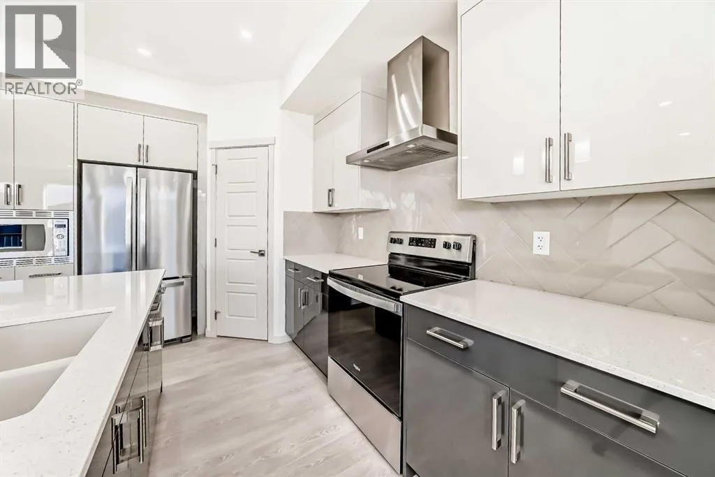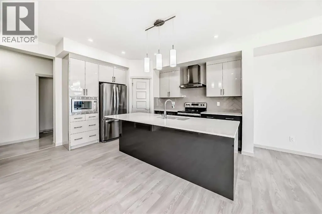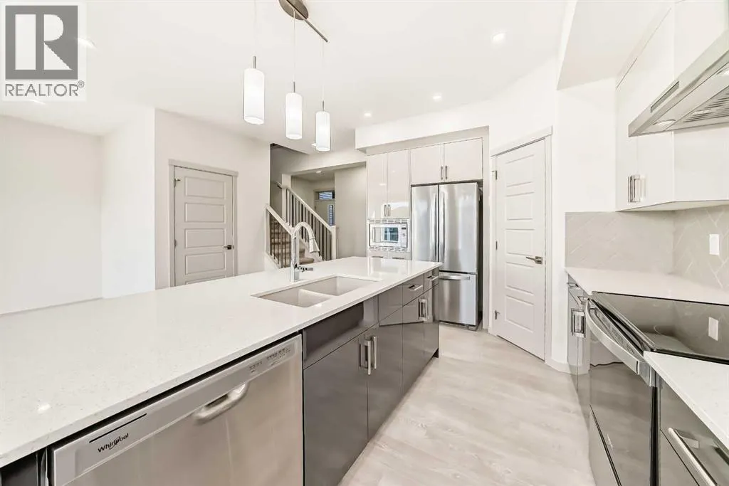 Brand new and never occupied, this premium Morrison Homes build offers over 2,700 sq ft of fully finished living space in the sought-after master-planned community of Livingston in Calgaryâs vibrant New North. Designed with modern living in mind, the home features an open-concept main floor with a spacious living room highlighted by an electric fireplace, a bright dining area, and a chef-inspired gourmet kitchen complete with upgraded appliances, elegant two-tone glossy cabinetry (dark lower and white upper), quartz countertops, a large central island, and a walk-through pantry. A practical mudroom adds everyday convenience.The second floor offers a flexible family room, a generous primary retreat with a luxurious 5-piece ensuite, two additional bedrooms, and upper-level laundry. The fully finished walk-up basement extends the living space with a bedroom, recreation room, and a 4-piece bathroom, ideal for guests or extended family.Located in Livingston, residents enjoy access to the Livingston Hub HOA facility, over 200 acres of parks and green space, scenic wetlands, and pathways. With quick access to Stoney Trail and Deerfoot Trail, this home combines premium craftsmanship, thoughtful design, and an exceptional community lifestyle. (id:27476)