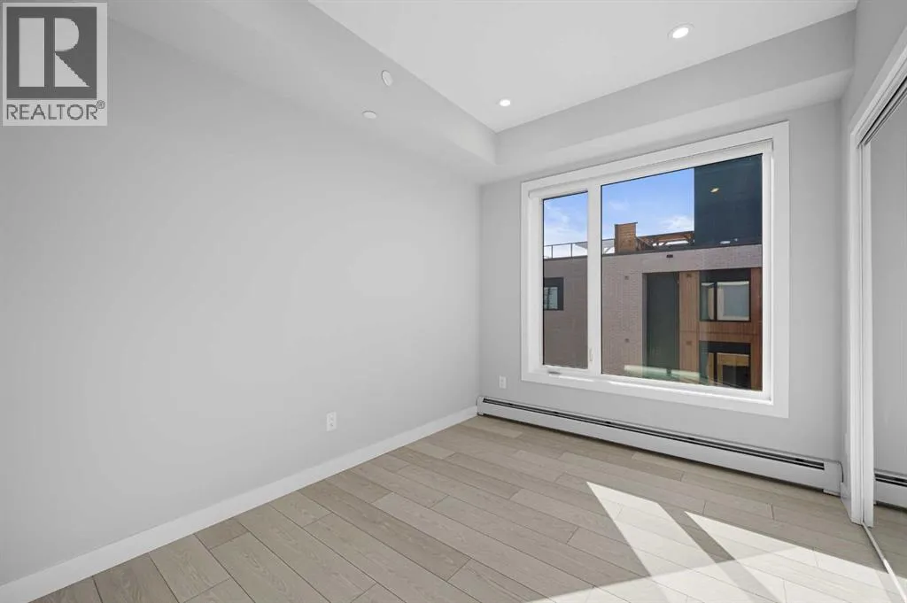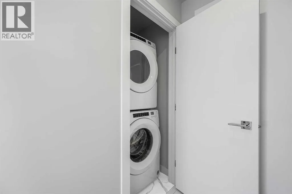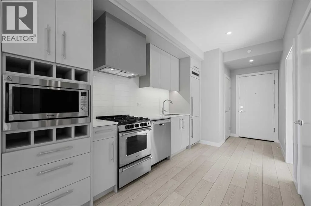 Experience modern urban living in the heart of West District at Mondrian. This well-designed 2-bedroom, 1-bathroom residence offers a smart use of space, combining functionality with contemporary styleâperfect for those who value convenience and a vibrant community setting.The open-concept layout connects the kitchen, dining, and living areas, creating an efficient and welcoming space. The kitchen is outfitted with premium finishes and high-end appliances, including an integrated refrigerator, gas range, and built-in microwaveâbringing both elegance and ease to everyday living.While compact, both bedrooms provide flexible options for a guest room, home office, or personal retreat. The centrally located 4-piece bathroom is easily accessible from all areas of the home.Additional highlights include in-suite laundry, air conditioning, and stylish window coverings. Step out onto your private balconyâideal for a quiet morning coffee or an evening wind-down.Residents of Mondrian enjoy exclusive access to a rooftop terrace with breathtaking views, modern seating areas, and an ideal setting for entertaining or relaxing.Located steps from boutique shops, gourmet dining, parks, and essential amenities, this home delivers everyday convenience in one of Calgaryâs most sought-after neighbourhoods. Titled underground parking ensures your vehicle remains secure and protected year-round.This is your opportunity to own a sleek, low-maintenance home in West Districtâdiscover the lifestyle that Mondrian offers today. (id:27476)