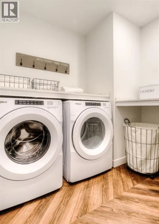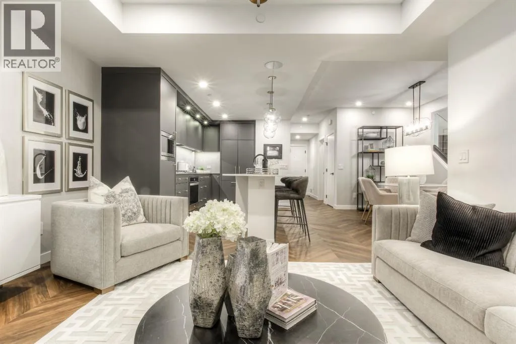 Located in the master-planned community of West District, Gateway offers an exceptional standard of living. This meticulously designed 2-level Brownstone is a perfect blend of modern elegance and sophisticated craftsmanship, featuring 3 Bedrooms, 3 Bathrooms, and a versatile main floor Den/Bedroom. It also includes 2 titled underground parking stalls, offering both convenience and security. From top to bottom, this home is crafted with the highest quality finishes and attention to detail. Inside, youâll find luxurious touches like air conditioning, Chevron luxury wide-plank flooring, and custom penny round mosaic tiles in every bathroom. LED pot lights illuminate the space, highlighting the elegantly painted ceilings throughout. The chef-inspired kitchen is a true centre piece, boasting a super matte finish cabinet with brushed gold hardware, high-end appliances, and exquisite design. It includes a gas cooktop, wall oven, an integrated 36" Fisher & Paykel fridge, panelled dishwasher, and soft-close custom cabinetry. The under-cabinet lighting and stunning quartz countertops and backsplash add to the visual appeal, making this kitchen a space both functional and beautiful. Other thoughtful features include a washer and dryer, custom window coverings for the floor-to-ceiling windows, and direct access to the private patio. The Primary Suite offers its own private balcony, providing the perfect retreat. Experience unparalleled luxury and comfort at Gateway. Stay tuned for an upcoming photo gallery that will showcase the full beauty of this one-of-a-kind residence. This is more than just a home â itâs a lifestyle! (id:27476)