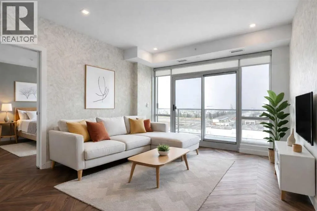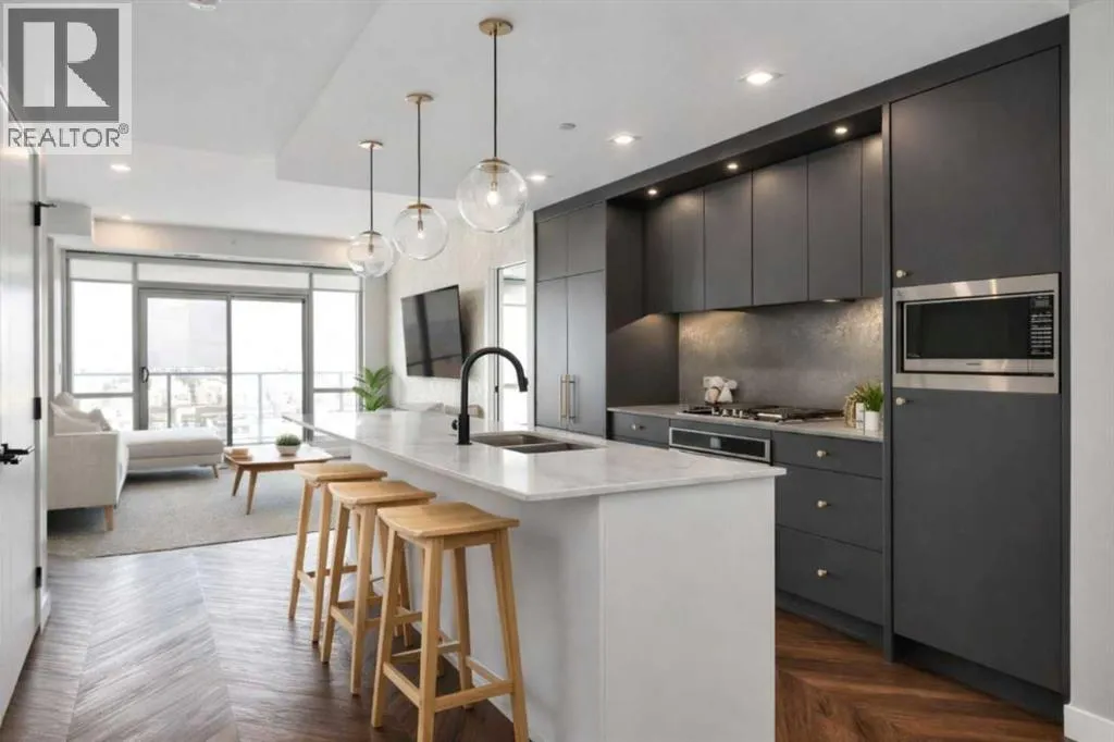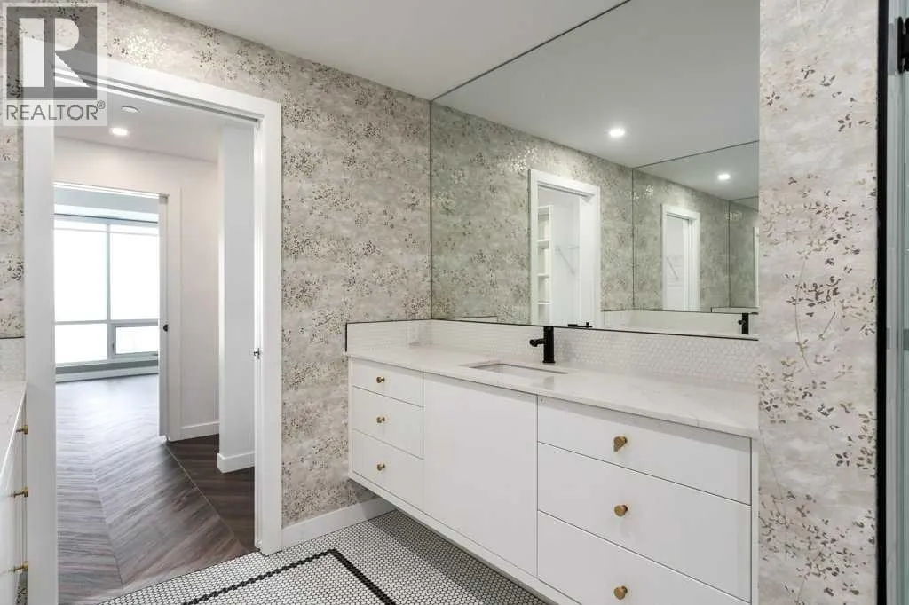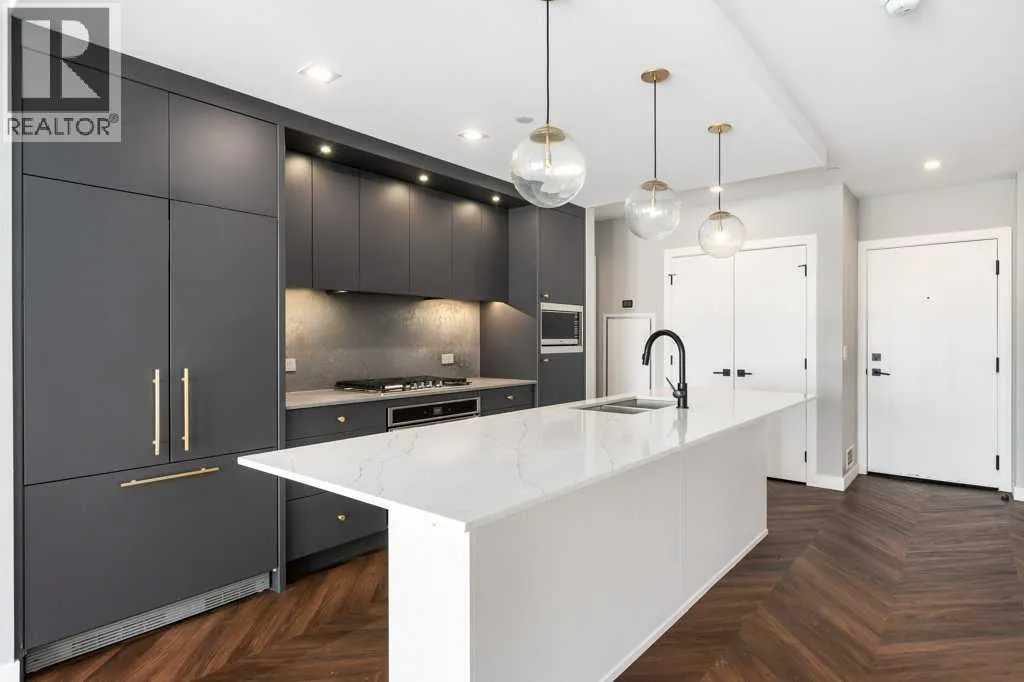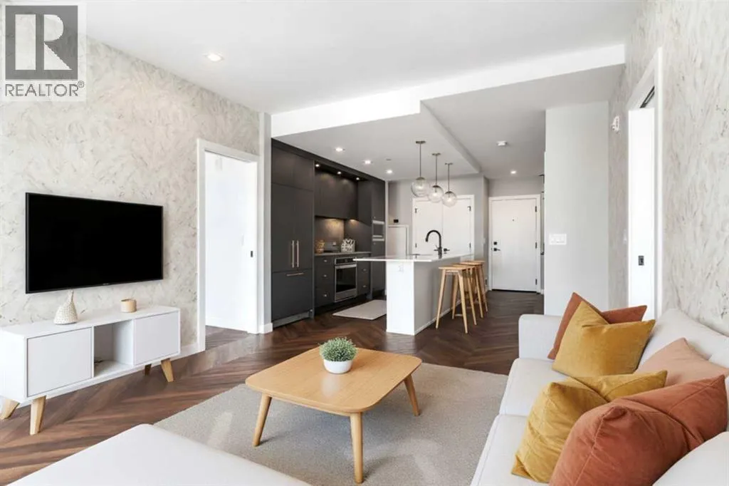 Experience elevated living in this stunning sub-penthouse condo in the heart of West District, Calgaryâs most exciting new master-planned urban community on the west side. With nearly 1,000 sq. ft. of thoughtfully designed living space, this home blends luxury, comfort, and convenience in a way thatâs hard to find.Inside, the layout is exceptionally functional boasting two spacious bedrooms, each with its own private 4-piece ensuiteâperfect for guests, roommates, or a refined primary suite plus dedicated office. A separate powder room offers added convenience rarely found in condos of this size. Luxury vinyl plank flooring graces the main living areas offering durability and style and unique mosaic tile flooring in the bathrooms, adding texture and a designer touch.The open-concept kitchen and living area flow seamlessly toward an expanded north-facing deck, where you and your guests will enjoy unobstructed views, including a direct sightline to the iconic Calgary Olympic ski jump. Whether youâre entertaining or unwinding, this outdoor space becomes an extension of your home.As a sub-penthouse, this unit offers the rare advantage of no upstairs neighbours, creating a quiet, peaceful retreat above the energy of the city.Step outside and youâre immersed in the vibrant lifestyle that defines the West District. This elite, walkable neighbourhood offers trendy coffee shops, numerous restaurants and boutique stores, and a brand-new grocery store right across the street. The cherry on top is definitely the newly-opened Radio Park; a beautifully designed urban green space perfect for relaxation, recreation, and community connection.Although set in the suburbs, West District offers unmatched accessibility. Youâre minutes from downtown, steps from Calgaryâs new ring road, and less than an hour from the world-famous Rocky Mountainsâmaking weekday commutes and weekend adventures equally effortless.This condo delivers the perfect blend of luxury finishes, thoughtful design , and an unbeatable location. Itâs not just a homeâitâs a lifestyle. (id:27476)