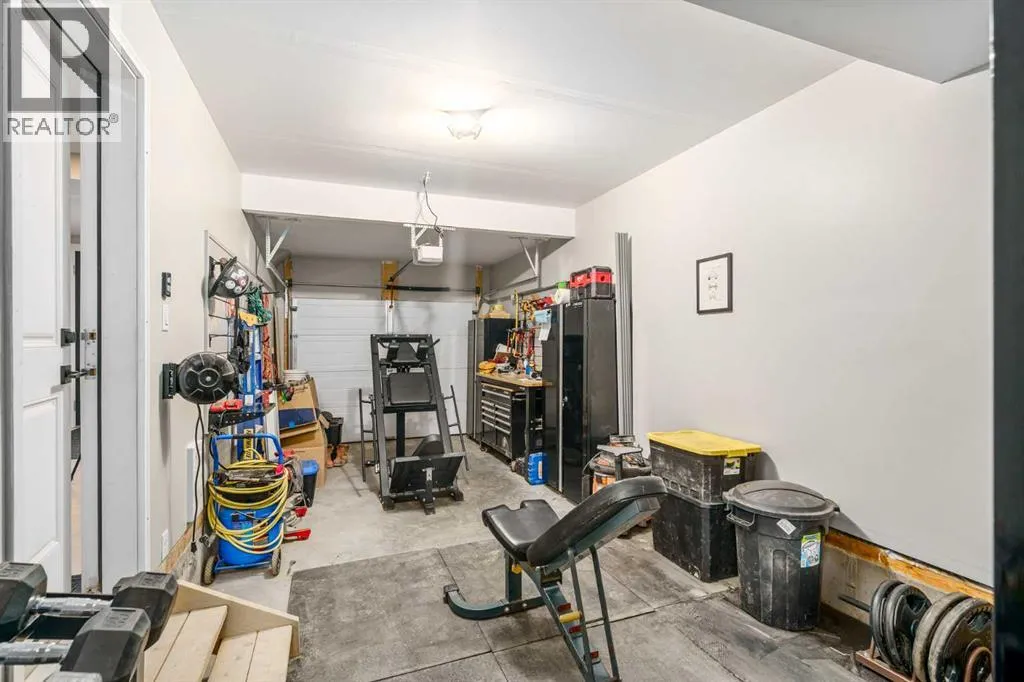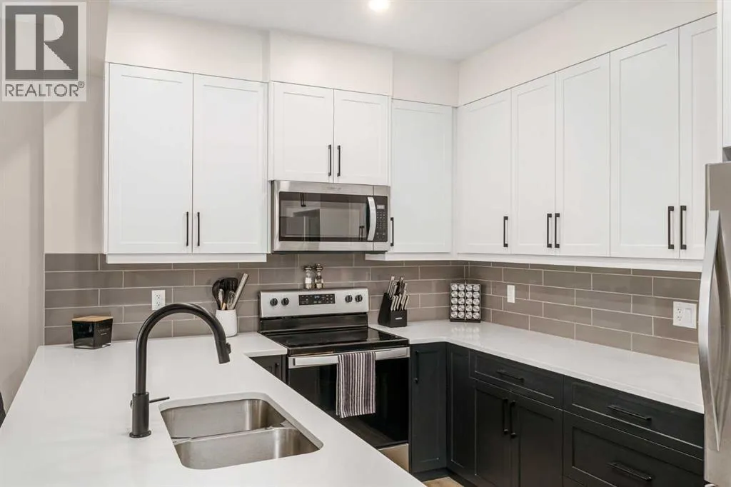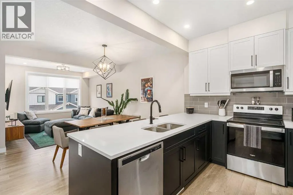 Welcome to this beautifully upgraded, move-in-ready townhome in the sought-after community of Crestmont, where modern comfort meets that âescape-to-the-mountainsâ lifestyle, right here in the city. Surrounded by tranquil pathways, sweeping mountain views, and easy access to nature, this home is ideal for anyone who wants a stylish space with a warm, welcoming feel. Step inside to a bright, open-concept main floor designed for everyday living and easy entertaining. The living room and dining area offer ample space to host, relax, and gatherâflooded with natural light thanks to west-facing windows that create a warm, inviting feel throughout the afternoon and evening. Durable vinyl plank flooring flows through the space, complemented by contemporary fixtures and a crisp, elevated finish. The kitchen is a standout with full-height cabinetry, quartz countertops, and a generous breakfast barâperfect for morning coffee, quick meals, or gathering with friends while you cook. Just off the kitchen and main living area, youâll find a feature wall that truly sets the tone: a beautifully finished bar area with rich wood detailing that brings a âWhistler-inspiredâ vibe homeâequal parts cozy, refined, and made for hosting. Upstairs, the layout continues to impress with two well-proportioned bedrooms and smart storage throughout. The spacious primary retreat features a large pass-through closet complete with custom built-ins and an upgraded ensuite with a sleek walk-in showerâclean lines, modern finishes, and a spa-like feel. The second bedroom and additional full bathroom offer flexibility for guests, kids, or a dedicated home office. Outside, enjoy the covered balcony with a BBQ gas lineâready for year-round grilling, morning sun, or a quiet evening unwind. Youâll also appreciate central air conditioning for summer comfort. The oversized double tandem garage provides impressive versatility, with space for two vehicles, bikes, seasonal gear, or even a future workshop setup, plus extra storage in the utility room and convenient foyer area for day-to-day organization. Crestmont is loved for its peaceful, nature-forward settingâpathways, off-leash areas, and that âweekend getawayâ feelingâwhile still keeping you close to everything. Youâre minutes to Winsport, Calgary Farmersâ Market West, great local shops and restaurants, and youâll love the quick access to downtown Calgary or an easy escape west to the Rockies. This is the kind of home that checks the boxes for lifestyle, design, and practicalityâwithout compromise. (id:27476)